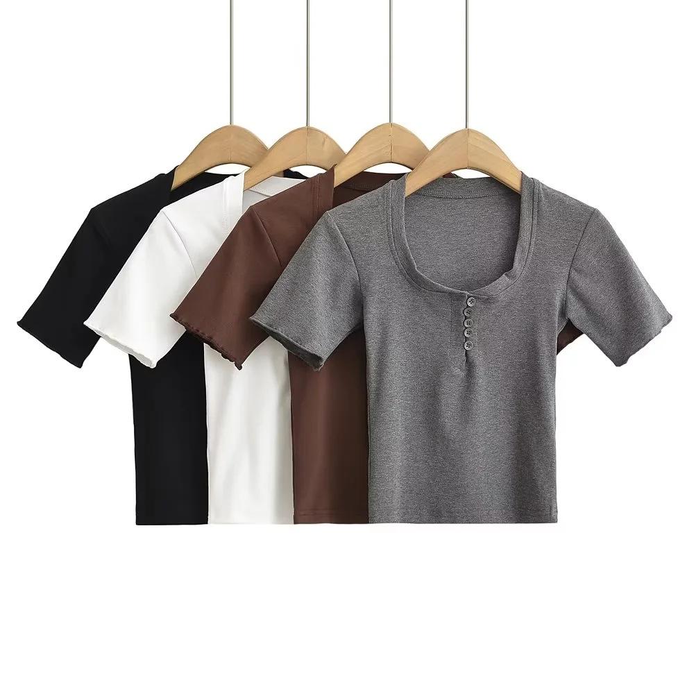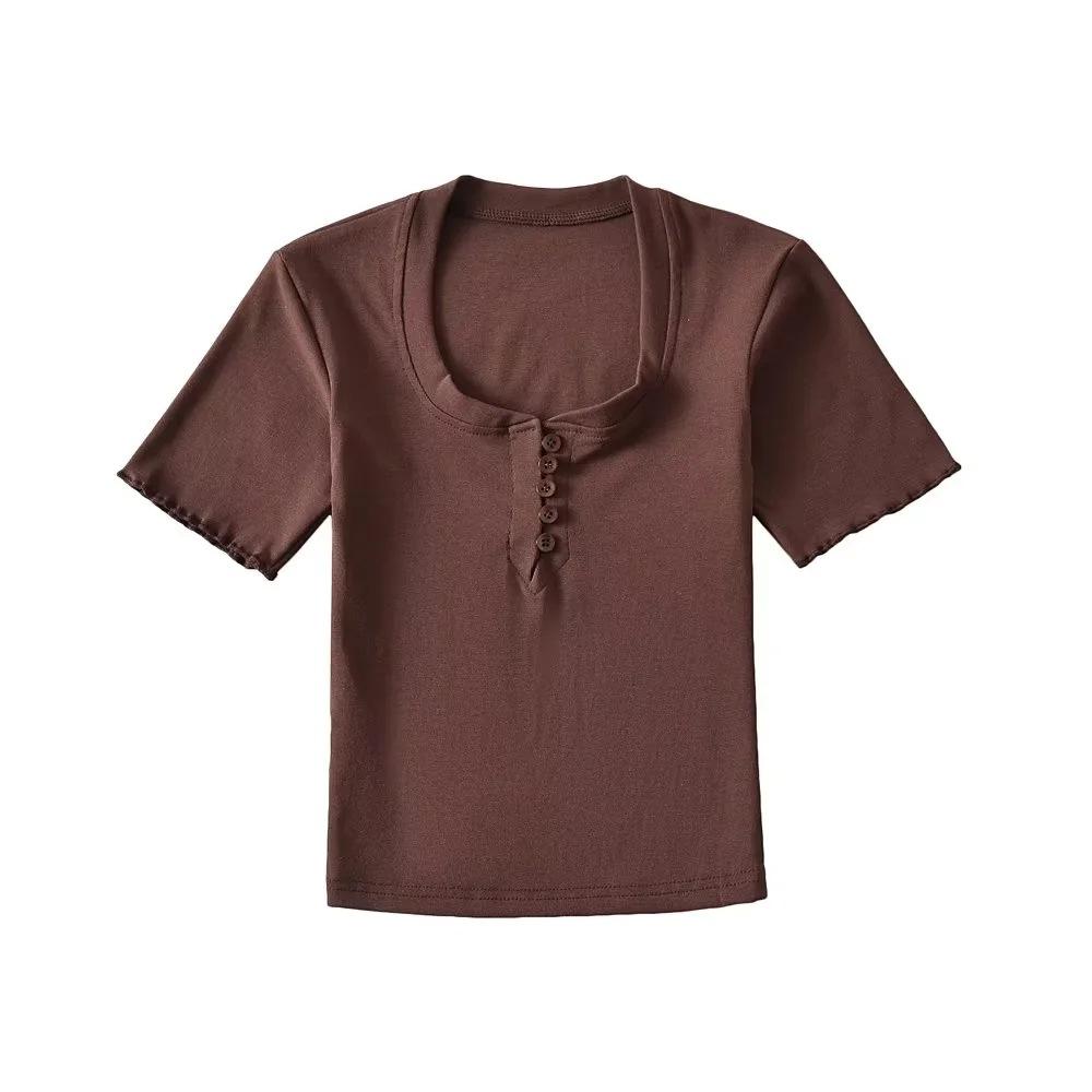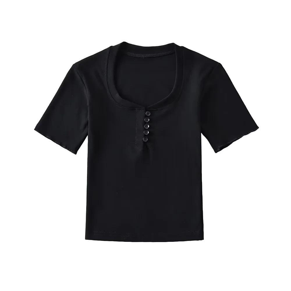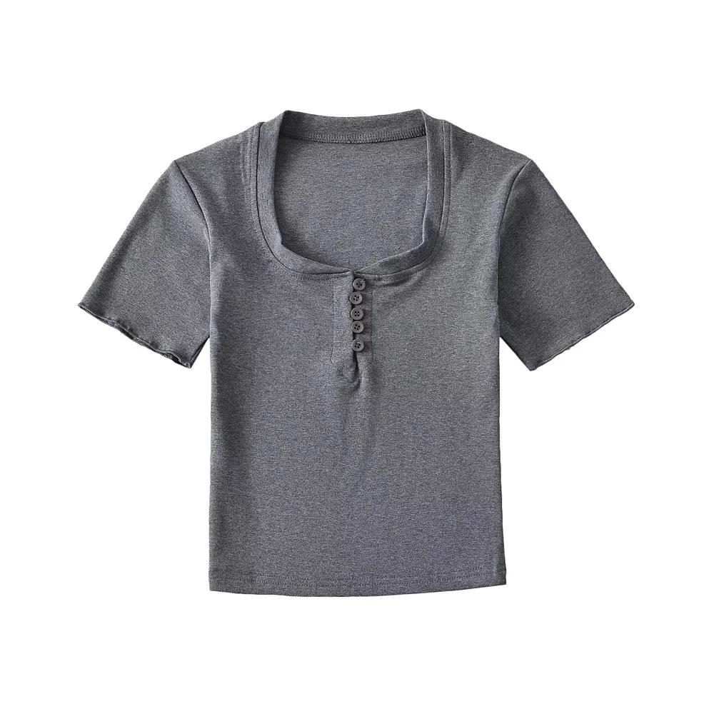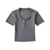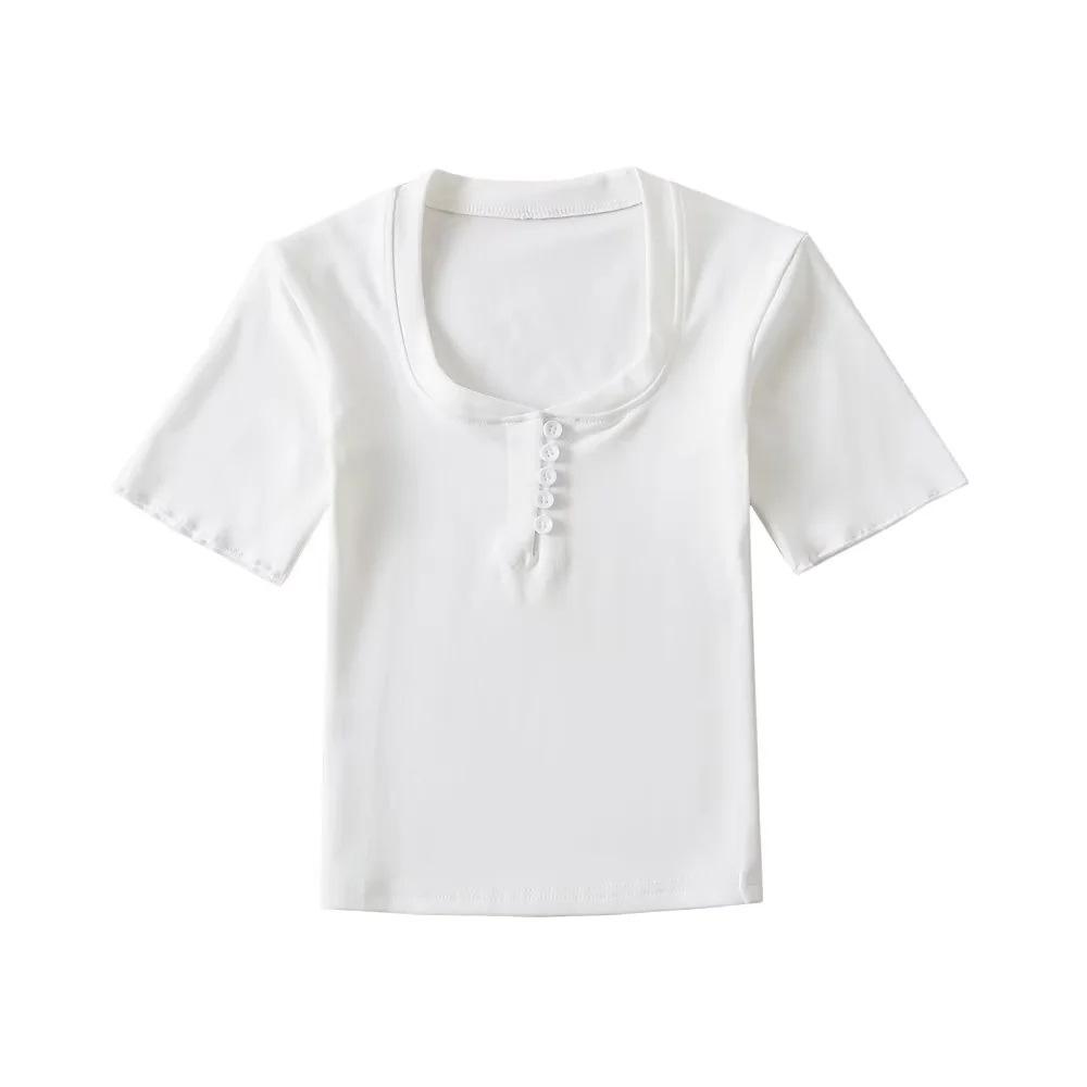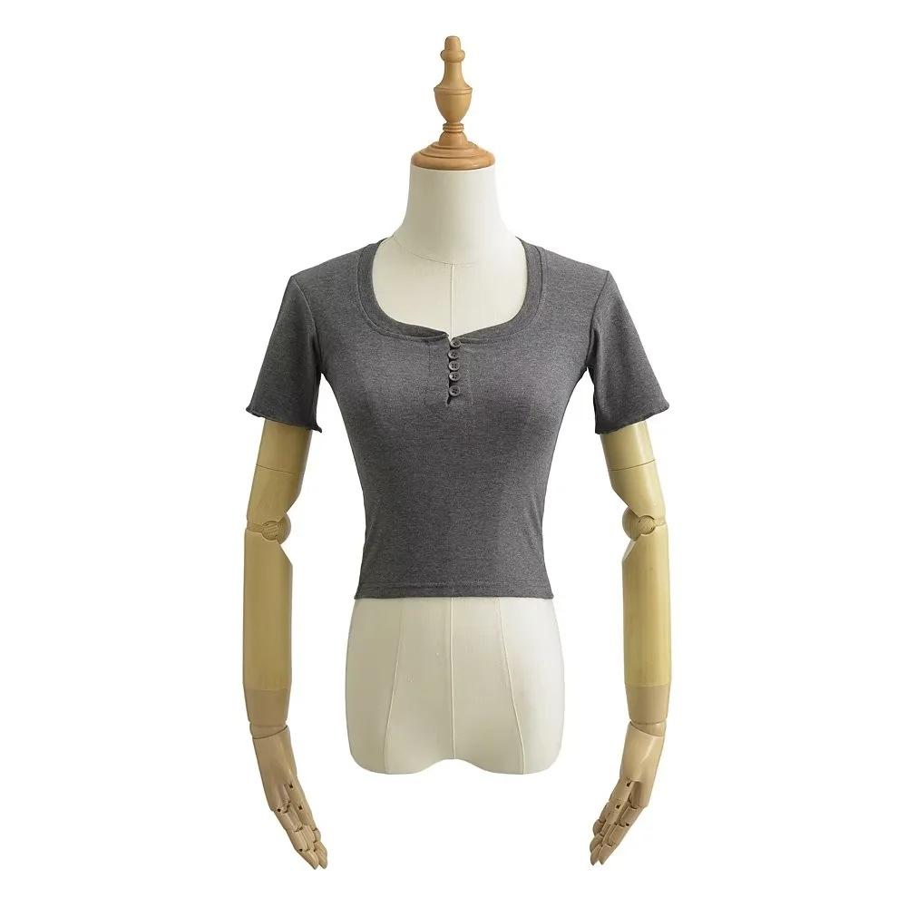 Playera de Manga Corta con Cuello Cuadrado y Cinco Botones para Mujer, Verano 2023, Sexy, Ajustada, Cintura Alta, Top Corto