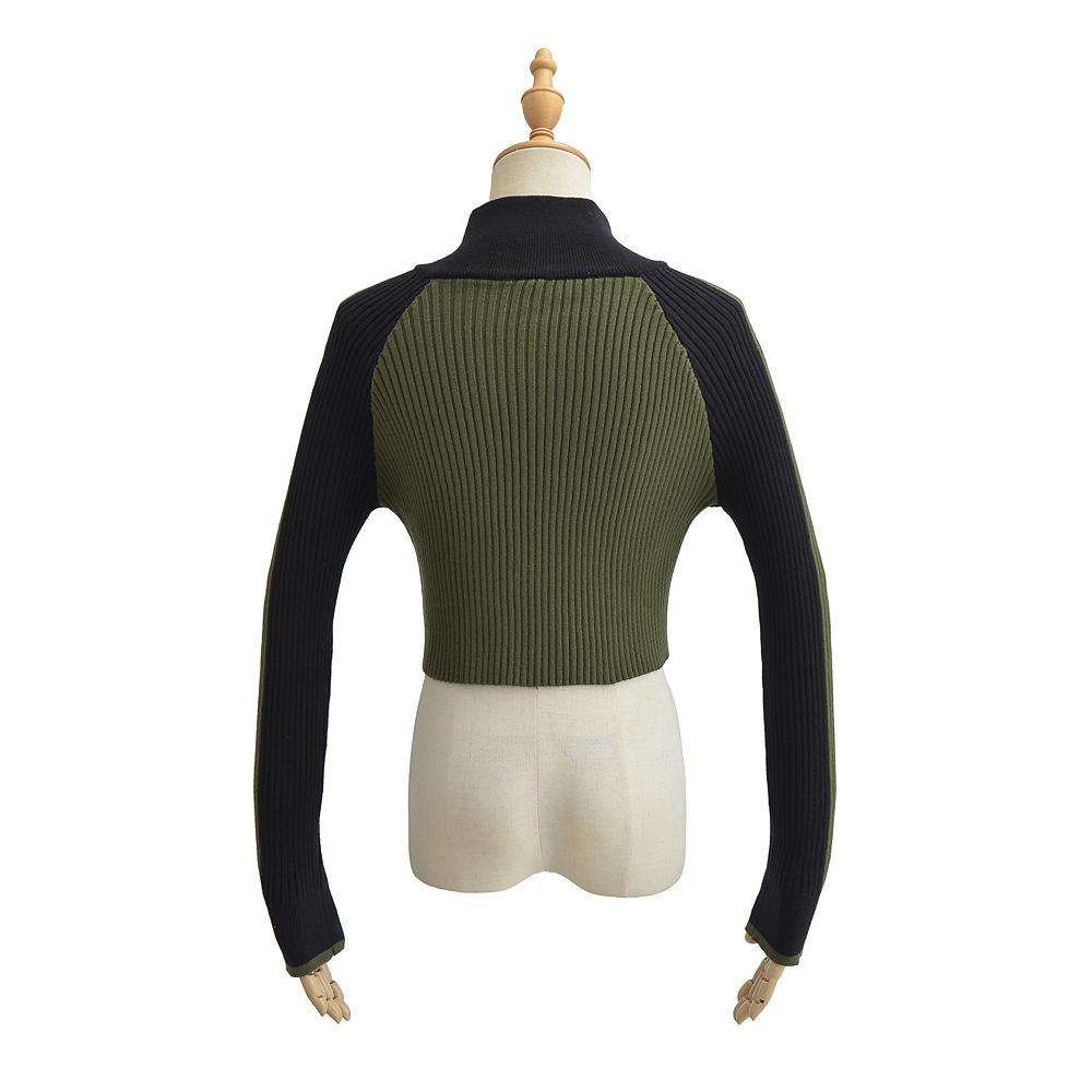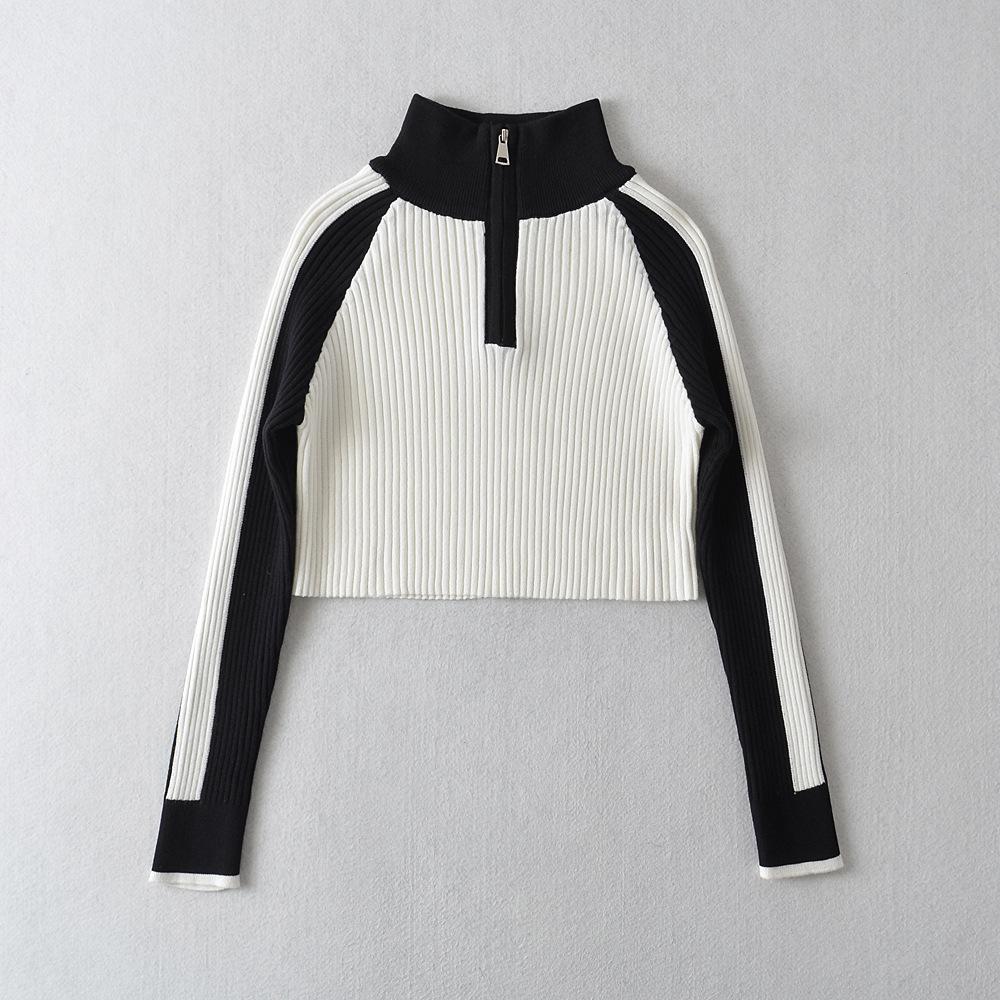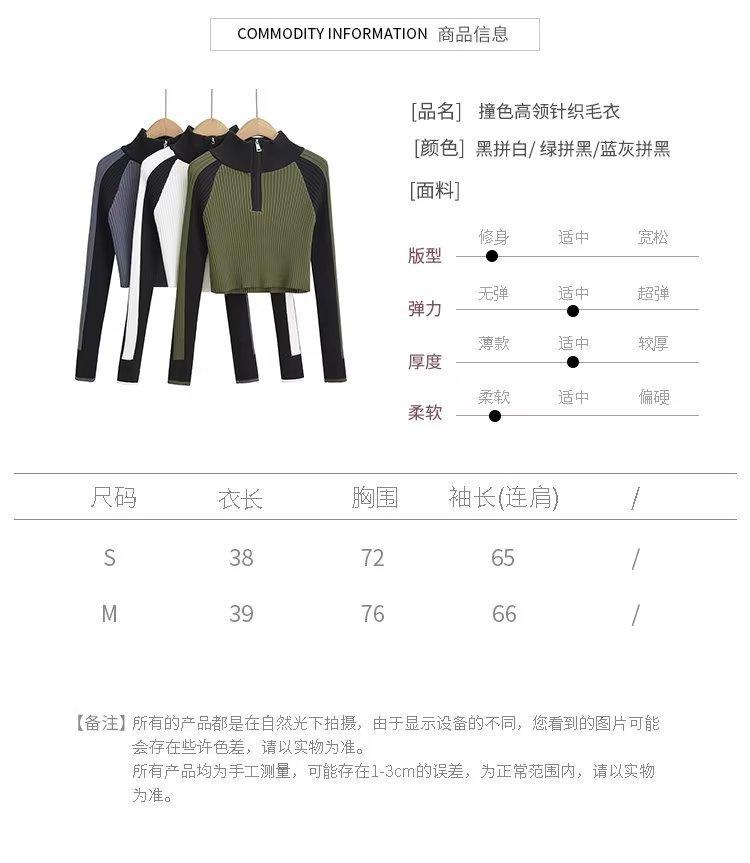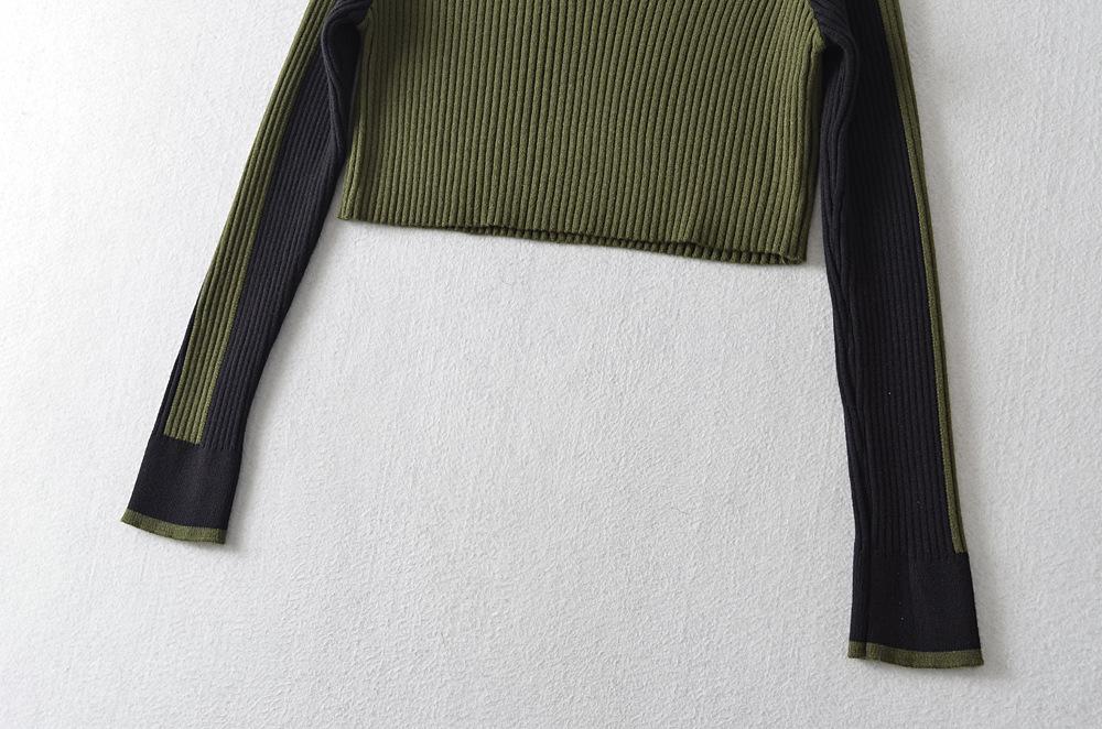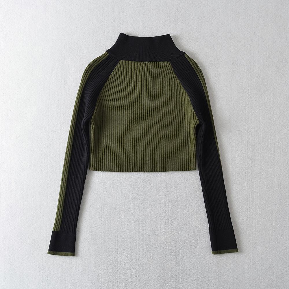 Suéter de cuello alto con costuras de color en contraste de estilo europeo y americano para otoño e invierno de 2023, camisa retro de manga larga con parte inferior corta para mujer
