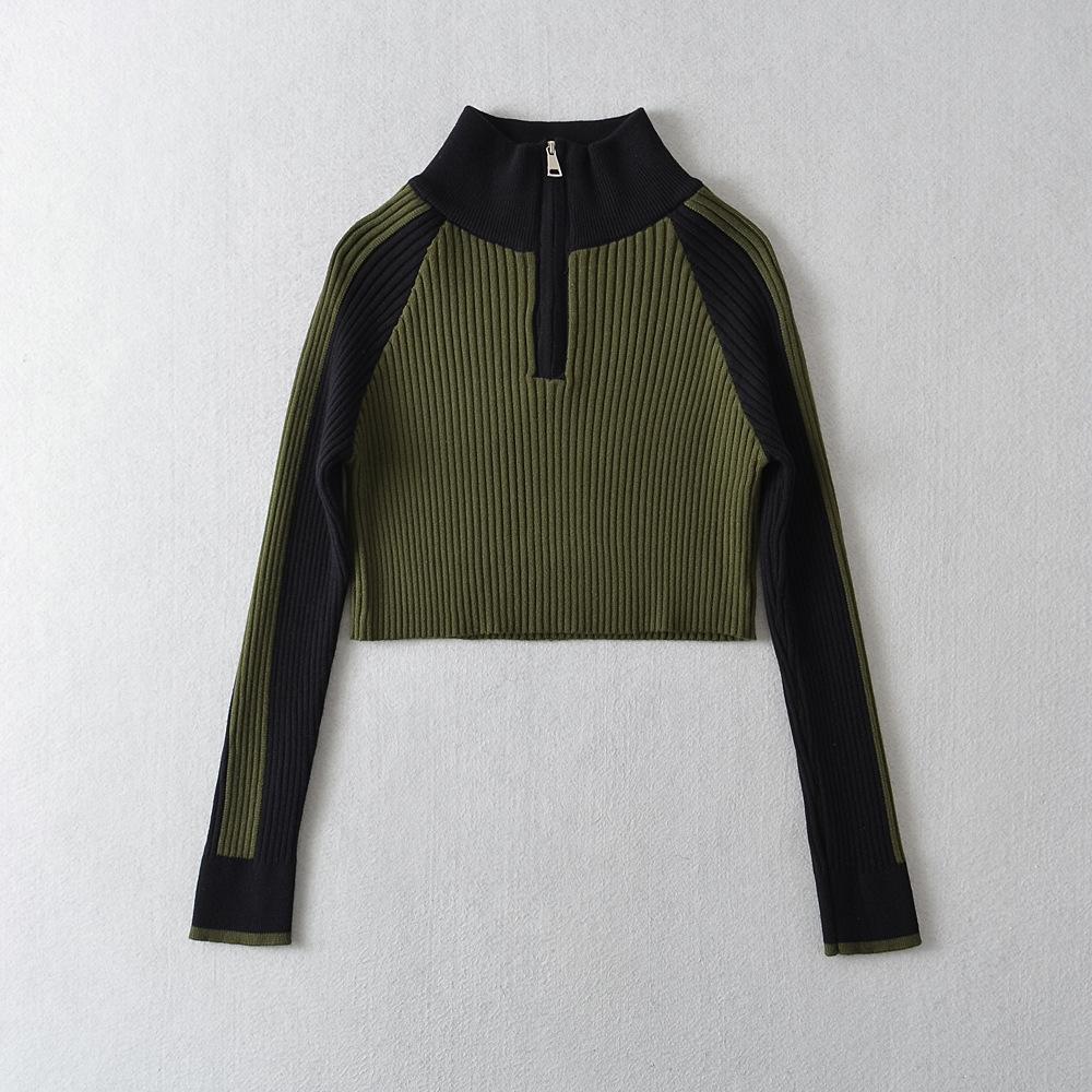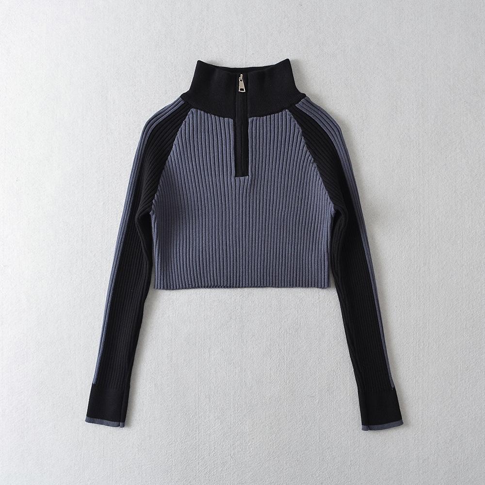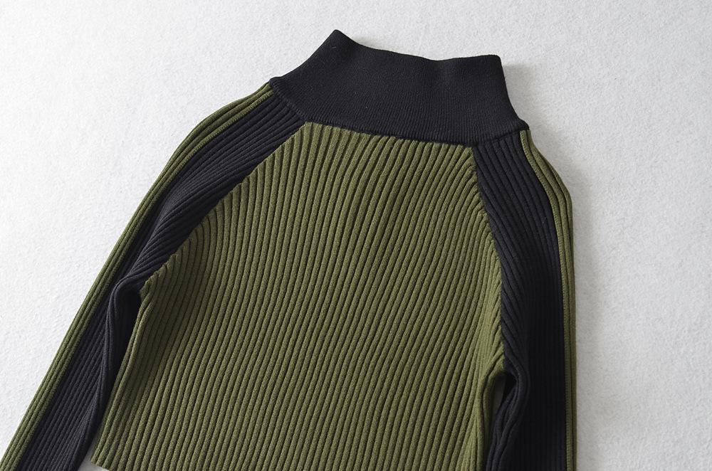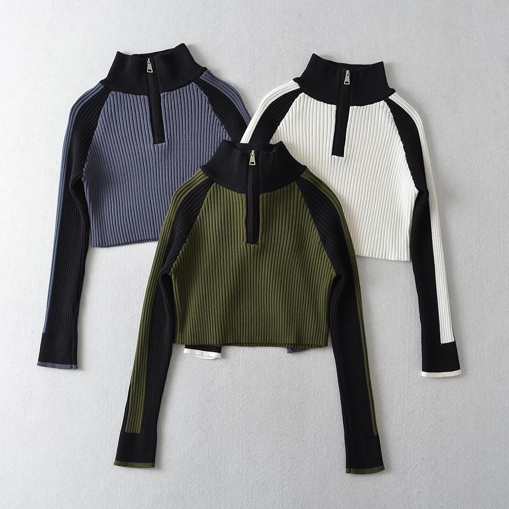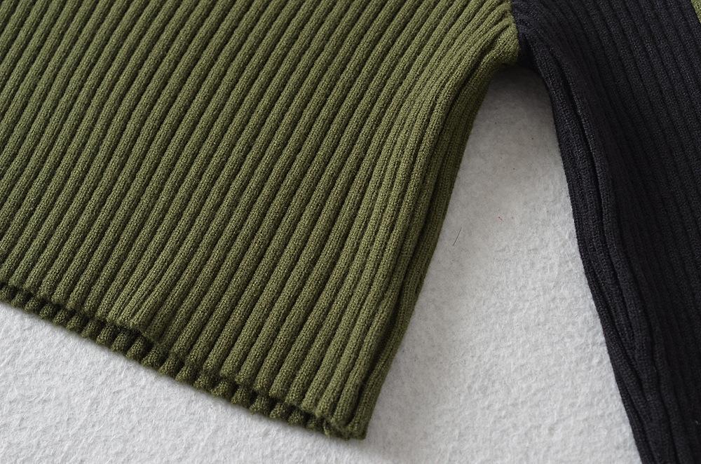 Suéter de cuello alto con costuras de color en contraste de estilo europeo y americano para otoño e invierno de 2023, camisa retro de manga larga con parte inferior corta para mujer