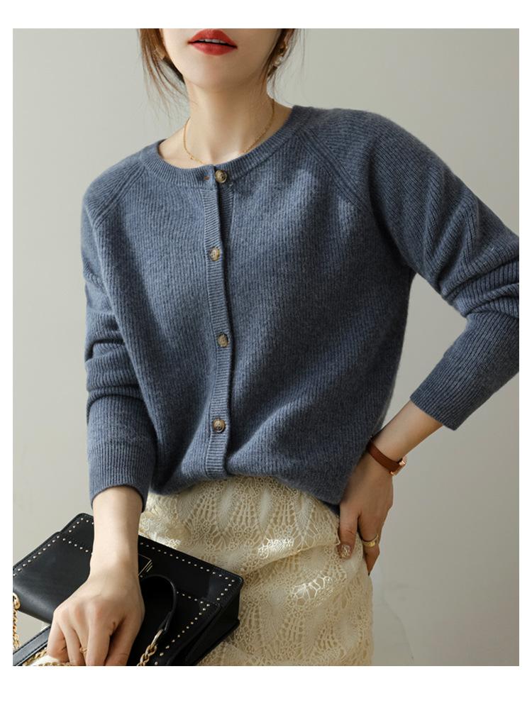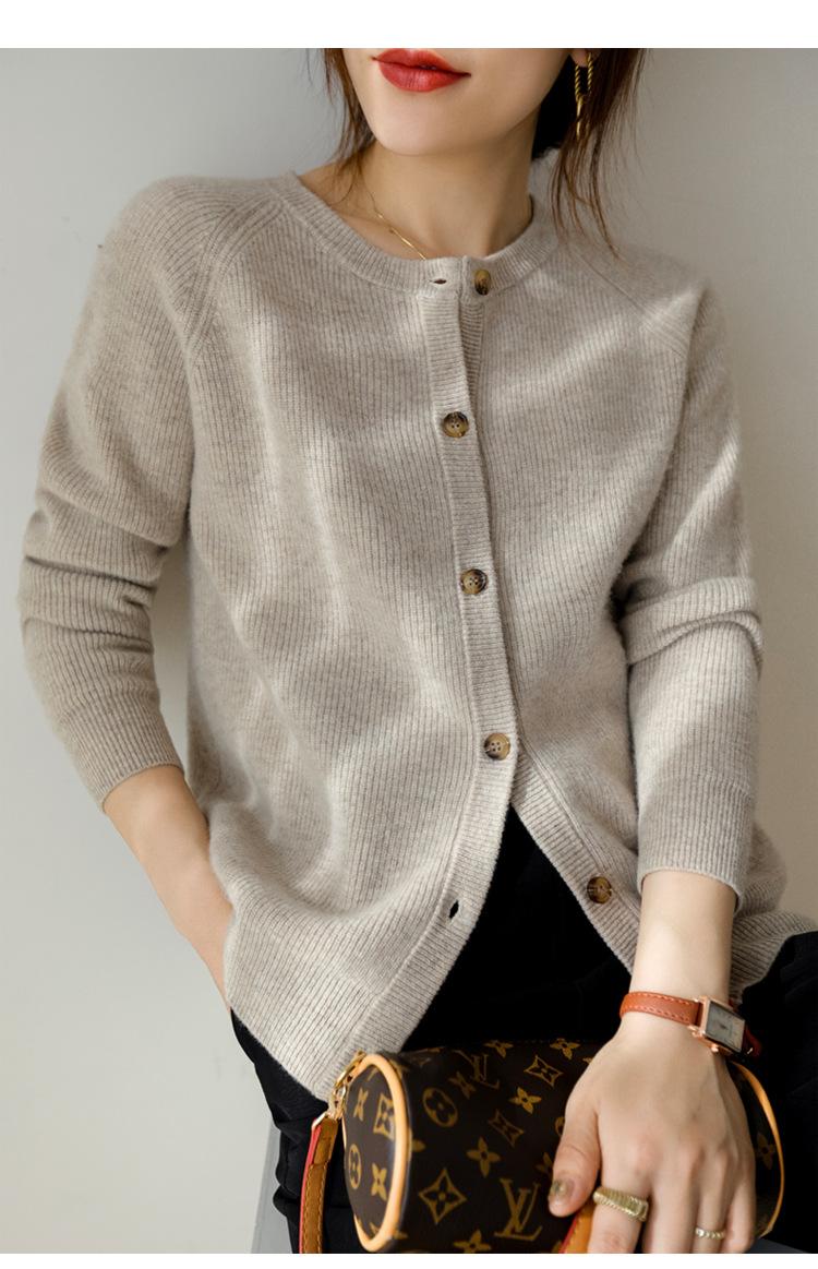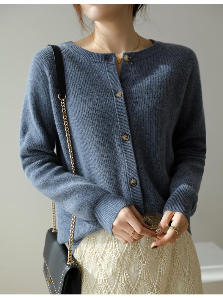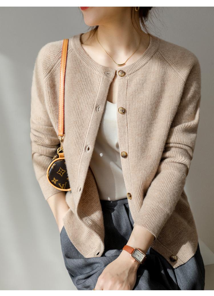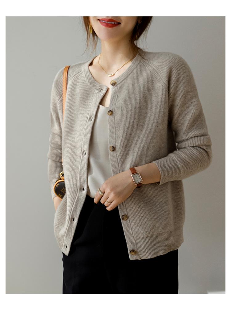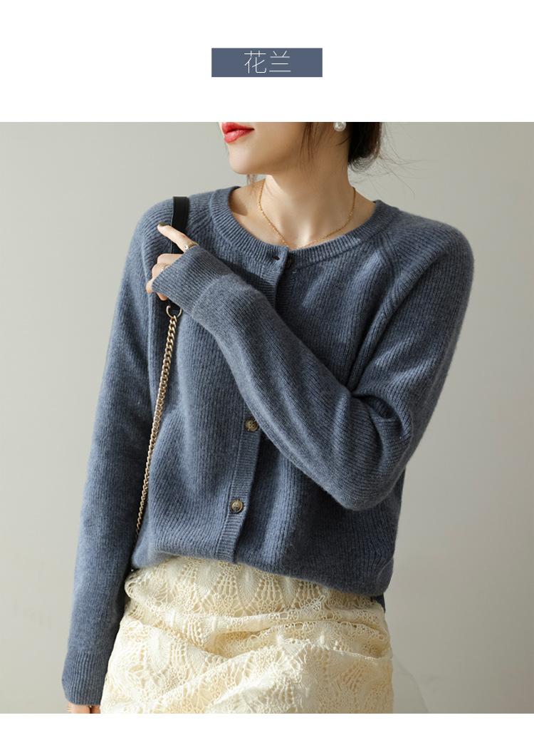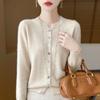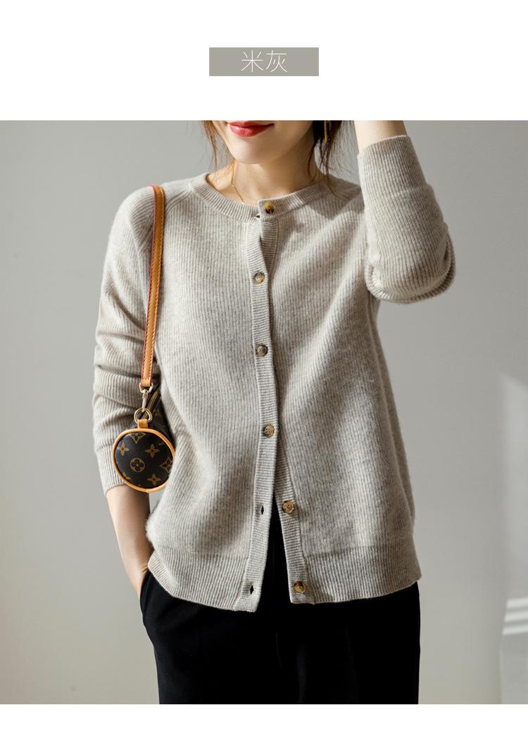 100% Lana Otoño e Invierno 2025 Nuevo Estilo para Mujer Transpirable Suelto Cuello Redondo Corto Cárdigan de Punto Sencillo y Atmosférico