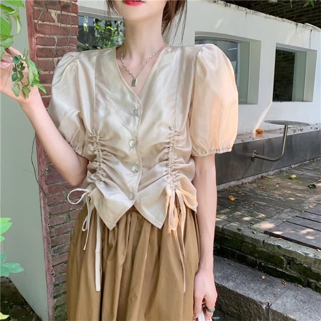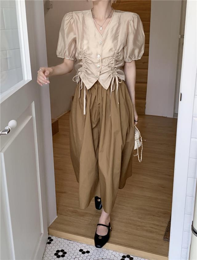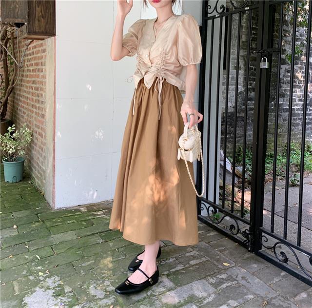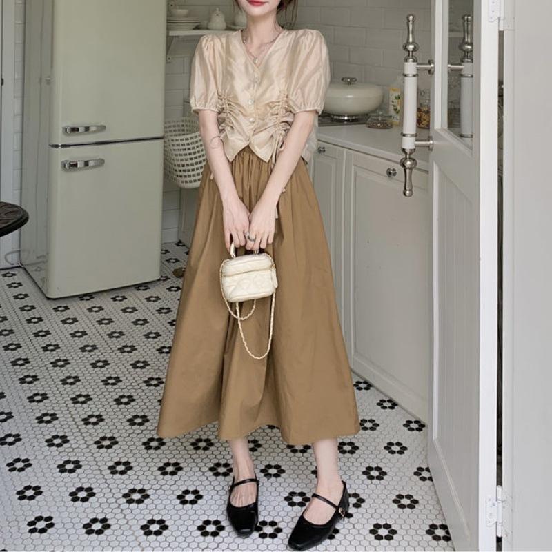 Diseño Sense Nicho Verano Único Elegante Gama Alta Camisa Manga Abullonada + Falda Moda Color Puro Traje de Dos Piezas