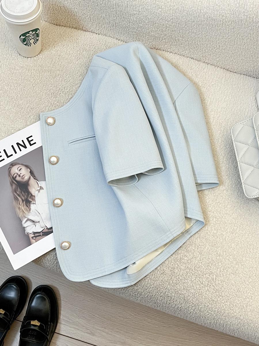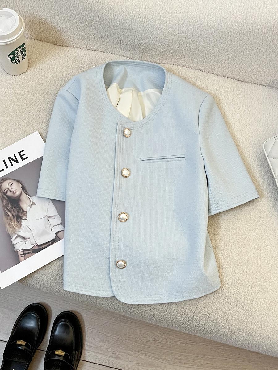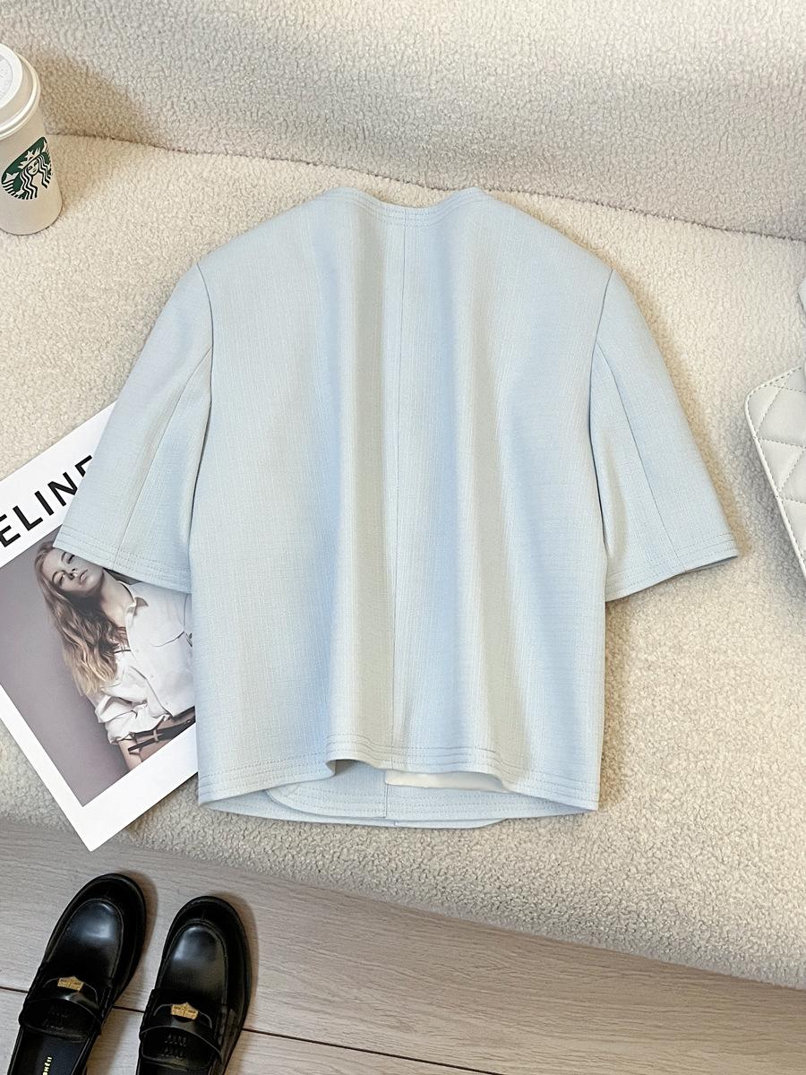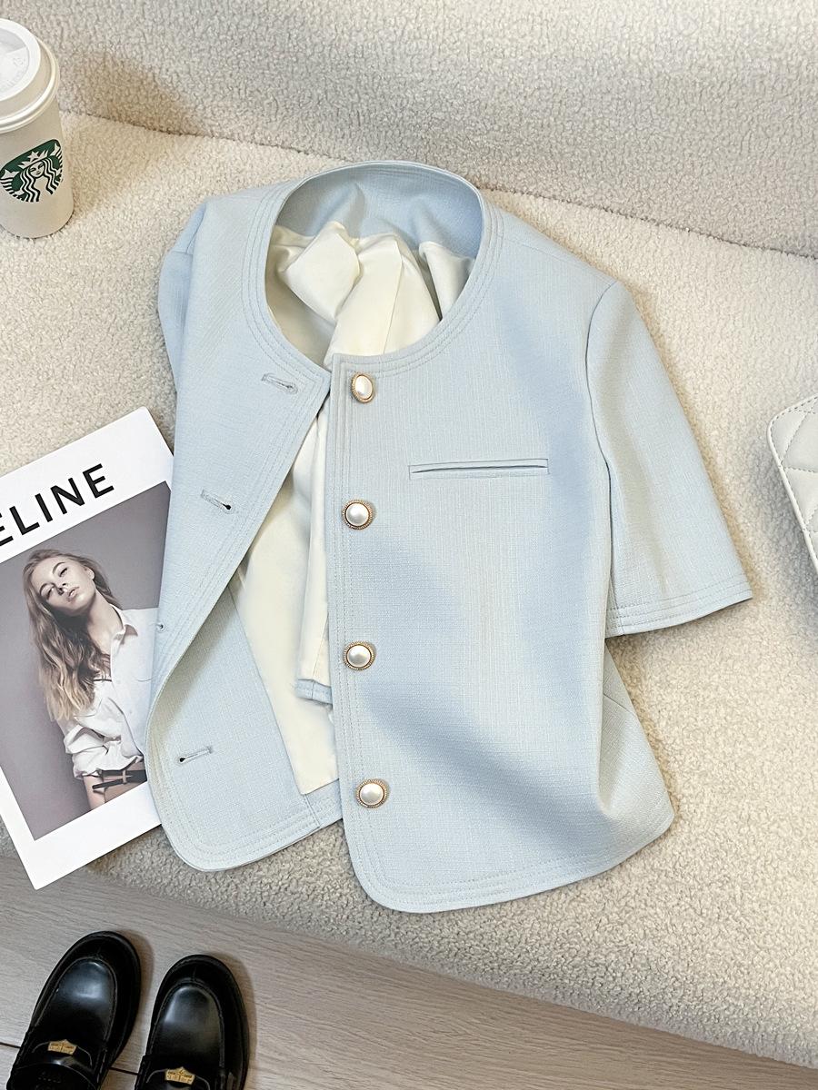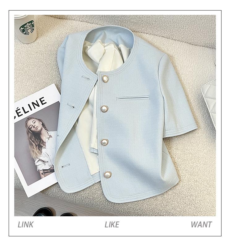Chaqueta de Traje Azul Cielo Pequeña Fragante de Manga Corta para Mujer 2025 Verano Nuevo Estilo Dama Elegante Top Francés de Alta Gama
