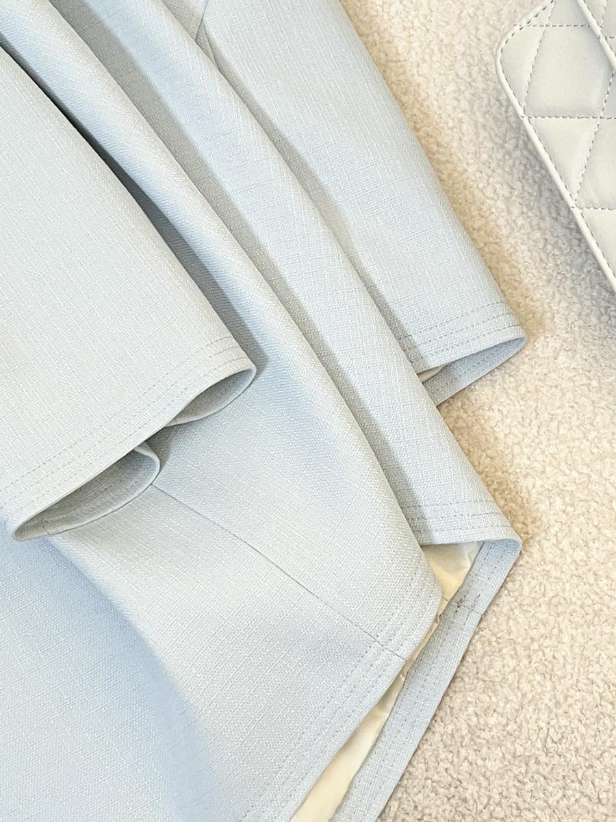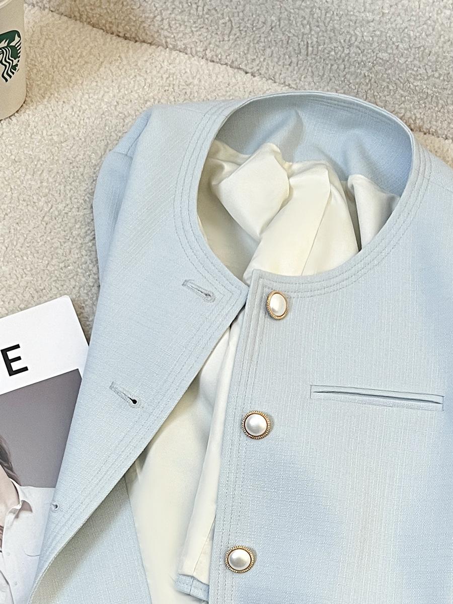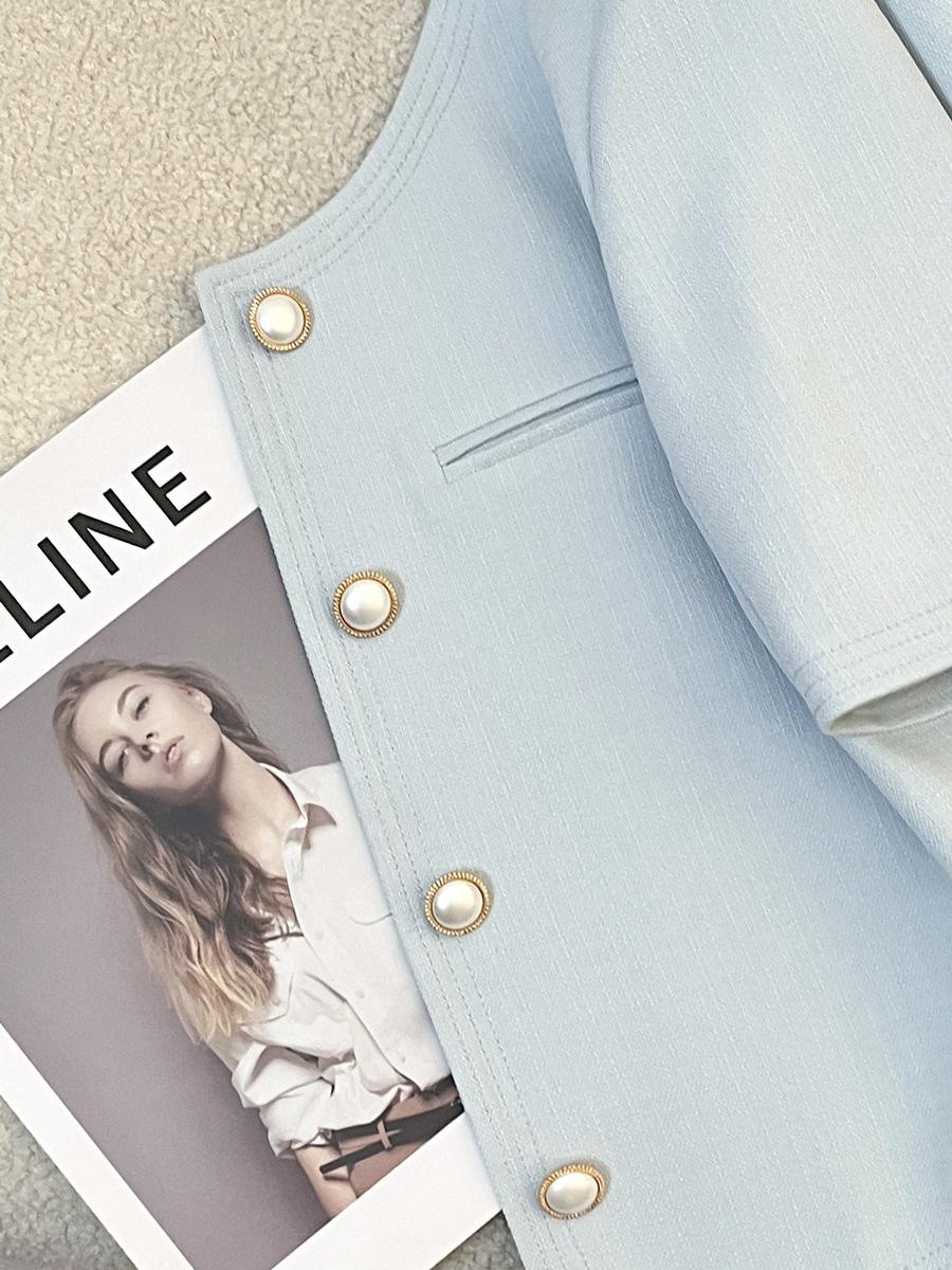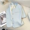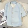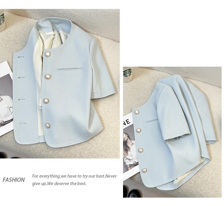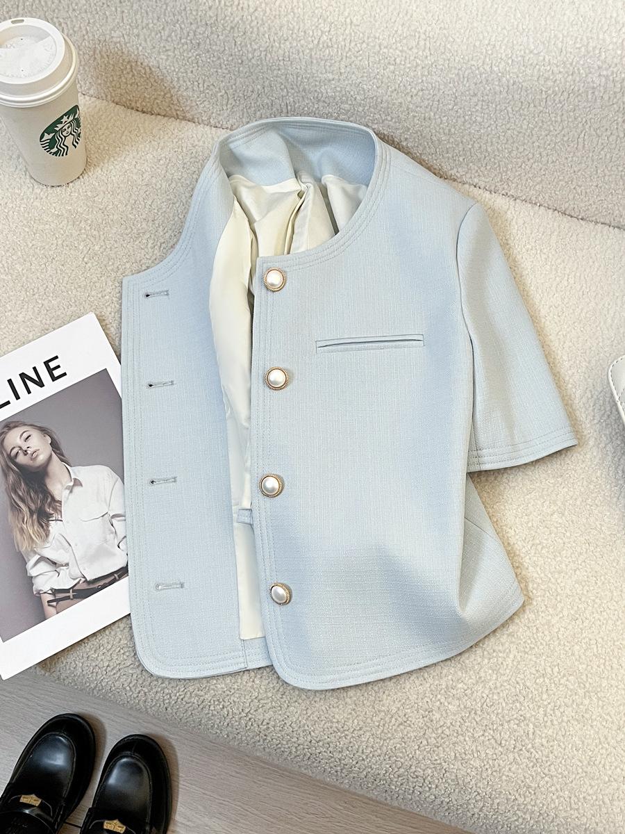 Chaqueta de Traje Azul Cielo Pequeña Fragante de Manga Corta para Mujer 2025 Verano Nuevo Estilo Dama Elegante Top Francés de Alta Gama