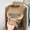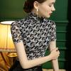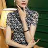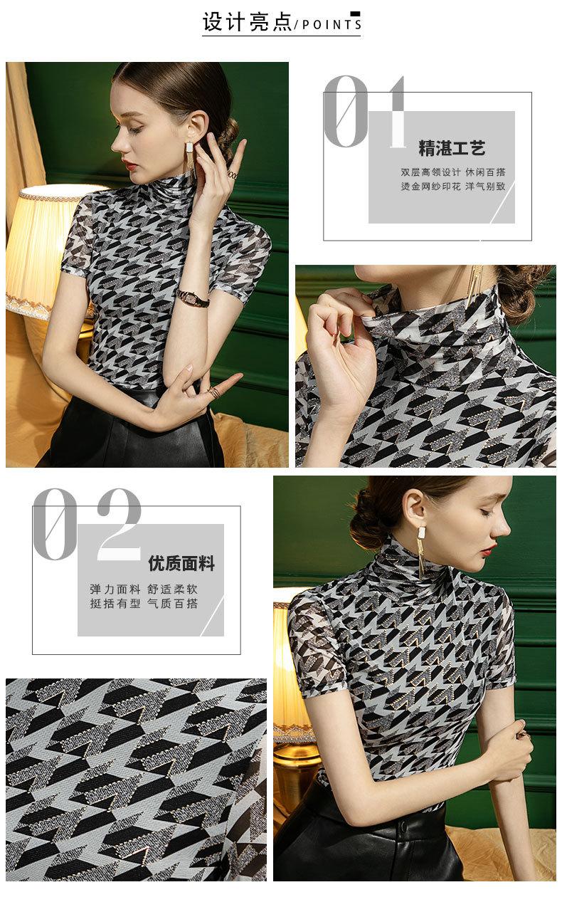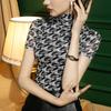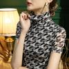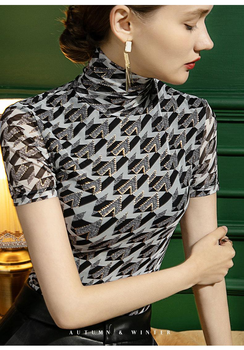 Camisa de malla con cuello alto para mujer, blusa elegante de manga corta con forro y cuadros color bronce para otoño