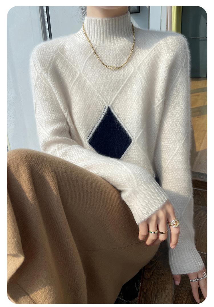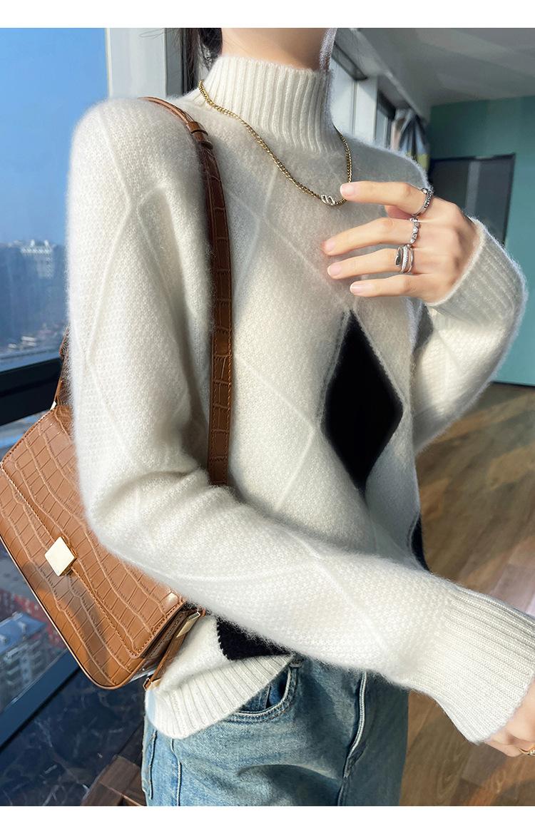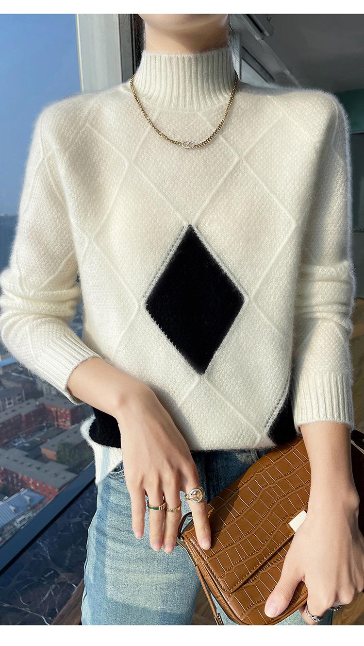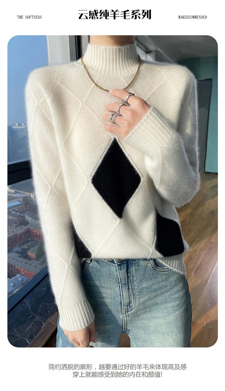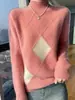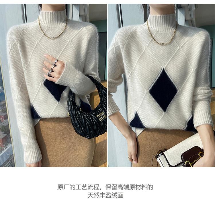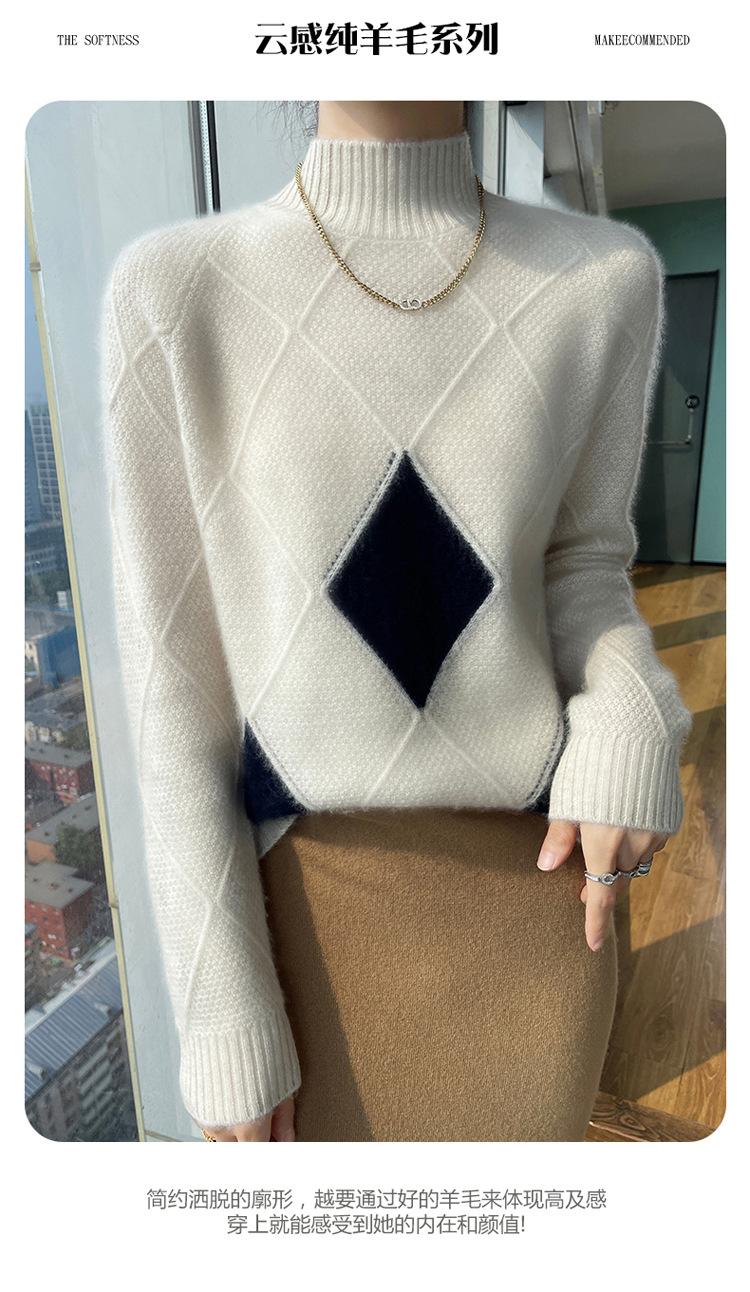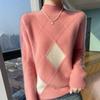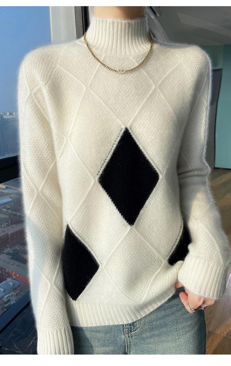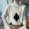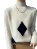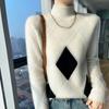 Suéter de Lana 100% Pura para Mujer de Otoño e Invierno 2024, Cuello Alto Medio, Combinación de Colores, Jacquard de Diamantes, Suéter Tejido Base