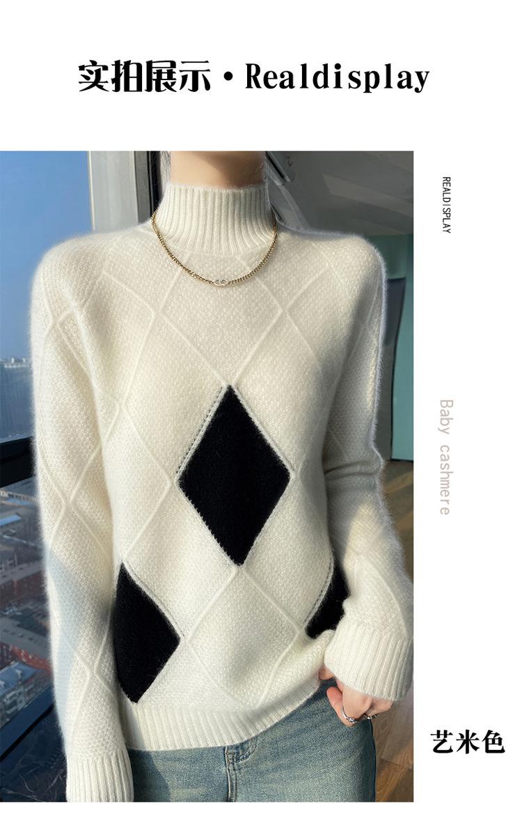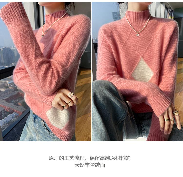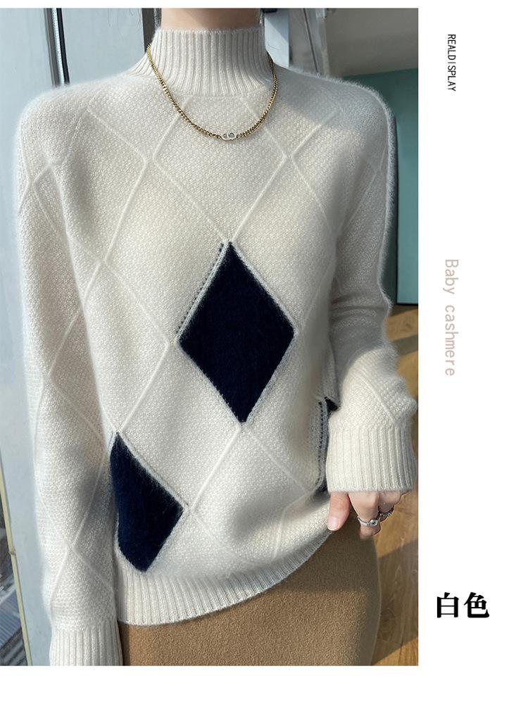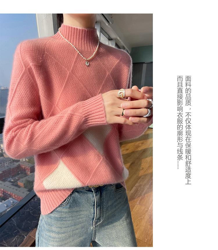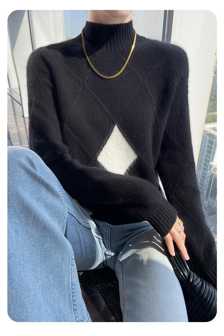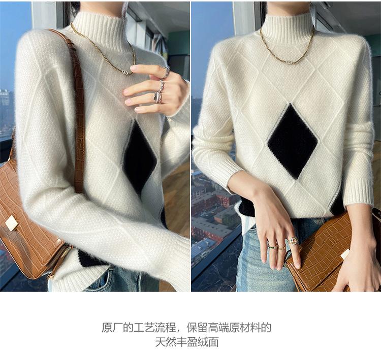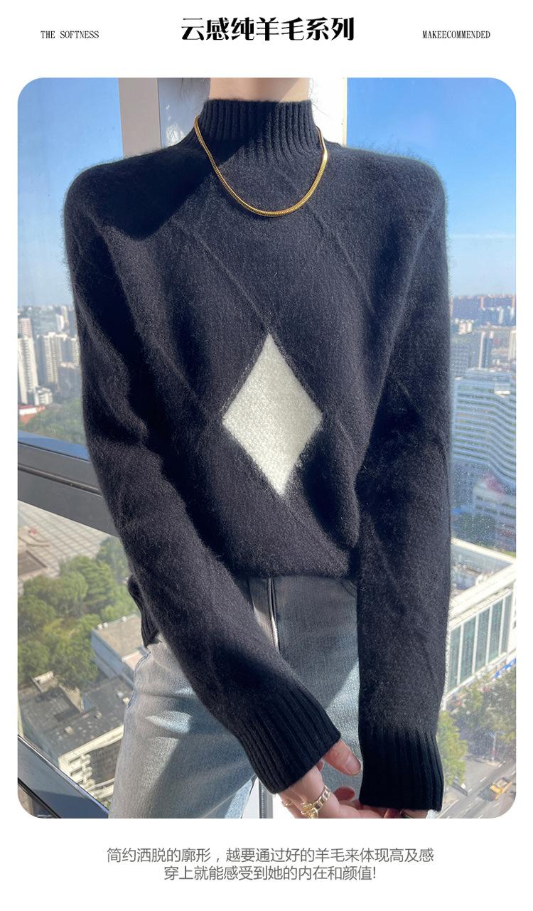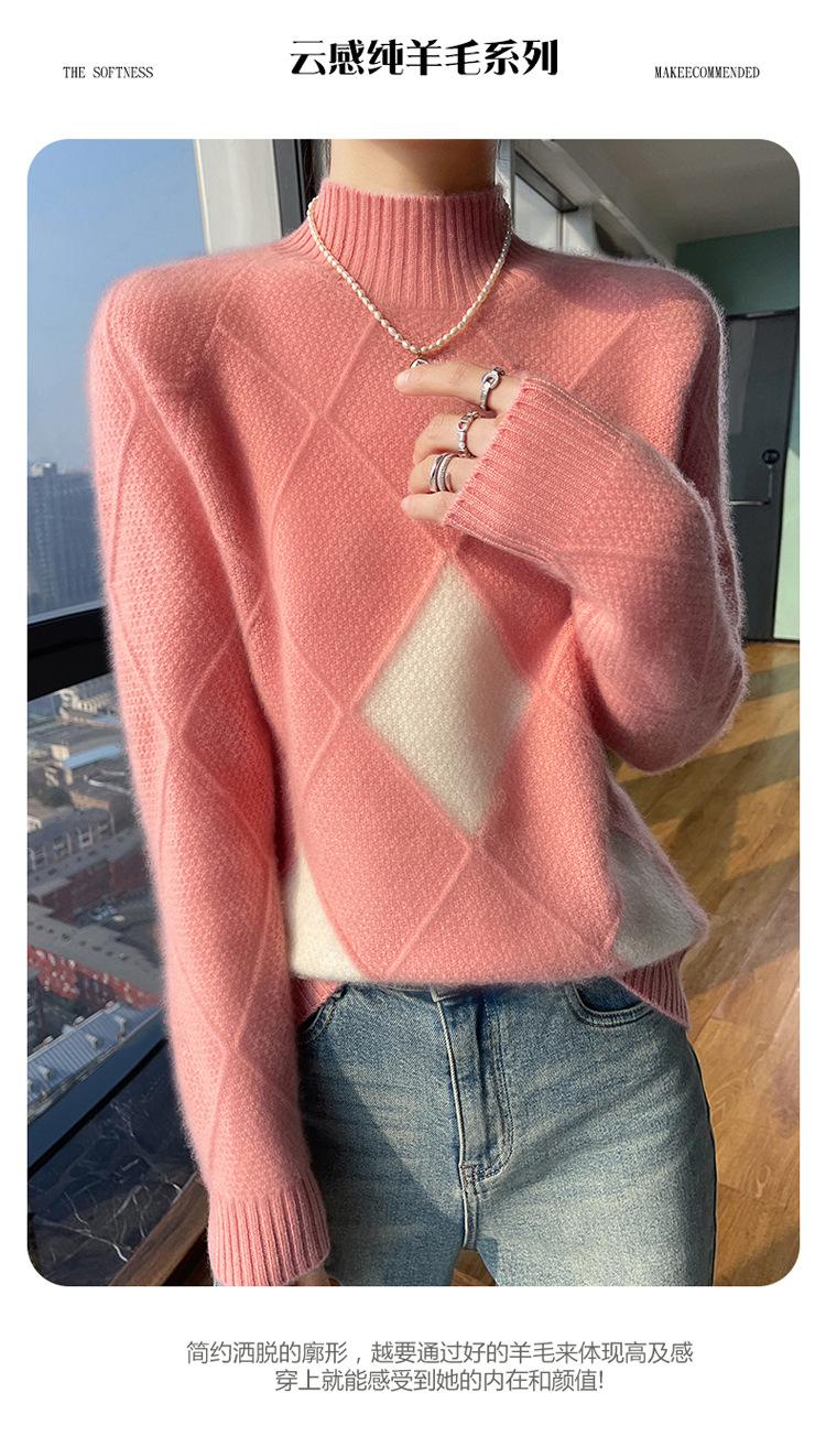Suéter de Lana 100% Pura para Mujer de Otoño e Invierno 2024, Cuello Alto Medio, Combinación de Colores, Jacquard de Diamantes, Suéter Tejido Base