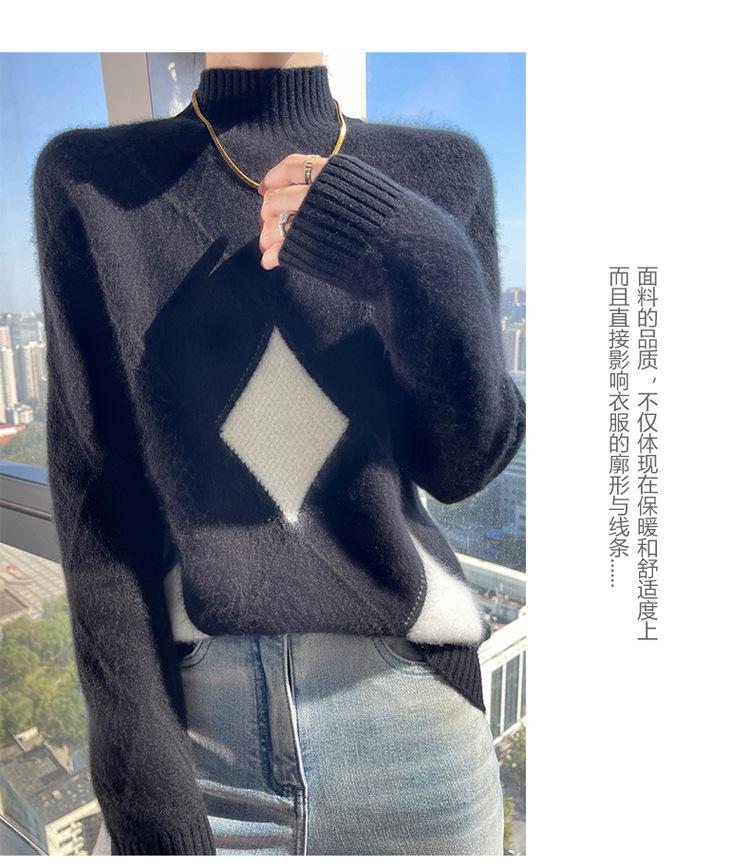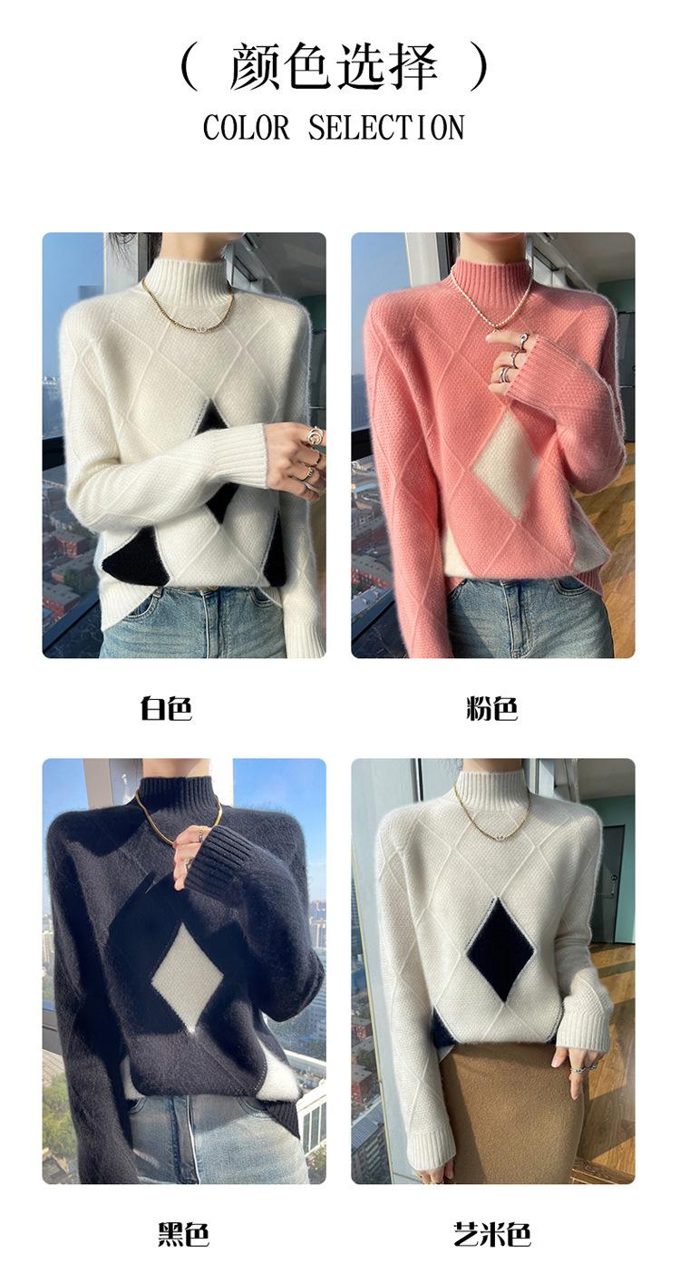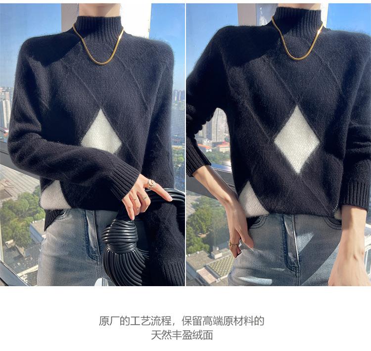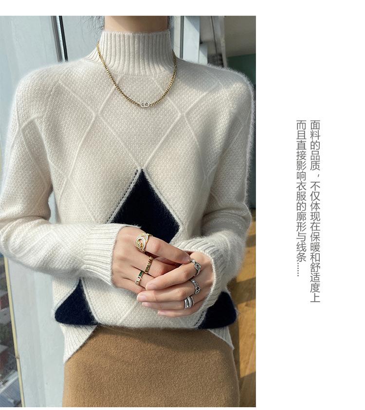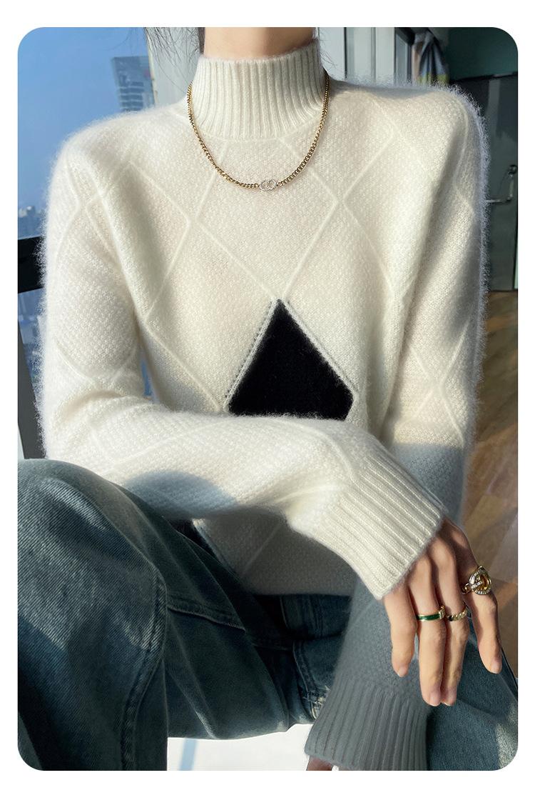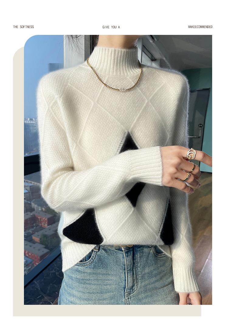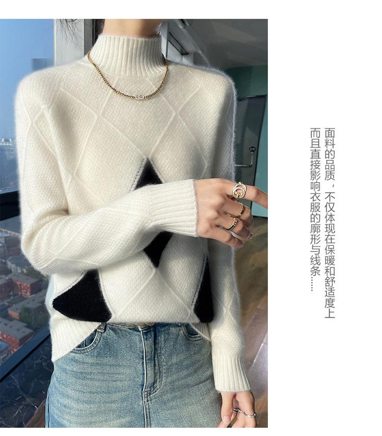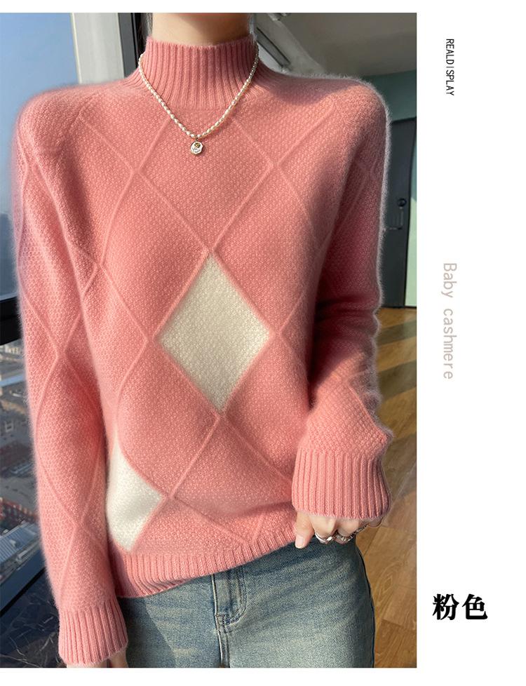 Suéter de Lana 100% Pura para Mujer de Otoño e Invierno 2024, Cuello Alto Medio, Combinación de Colores, Jacquard de Diamantes, Suéter Tejido Base