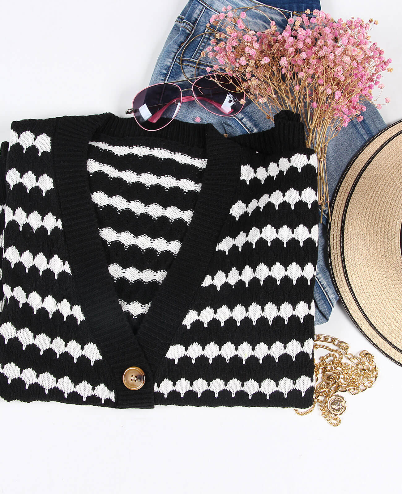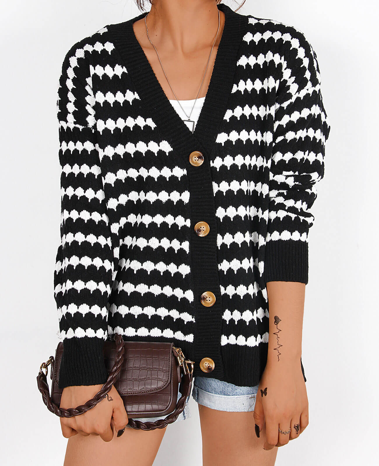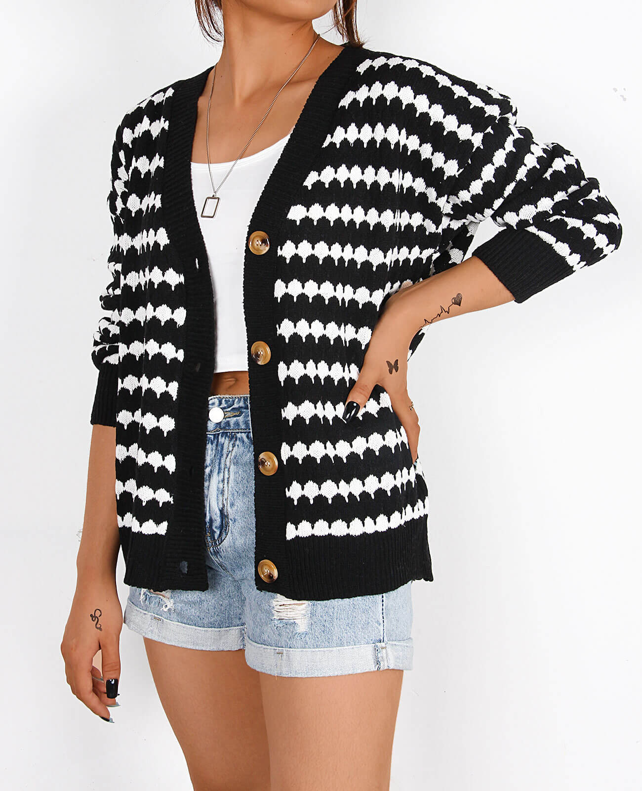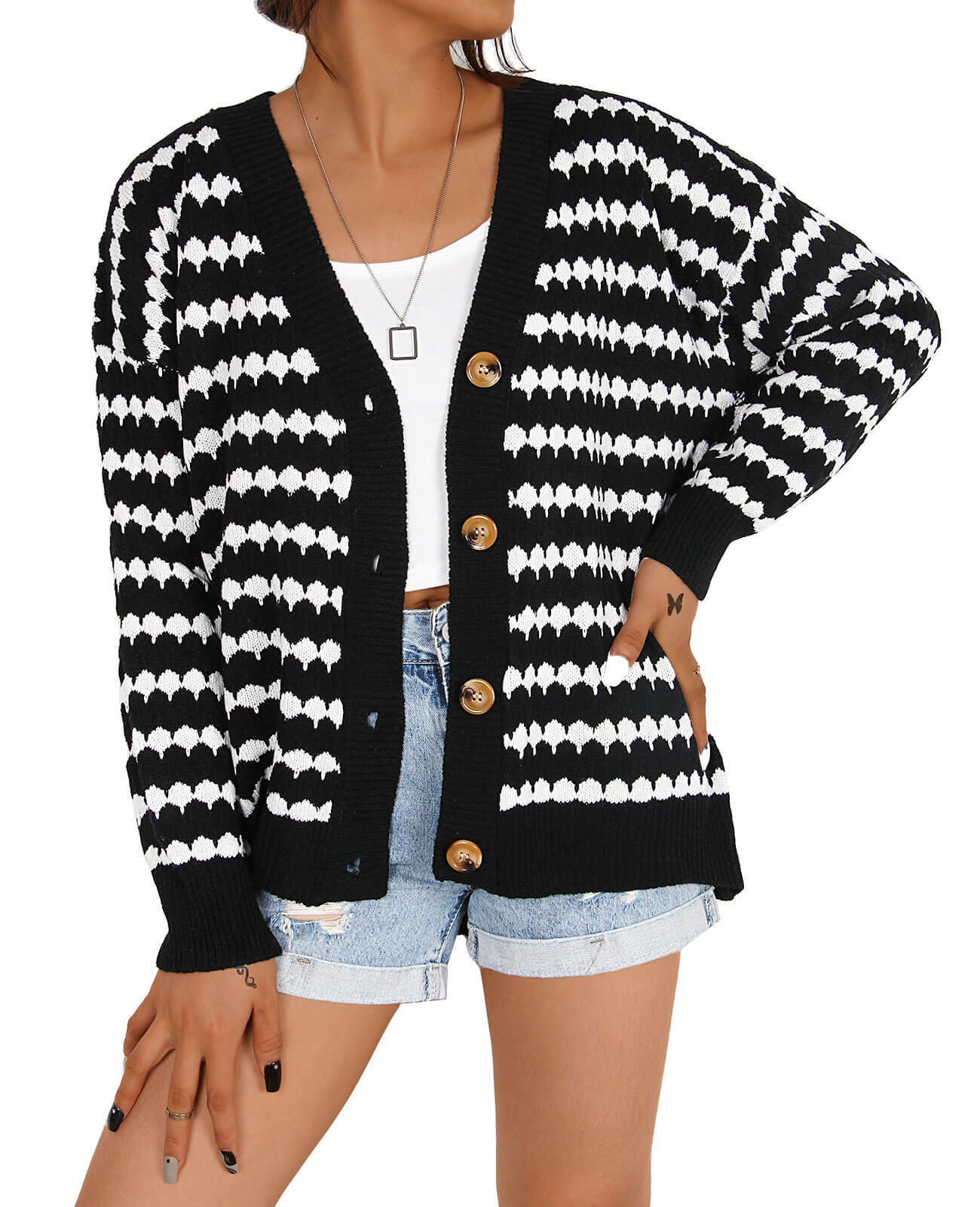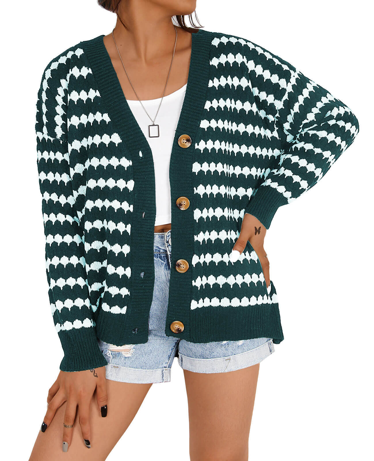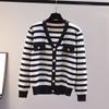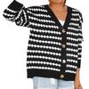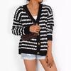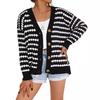 Otoño Nuevo Estilo Europeo y Americano Chaqueta Holgada de Moda para Mujer Cuello en V Rayado Bloque de Color Cárdigan Suéter de Un Solo Botón Top