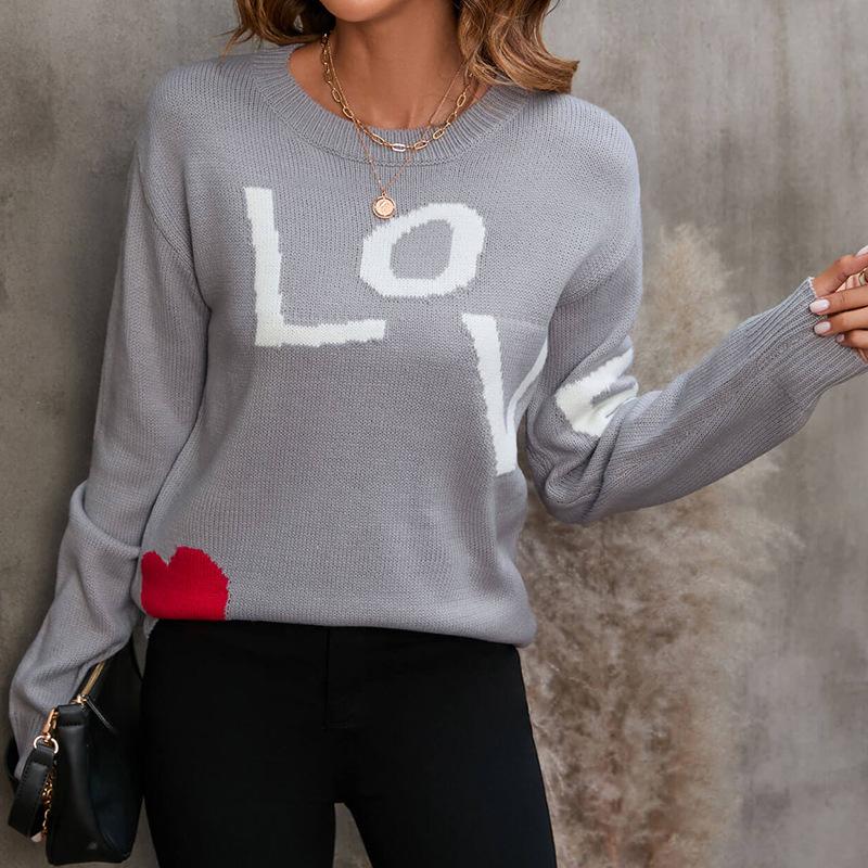 Nuevo suéter de punto con cuello redondo y letras de corazón suelto transfronterizo de Amazon para otoño e invierno, suéter de manga larga europeo y americano para mujer