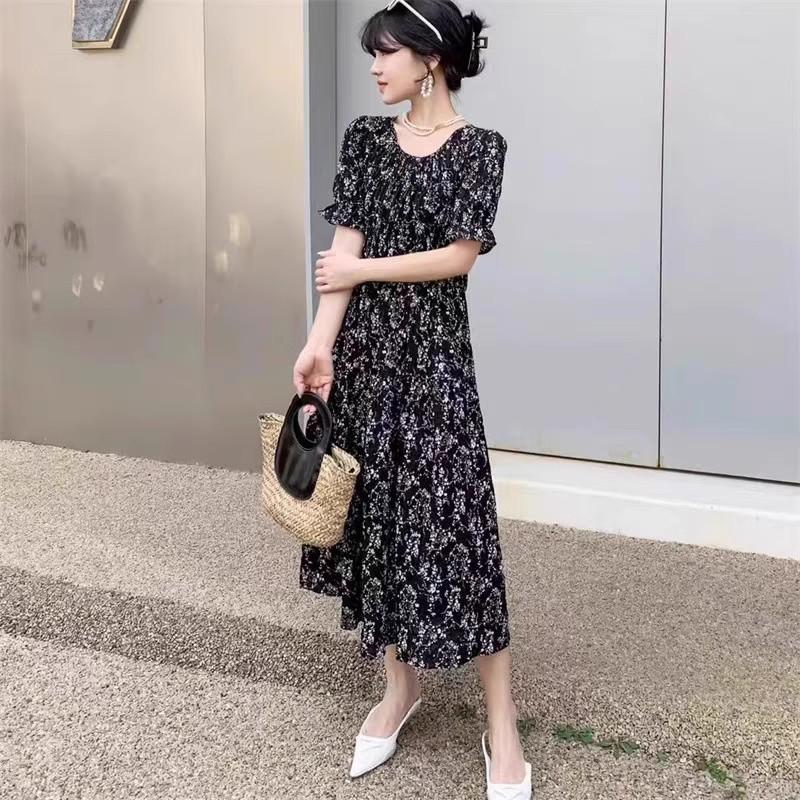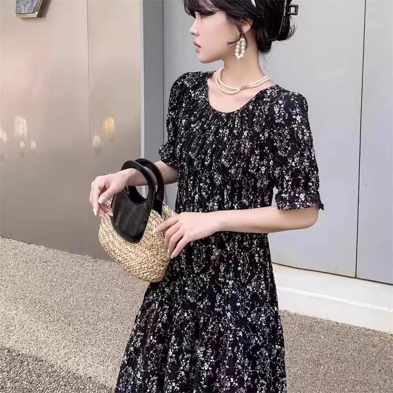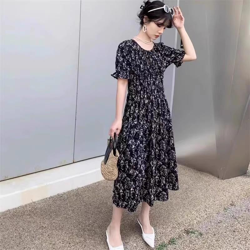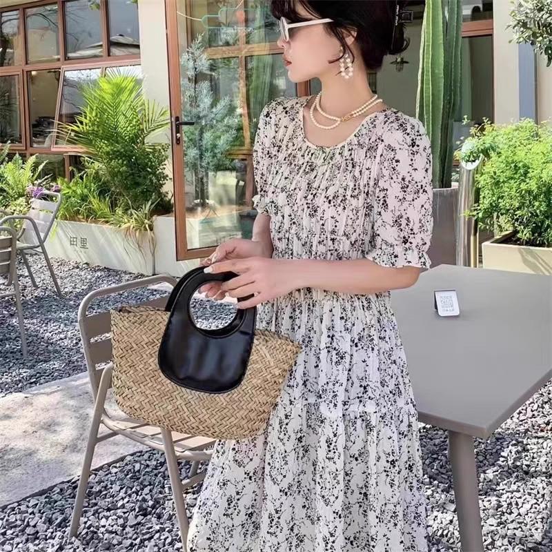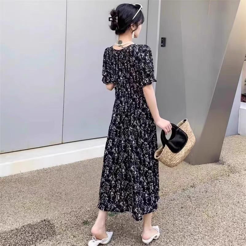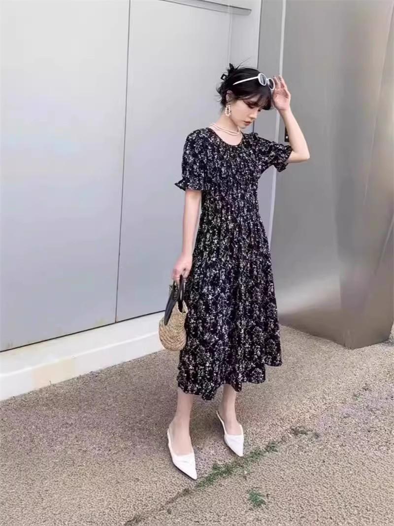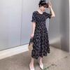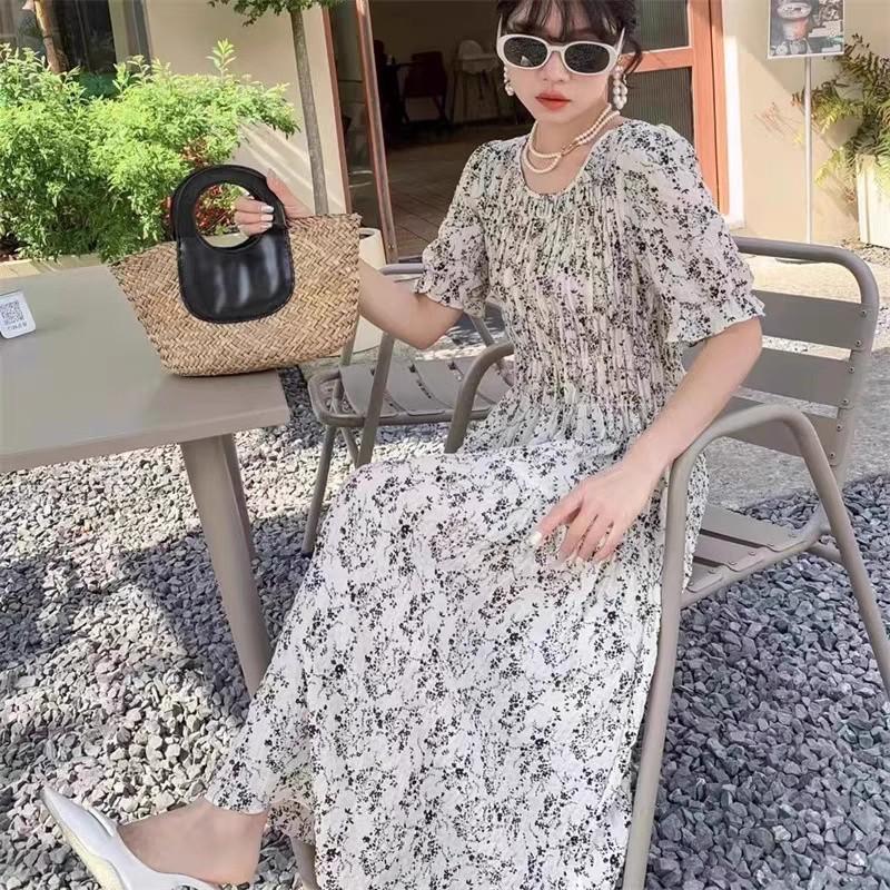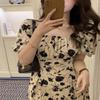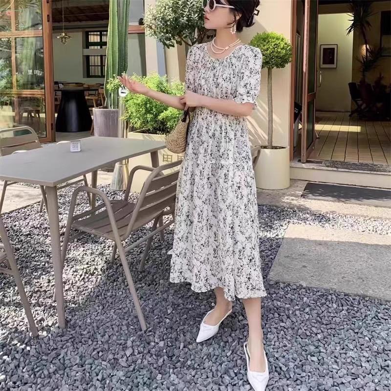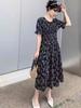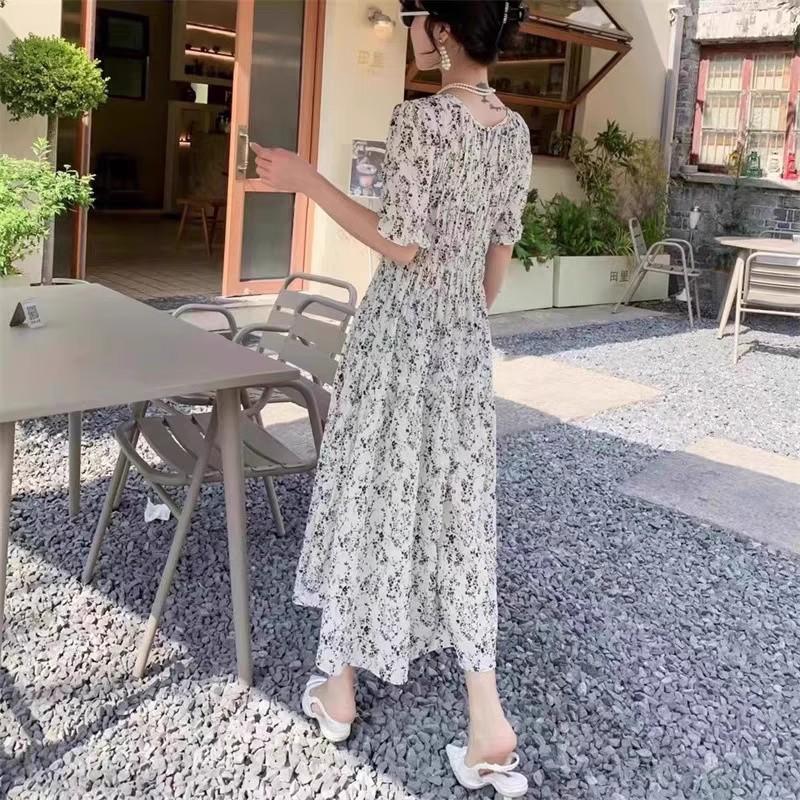 Vestido francés de cuello cuadrado floral para la hora del té con mangas abullonadas, cintura plisada elástica, vestido elegante de chifón entallado de largo midi