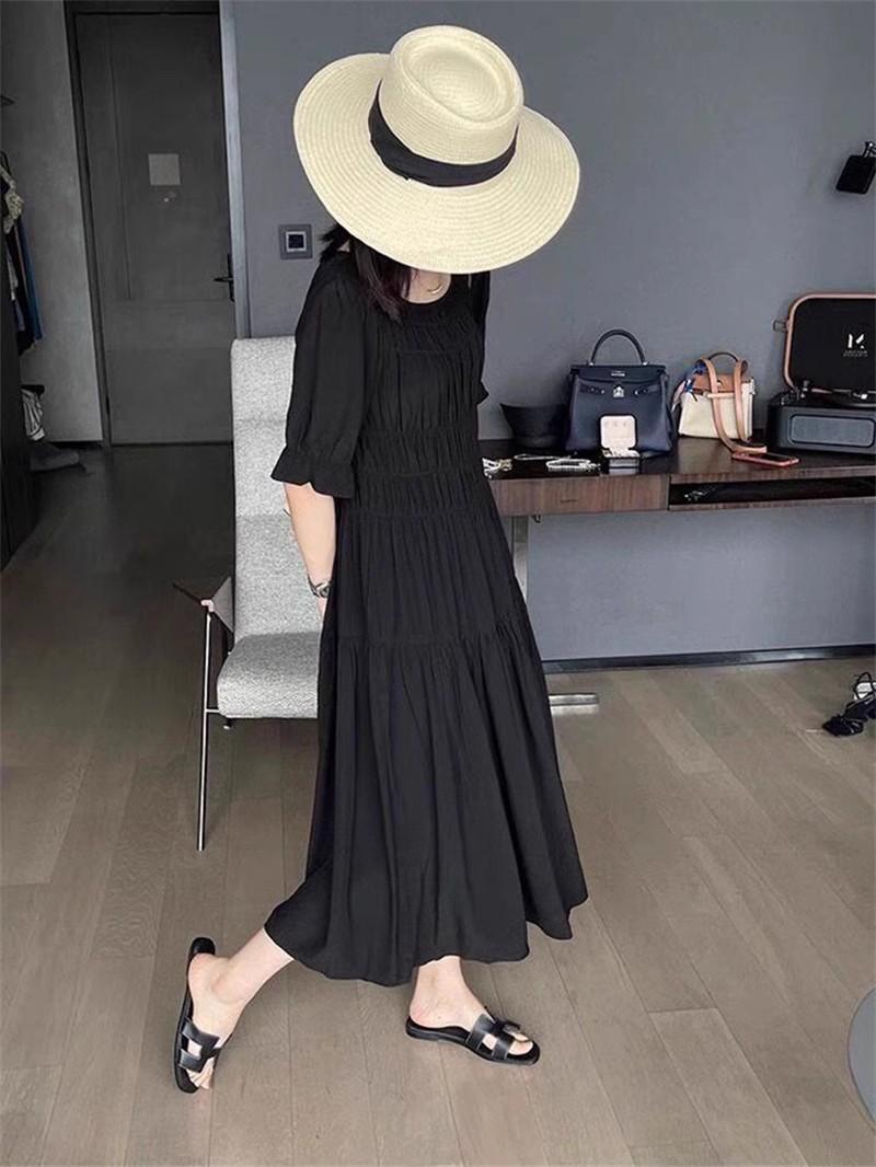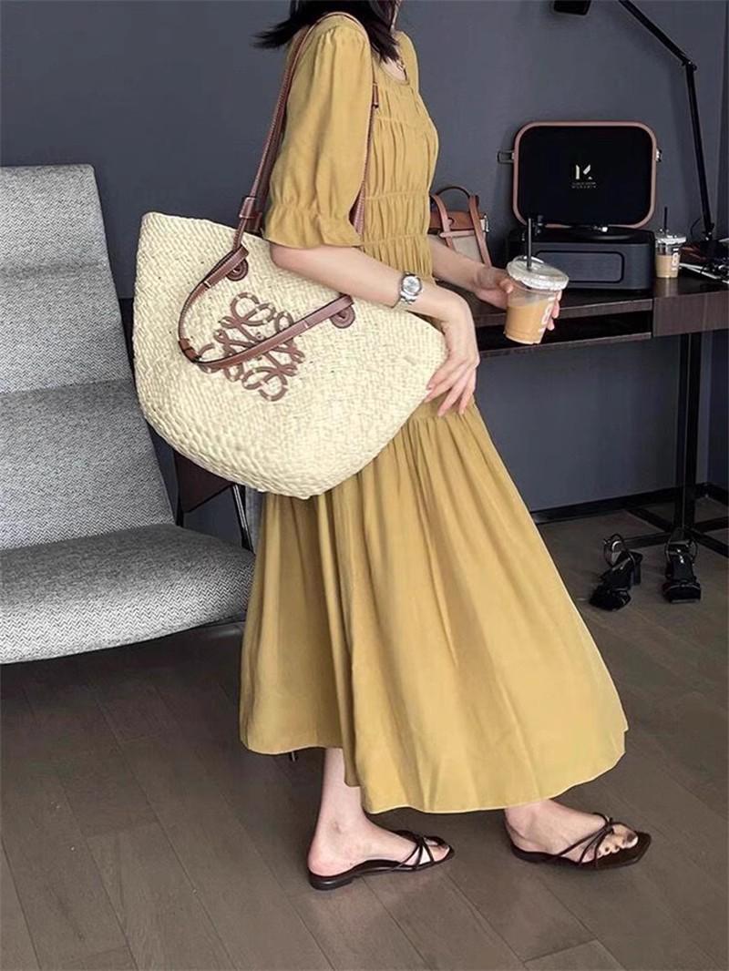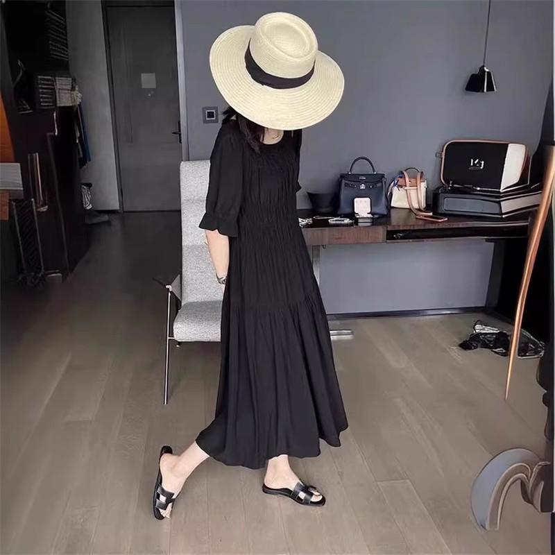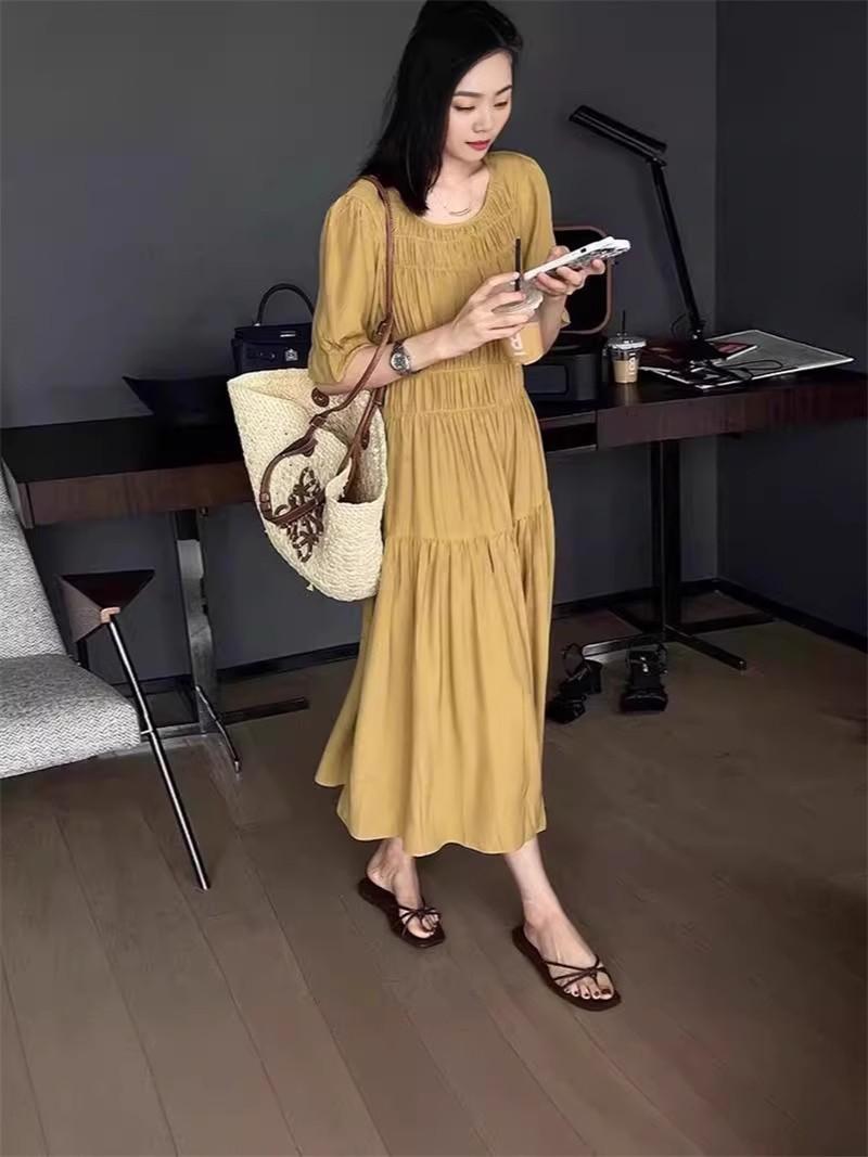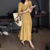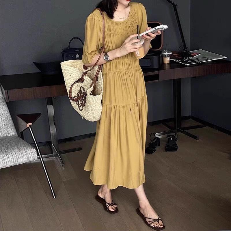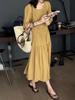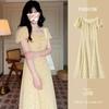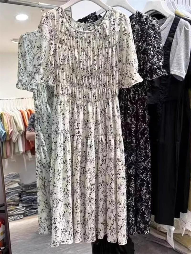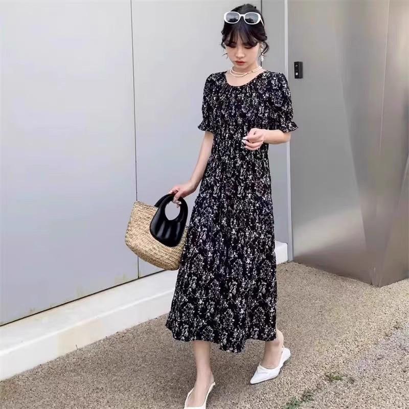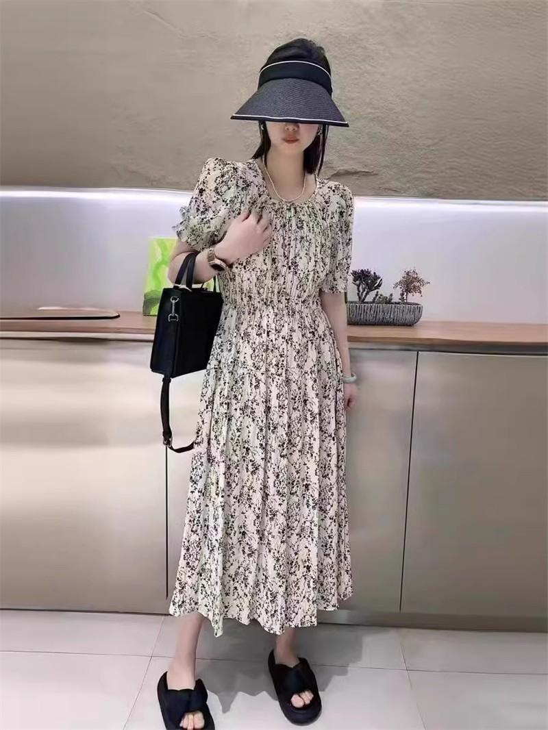 Vestido francés de cuello cuadrado floral para la hora del té con mangas abullonadas, cintura plisada elástica, vestido elegante de chifón entallado de largo midi