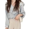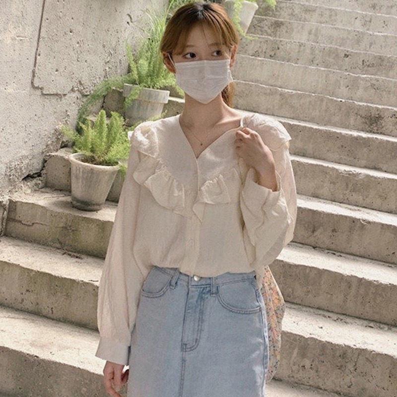 Camisa de manga larga con cuello en V y botonadura sencilla, estilo coreano chic, estilo súper hada, estilo occidental, dulce y elegante, con hojas de loto