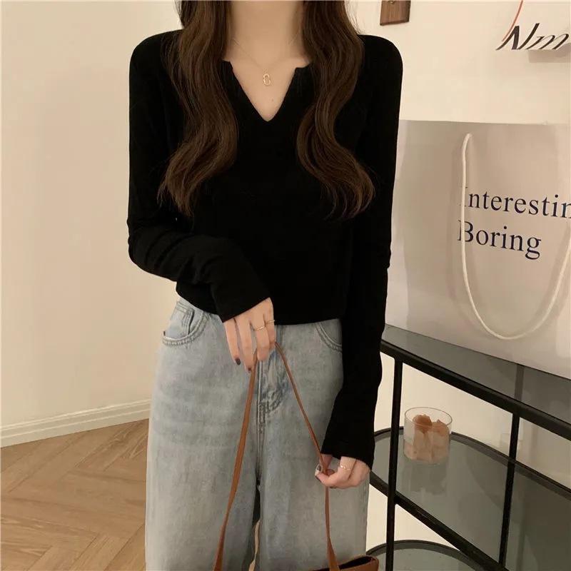 Camiseta de nicho de manga larga con cuello en V para mujer primavera y otoño 2022 nueva versión coreana ajustada versátil camiseta básica top corto