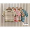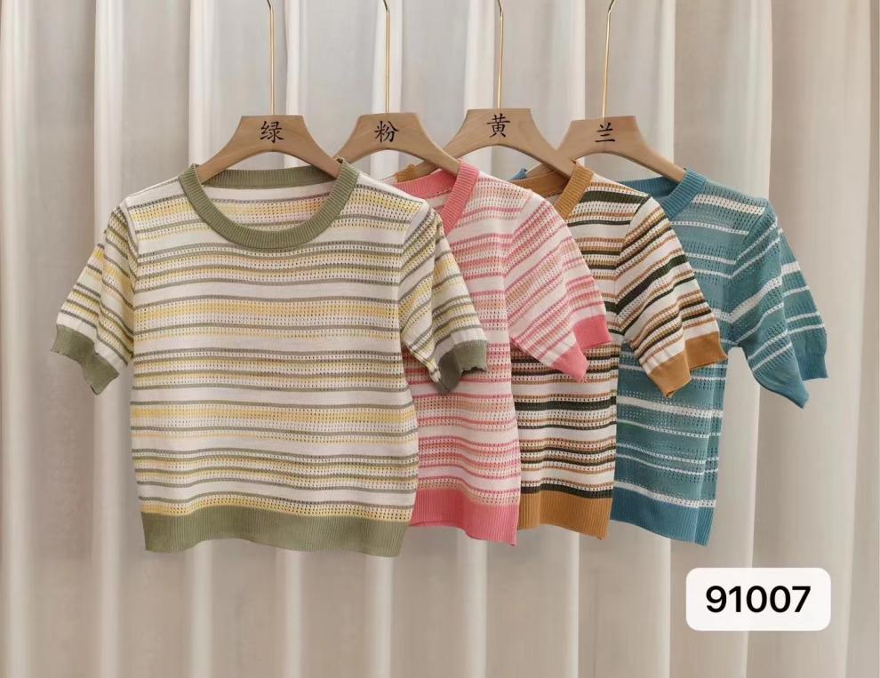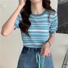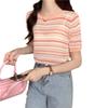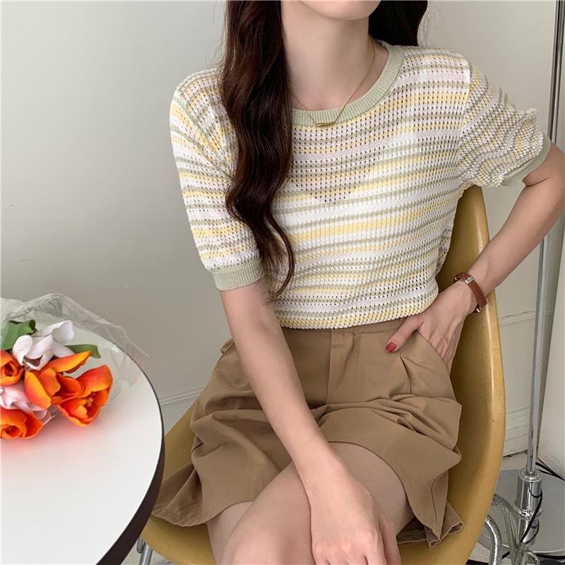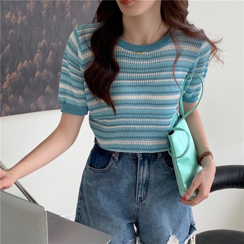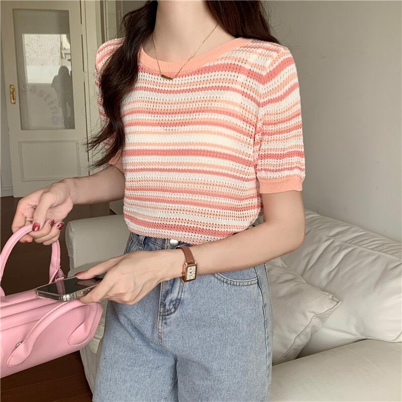 Camiseta de Manga Corta a Rayas de Estilo Nuevo de Seda de Hielo Fina Calada Reductora de Edad para Mujer, Elegante Top de Punto Casual tipo Jersey