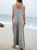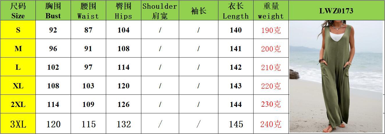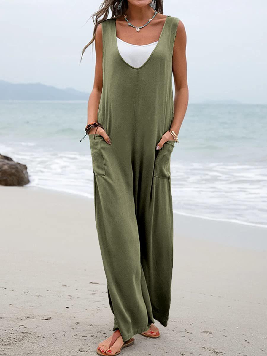 Nuevo Verano 2023 Amazon nuevo color sólido parche bolsa moda mono cuello en V pantalones de tirantes pantalones de pierna ancha para mujer