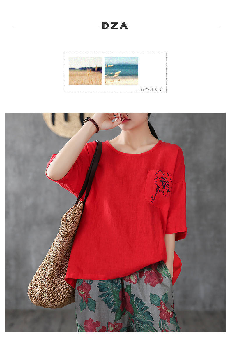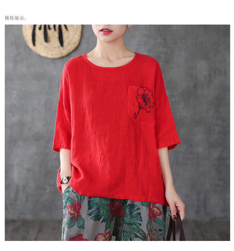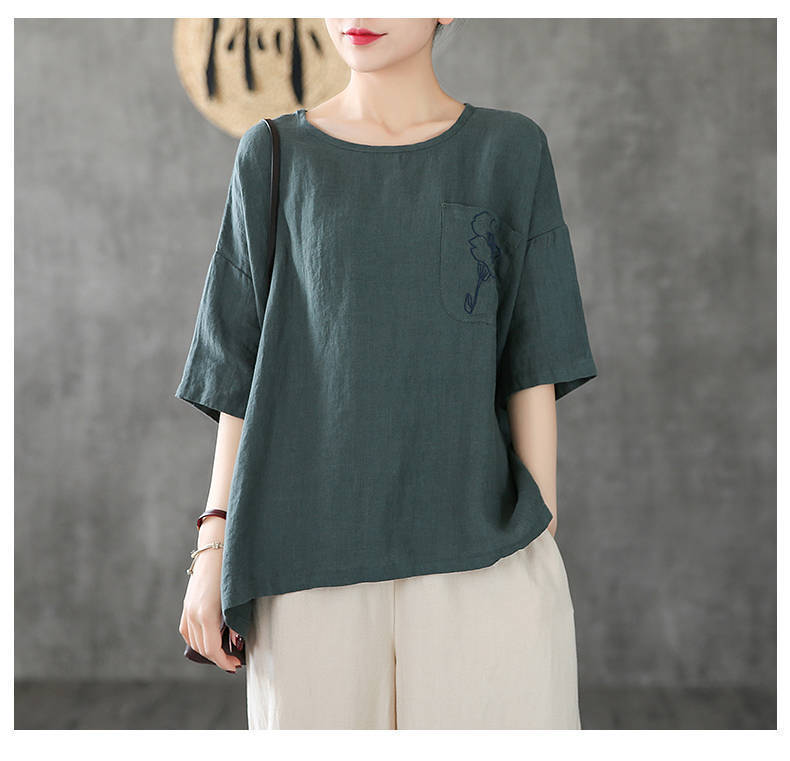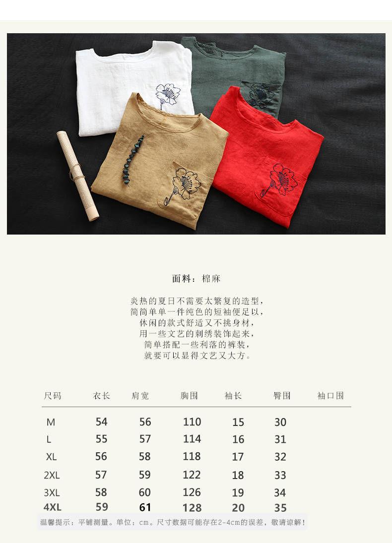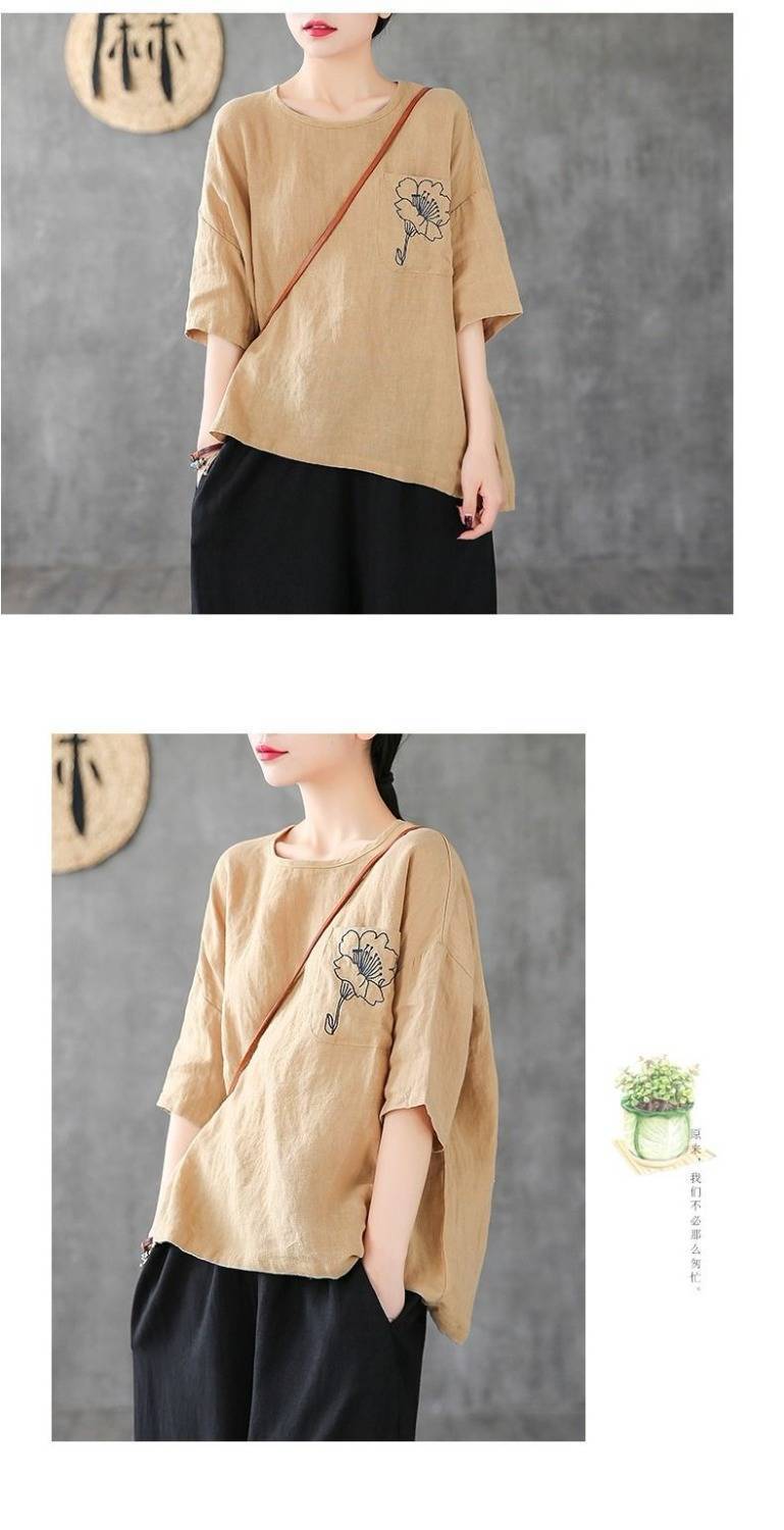 Camiseta de Algodón y Lino Bordada con Flores para Mujer Blusa Holgada de Manga Corta Verano 2025 Nuevo Top Casual de Media Manga