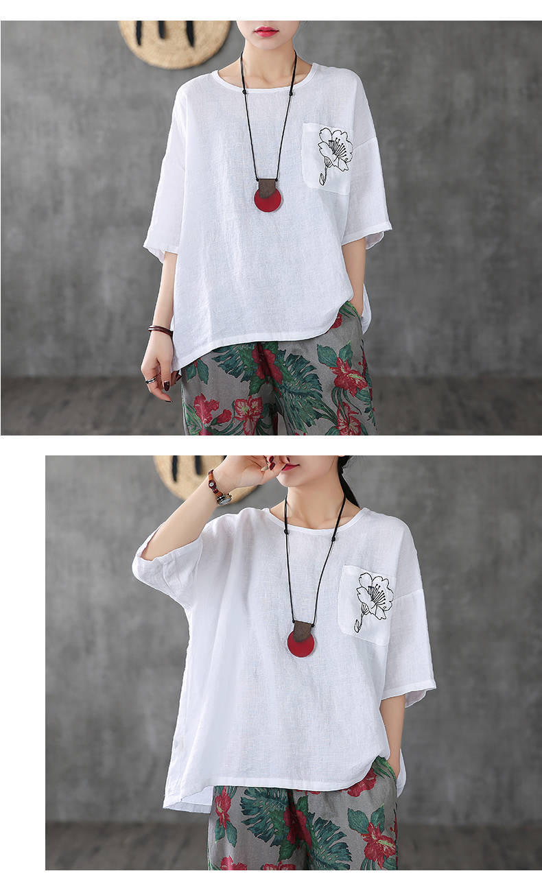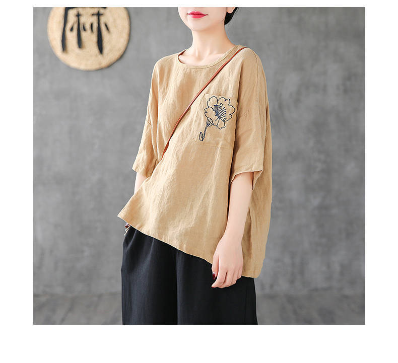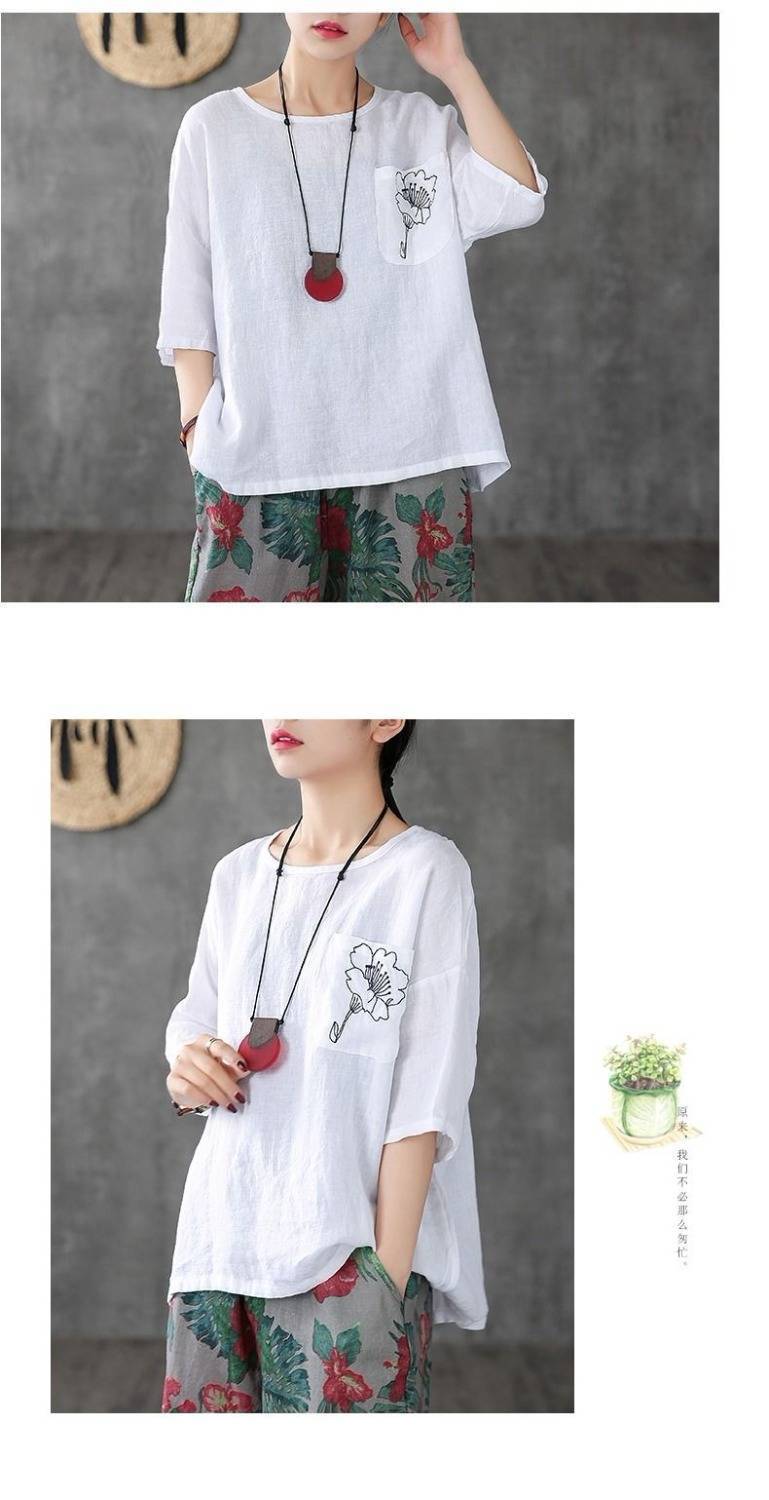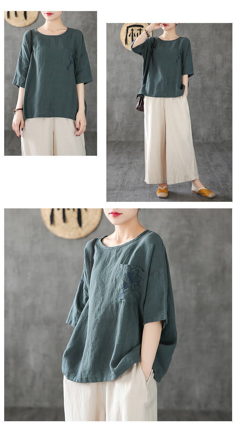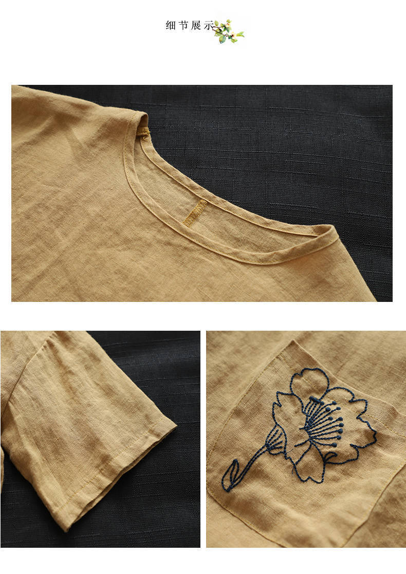 Camiseta de Algodón y Lino Bordada con Flores para Mujer Blusa Holgada de Manga Corta Verano 2025 Nuevo Top Casual de Media Manga