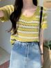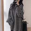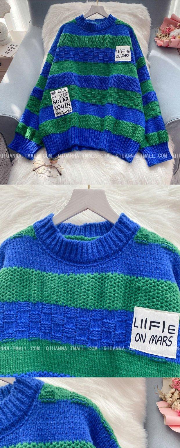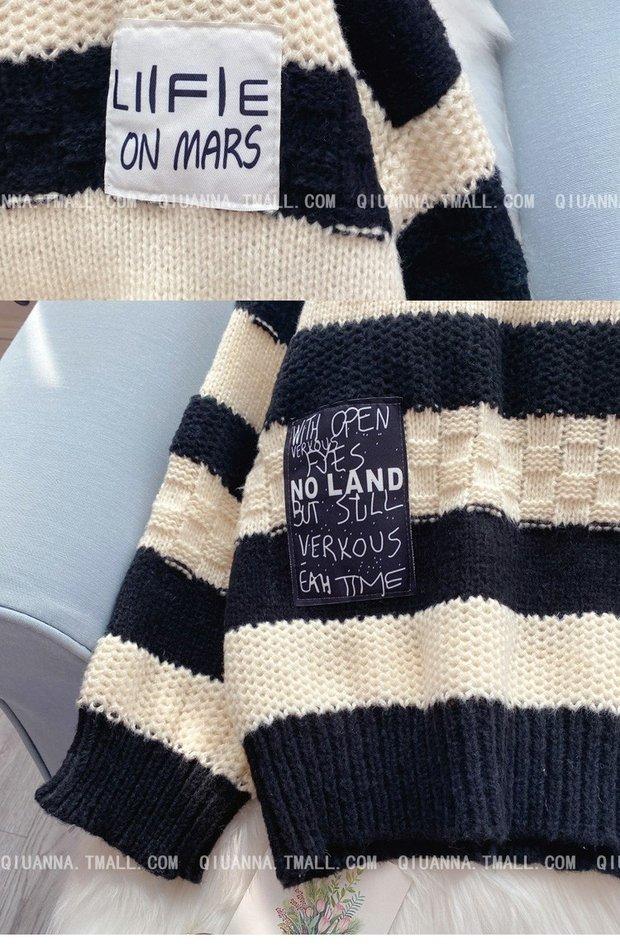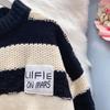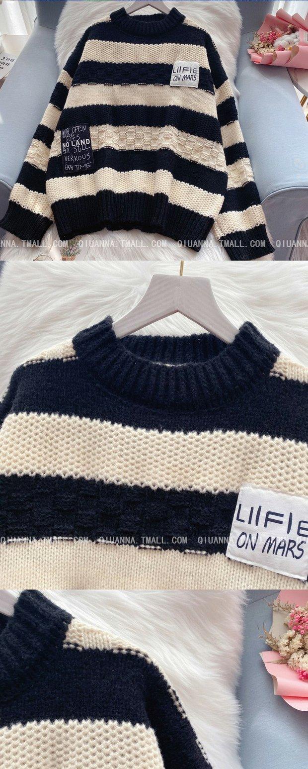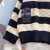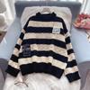 Suéter de rayas blancas y negras de estilo perezoso para mujer, otoño e invierno 2024, nuevo estilo coreano, top de punto holgado con cuello redondo y contraste de colores que combina con todo.