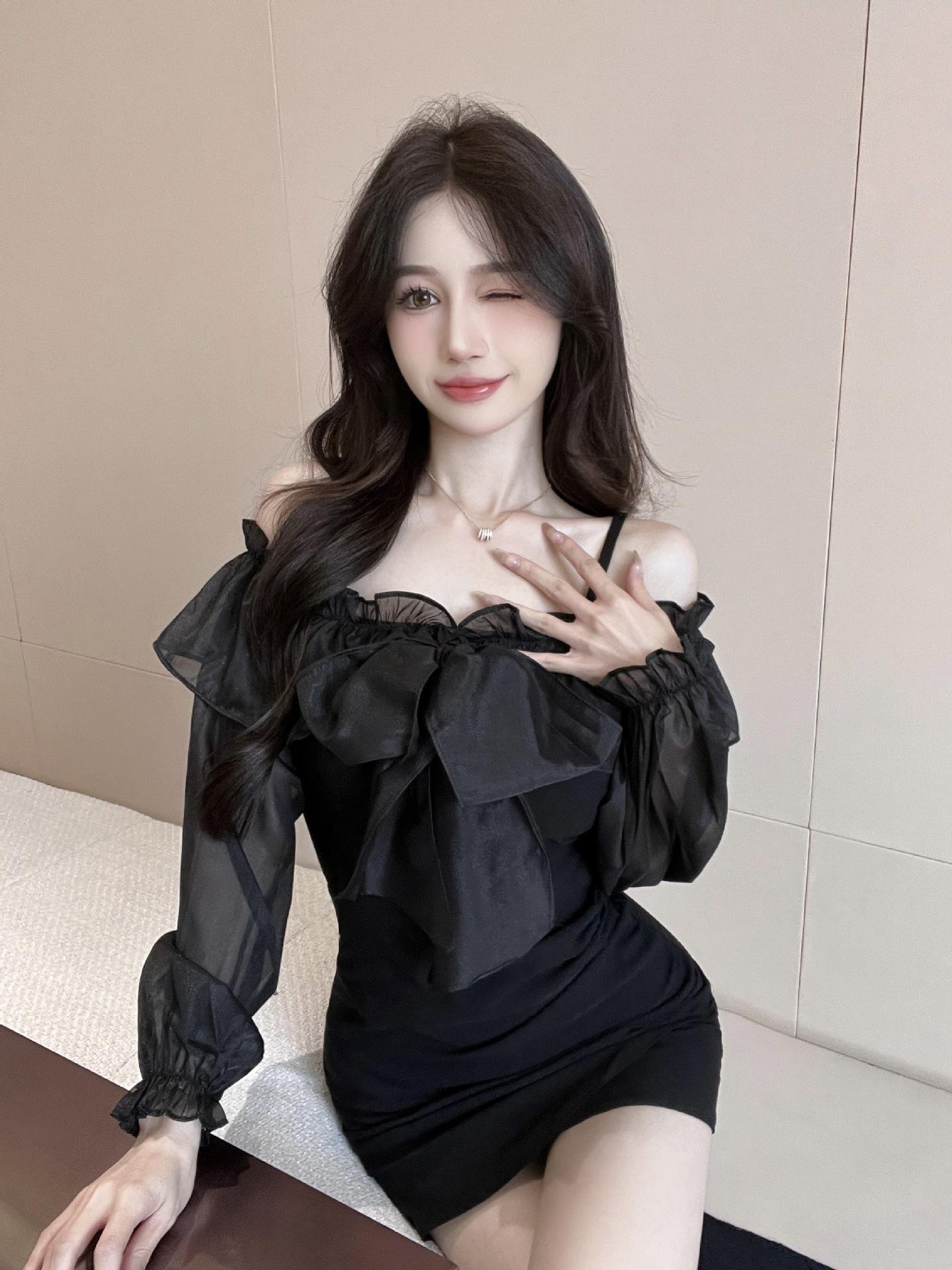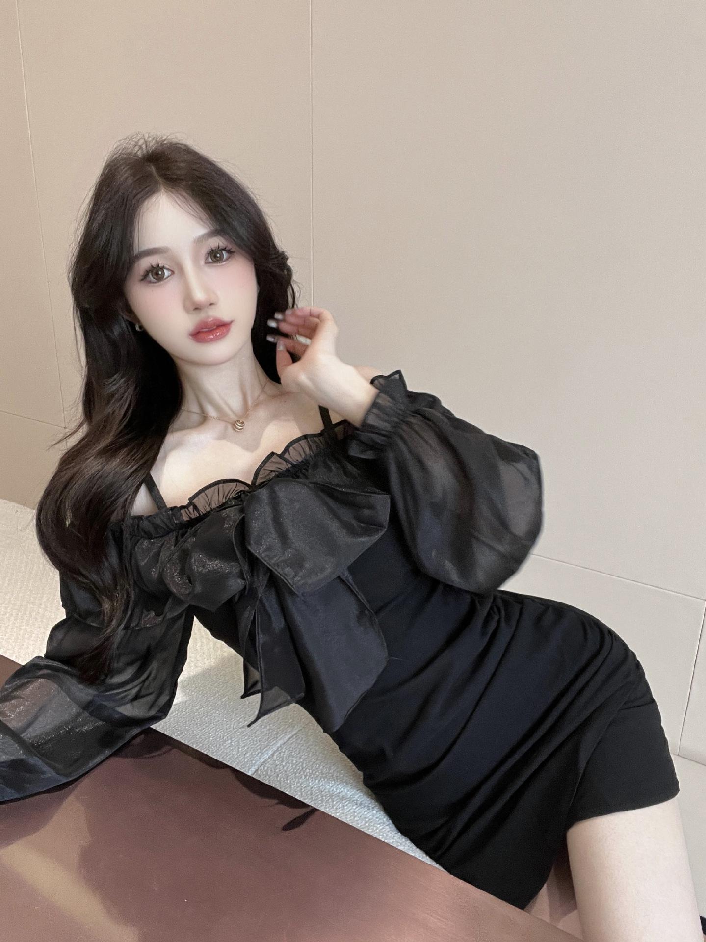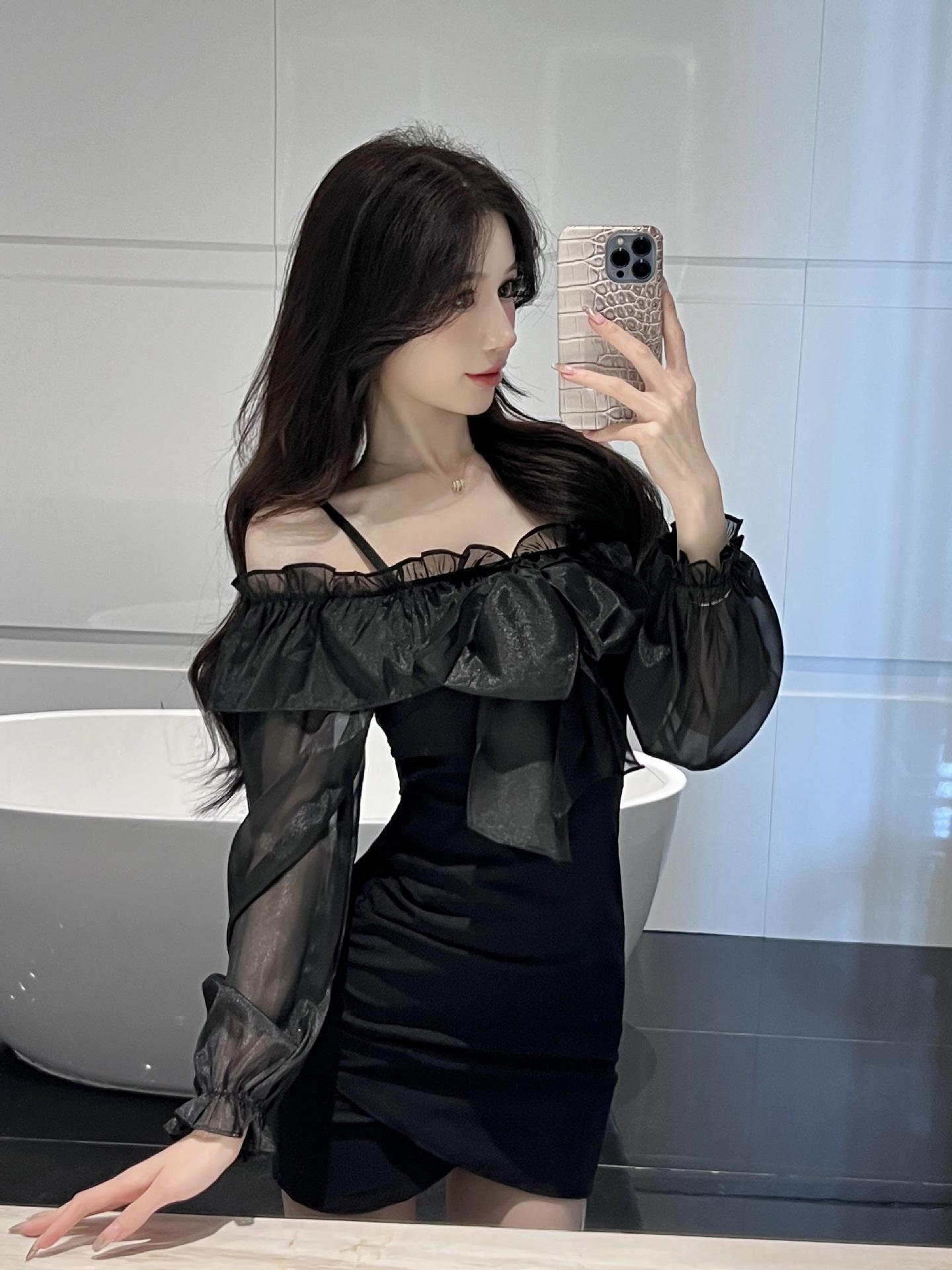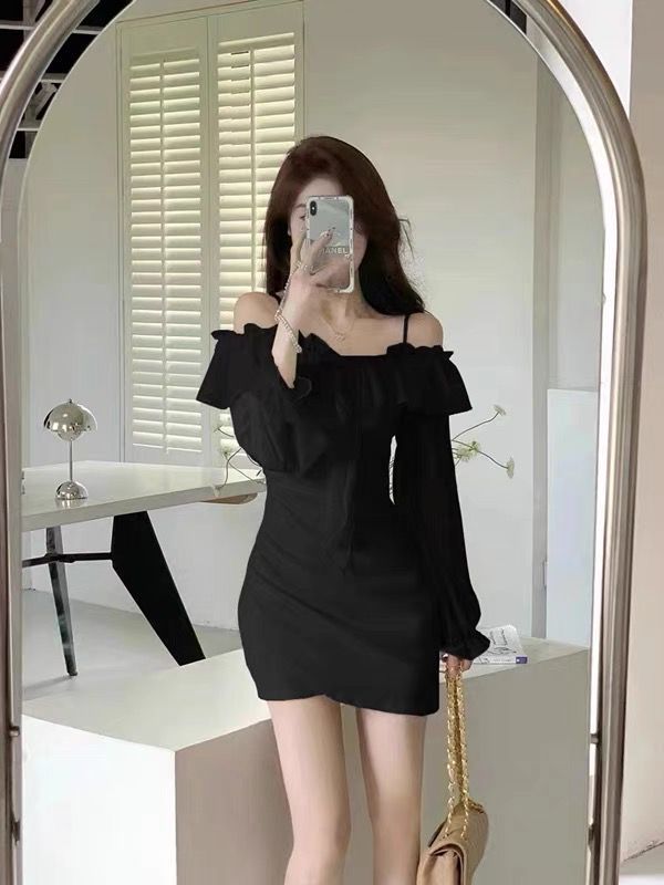 Vestido plisado ajustado con manga larga y volantes para primavera y verano con falda a la cadera con tirantes al hombro estilo Pure Wish