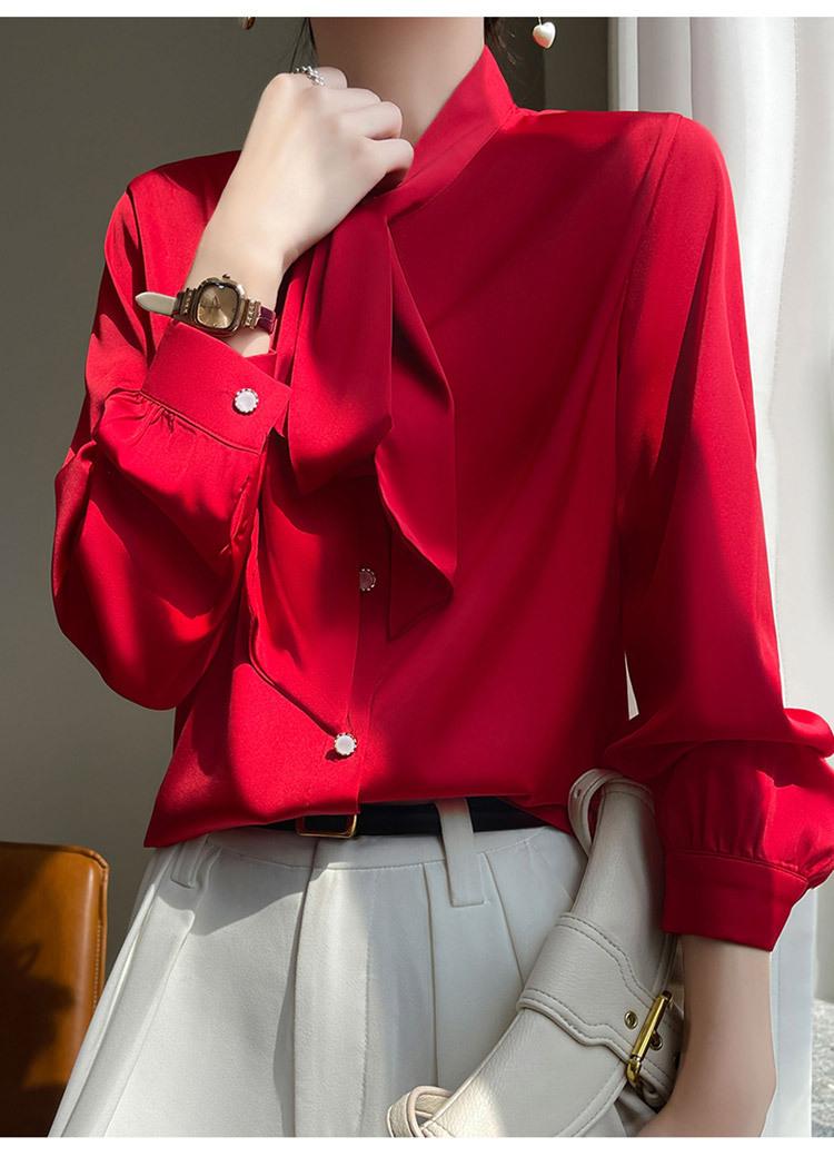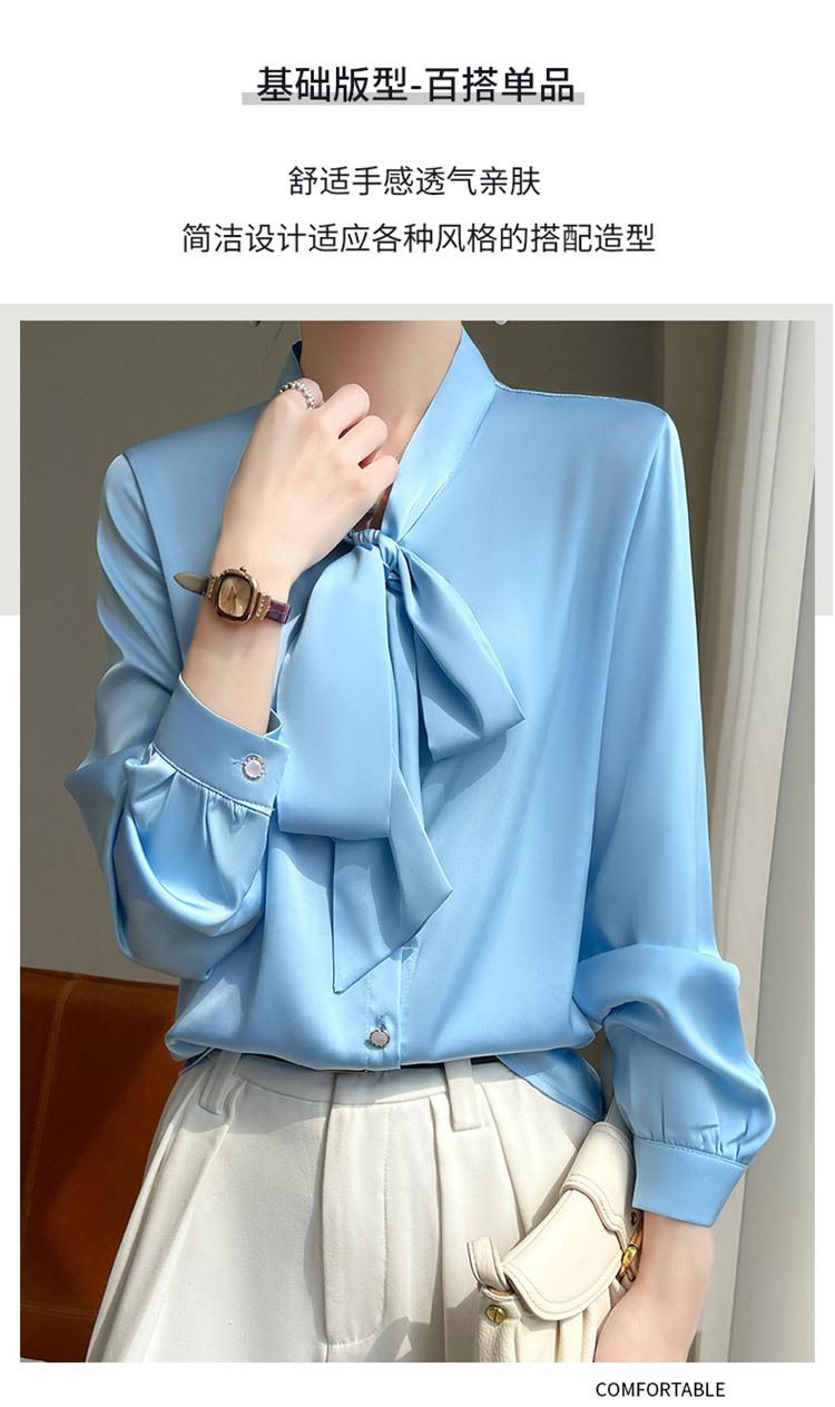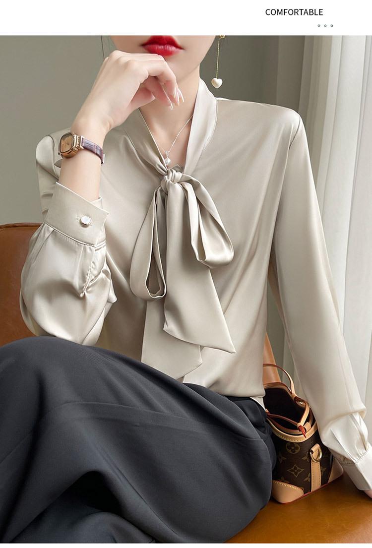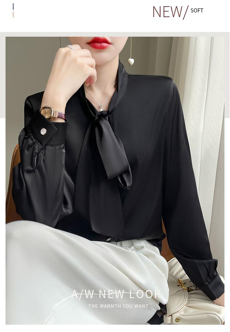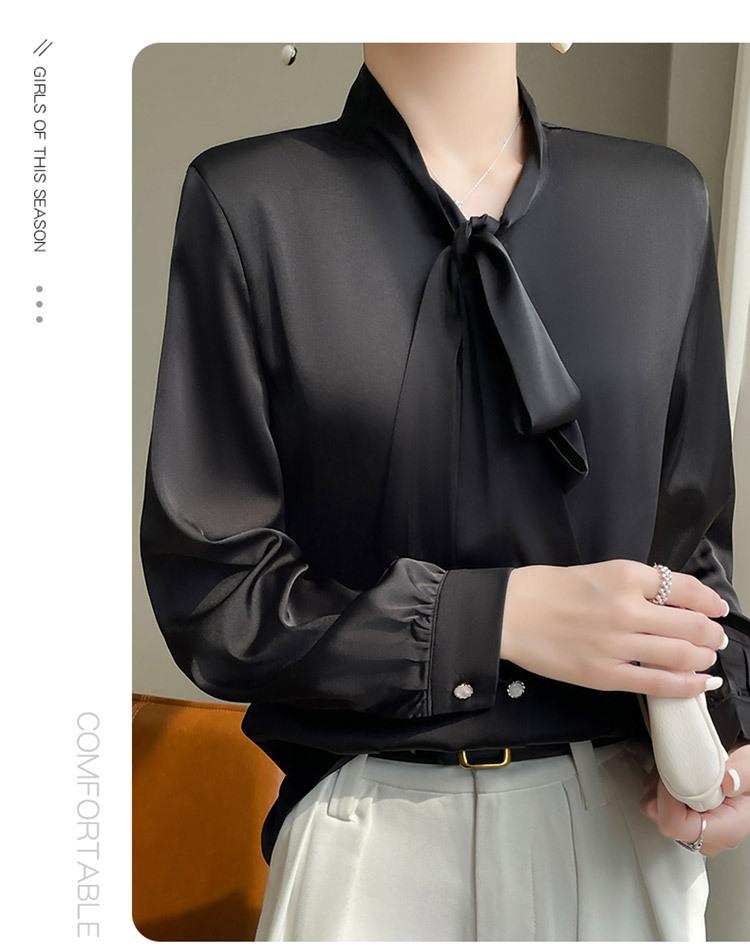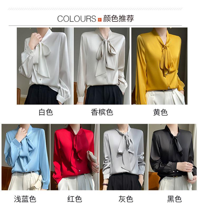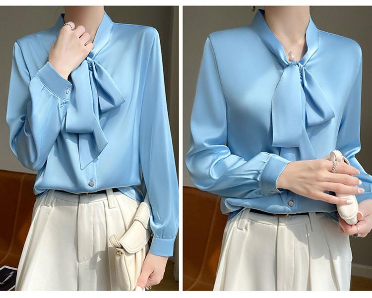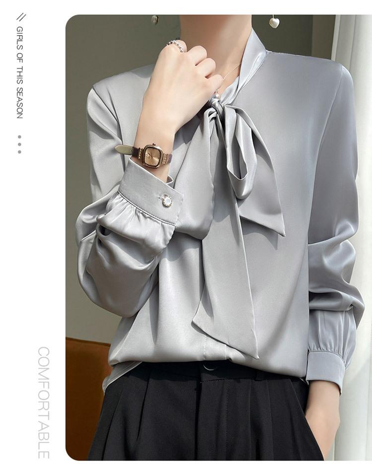 | Camisa de seda con lazo para mujer, nuevo diseño de primavera 2023, camisa de moda de nicho, top ajustado de seda morera |