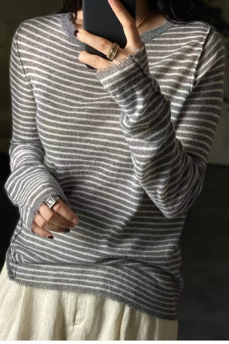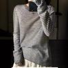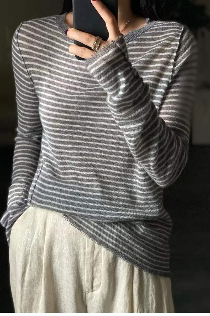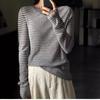 Camiseta Base de Lana Merino Worsted Ultrafina para Mujer Primavera/Otoño 2025 Suéter de Rayas Blancas y Negras Diseño Nicho Ligero y Delgado