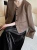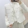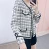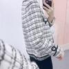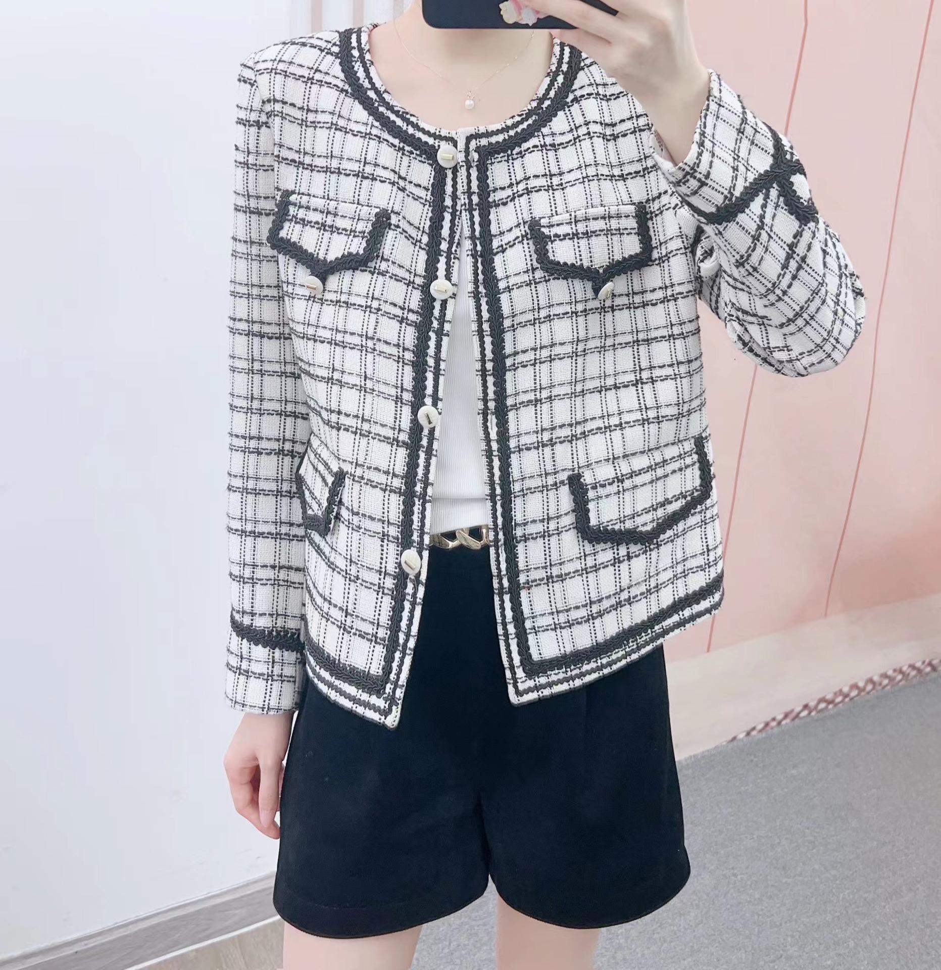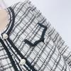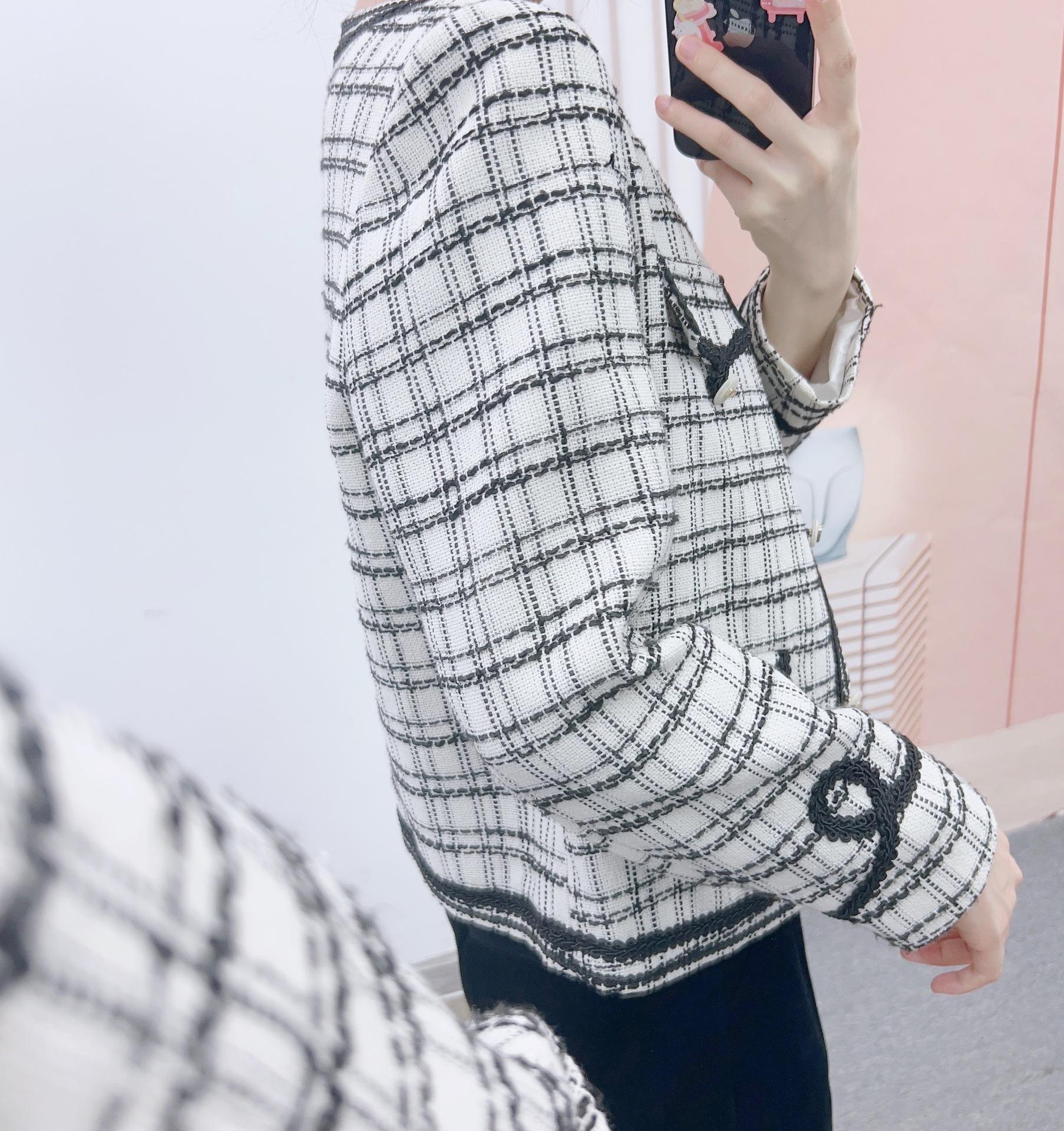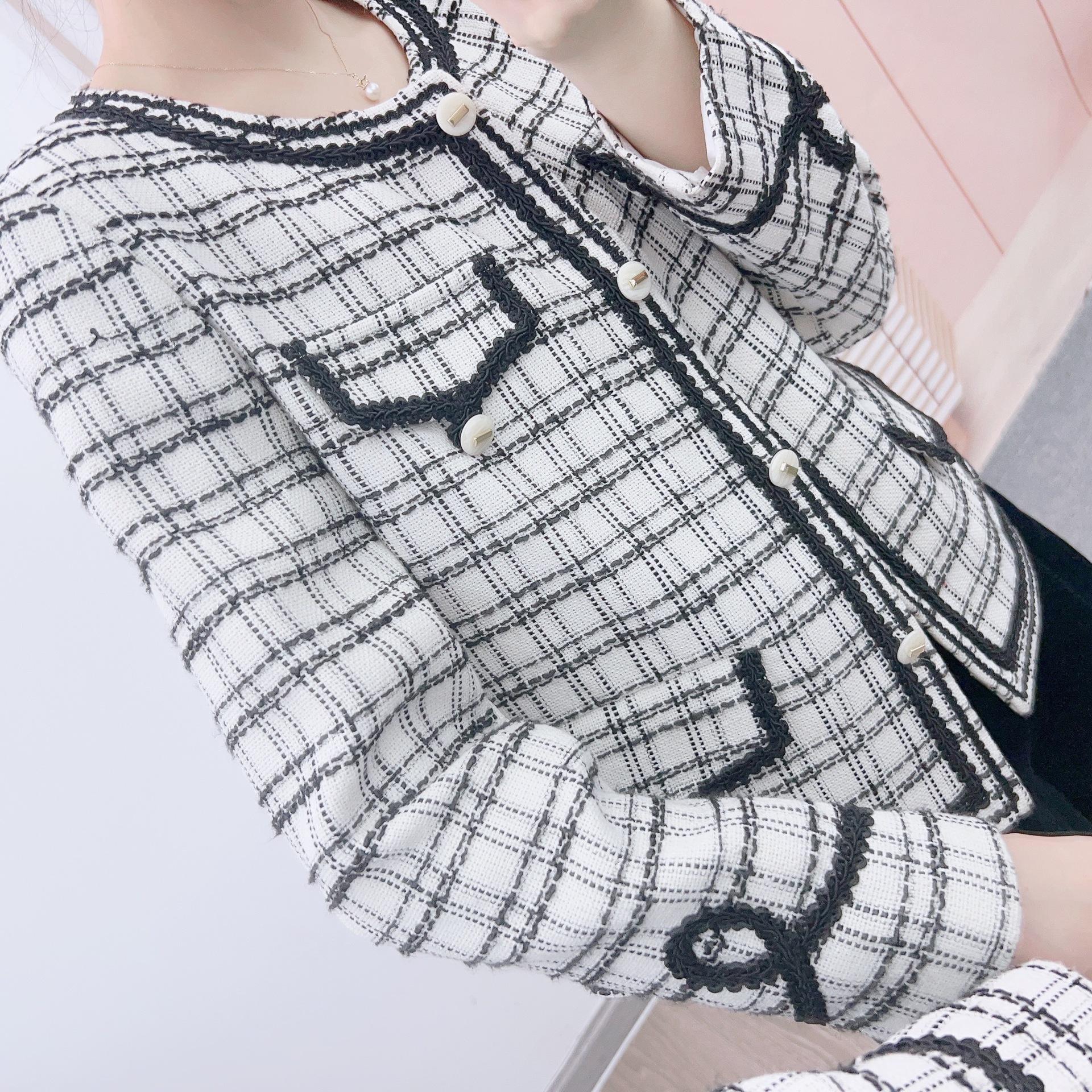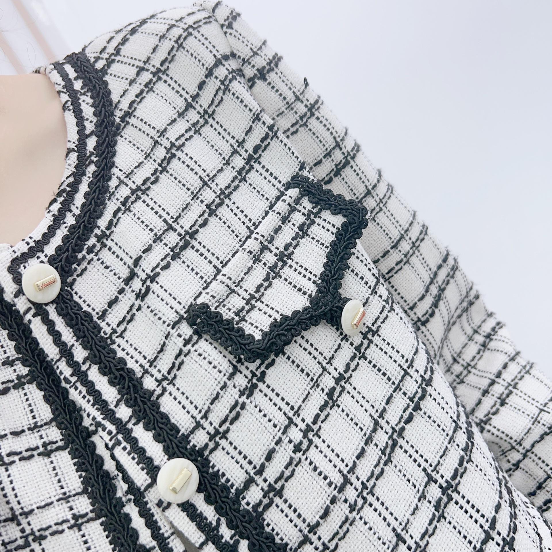 Abrigo estilo Chanel a cuadros blancos y negros de tejido fino con combinación de varias telas, nuevo modelo de otoño de 2023, talla 125