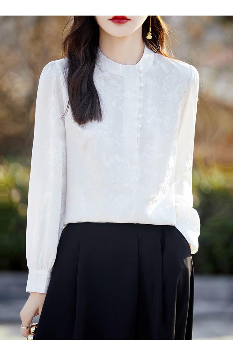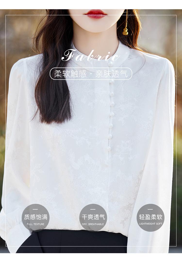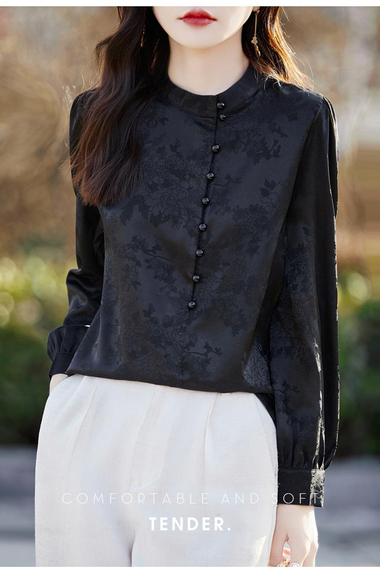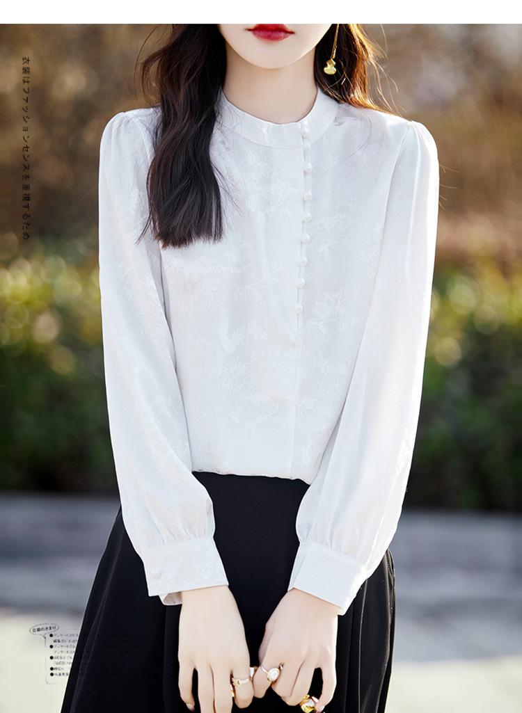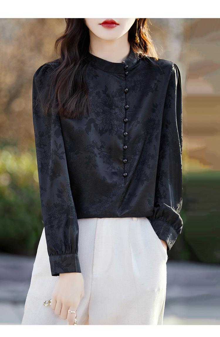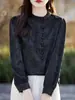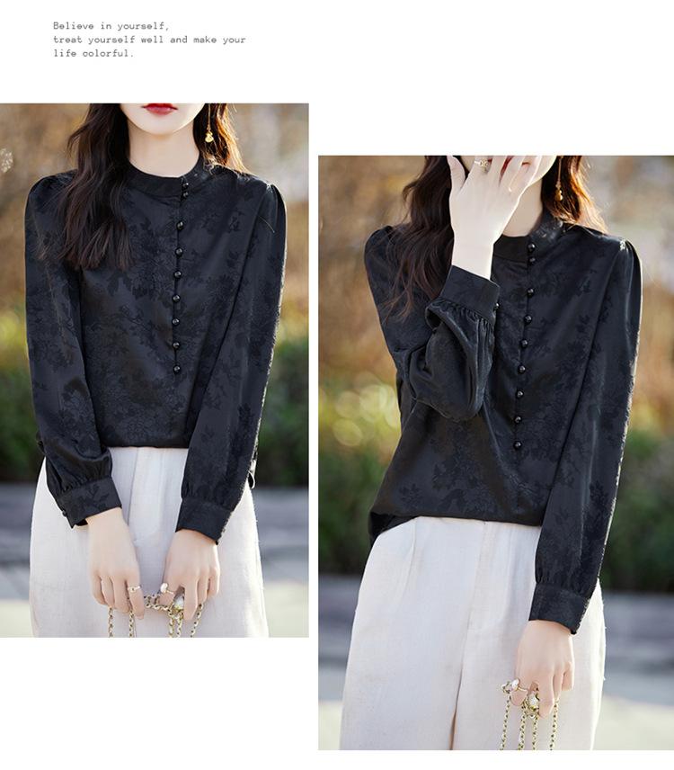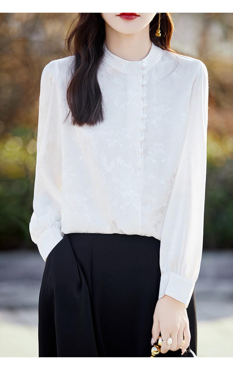 Camisa jacquard retro francesa de cuello alto para mujer, manga larga, de alta calidad, estilo chino nuevo, diseño de nicho con sentido del diseño de hebilla de perla