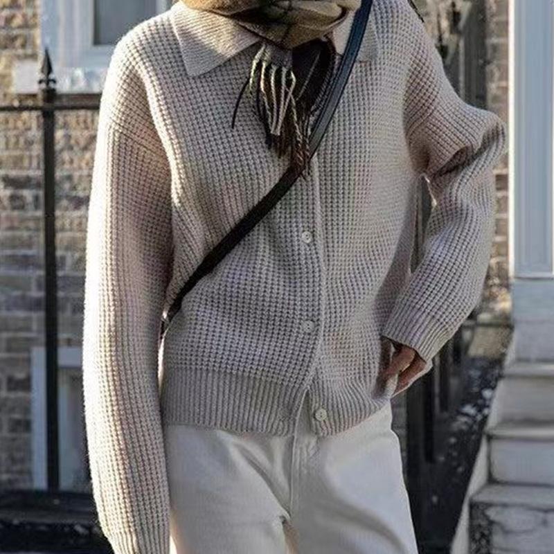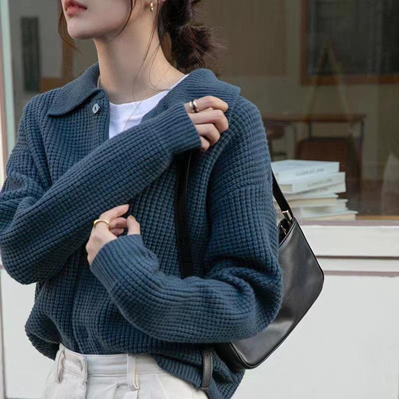 Suéter de punto holgado de color sólido con solapa estilo retro coreano para mujer, otoño 2023