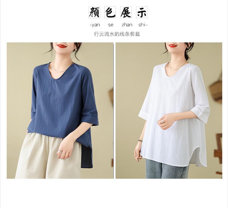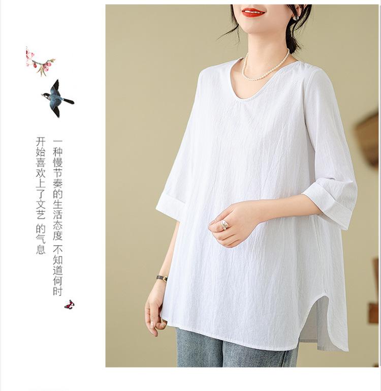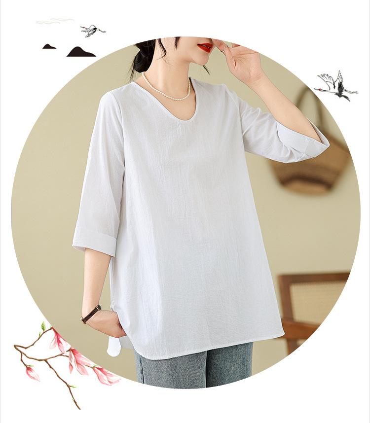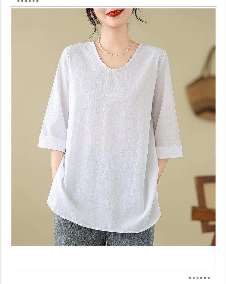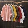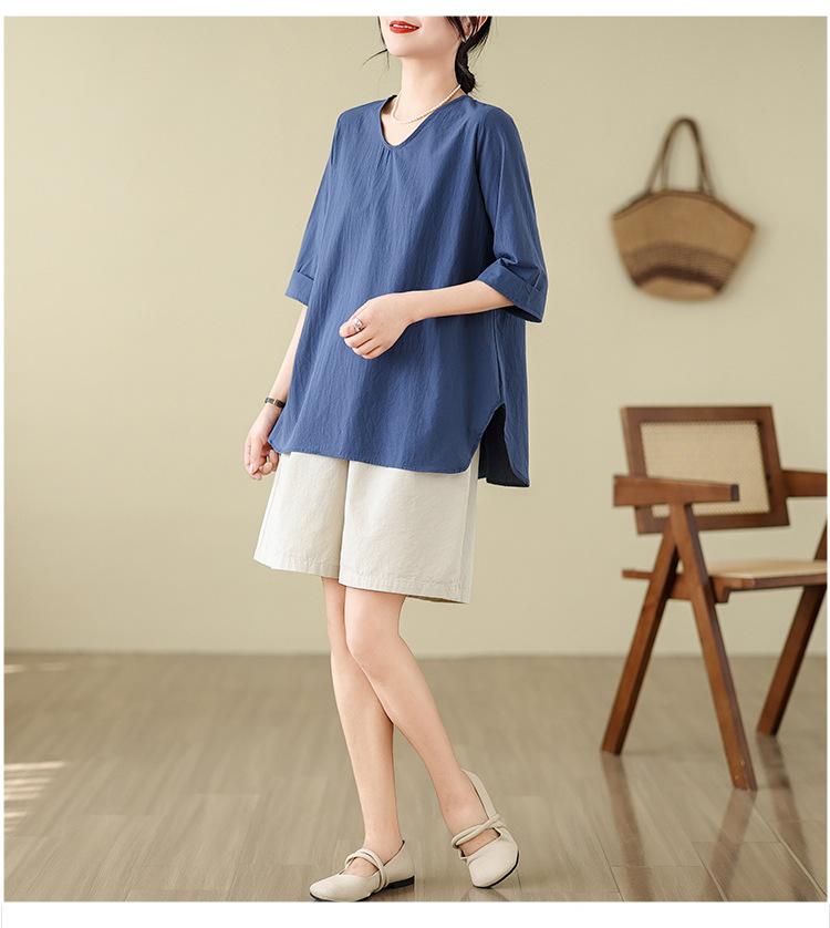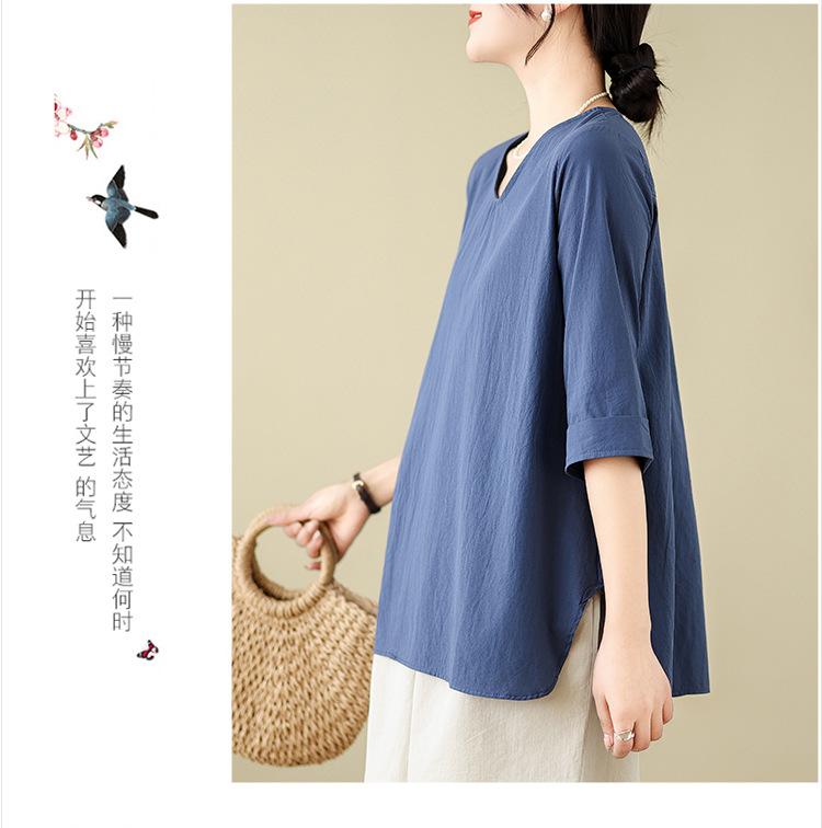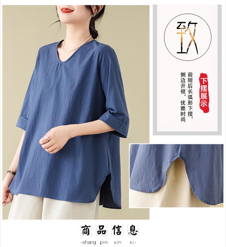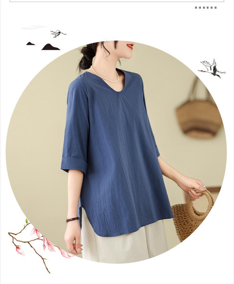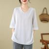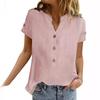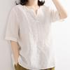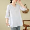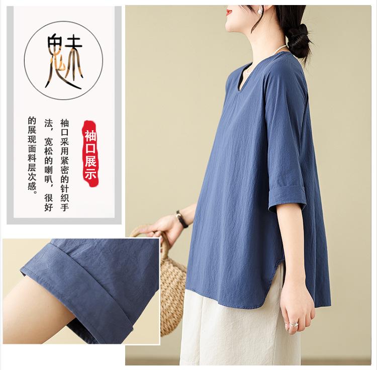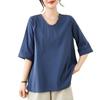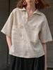 Camisa de lino puro holgada con cuello en V y manga corta de verano, talla grande, con protector solar