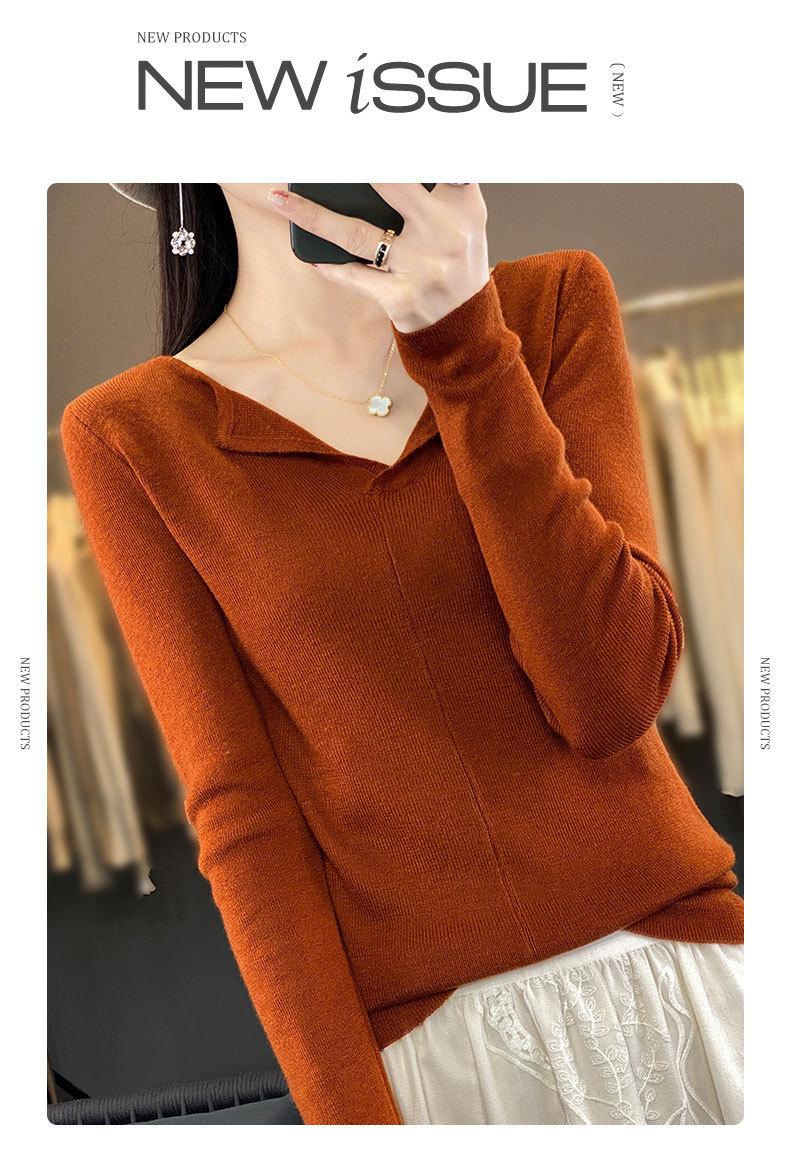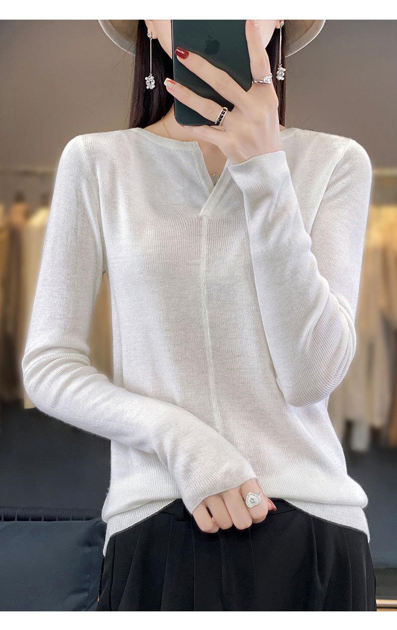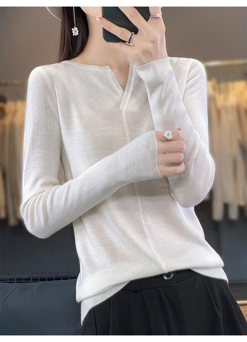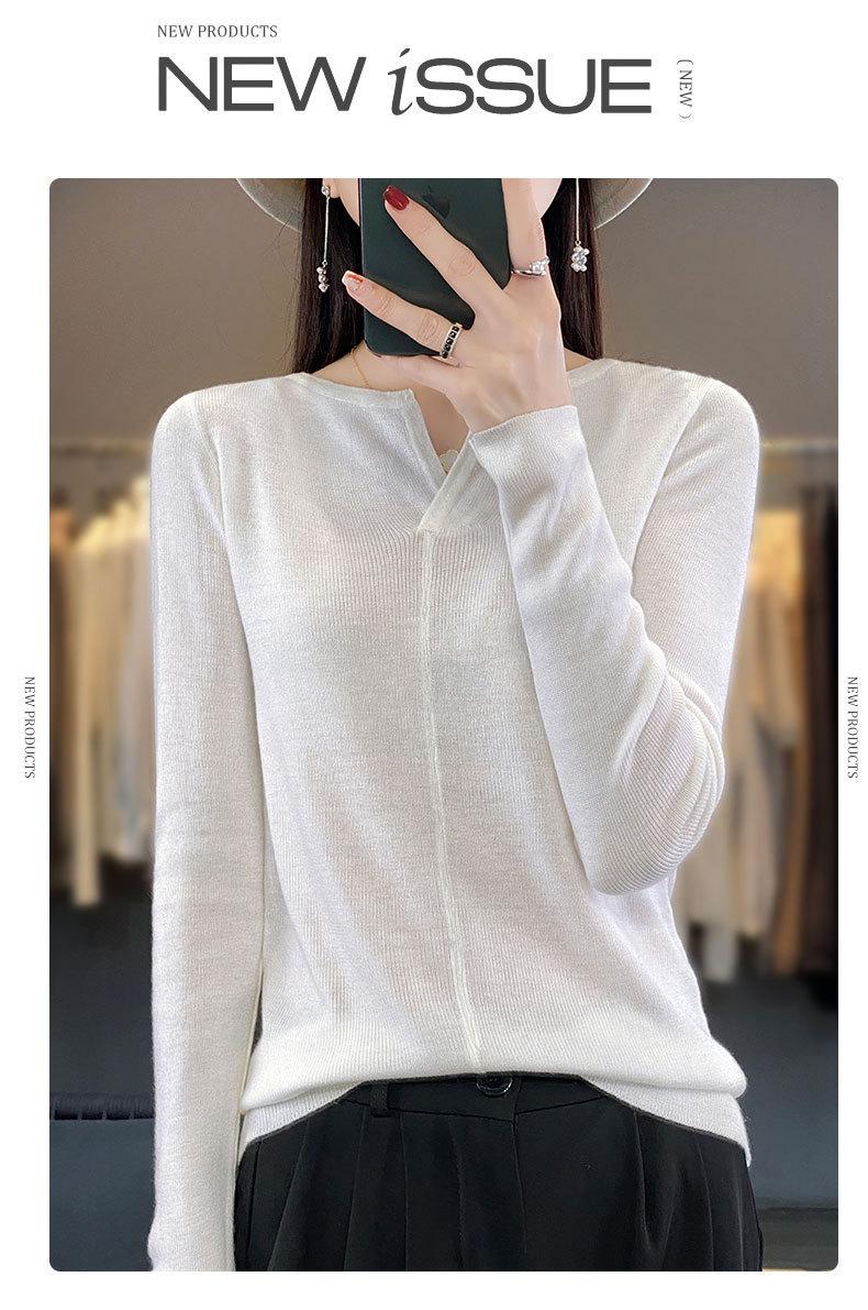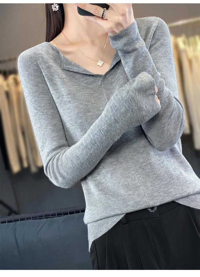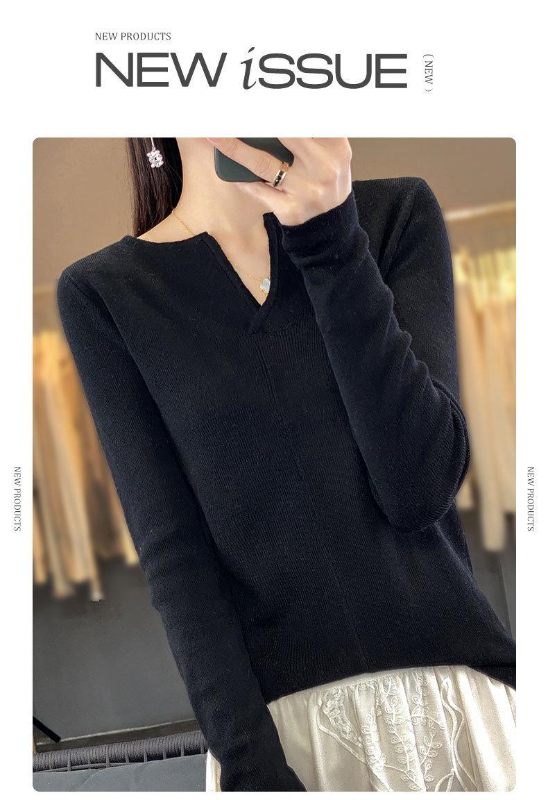 Suéter de cuello en V medio abierto de lana de principios de otoño, suéter fino de nicho para mujer, camisa de fondo, suéter delgado de manga larga, nuevo