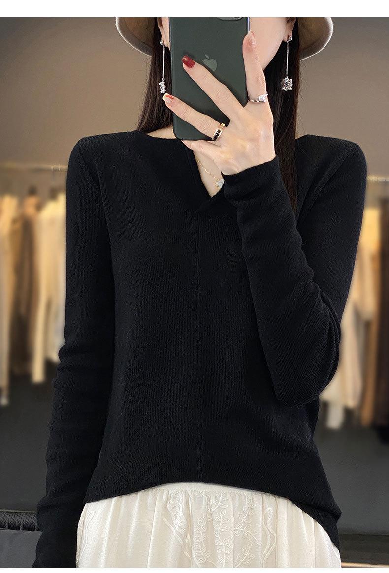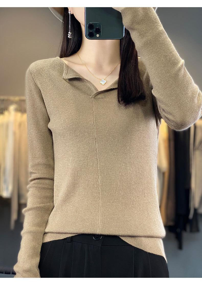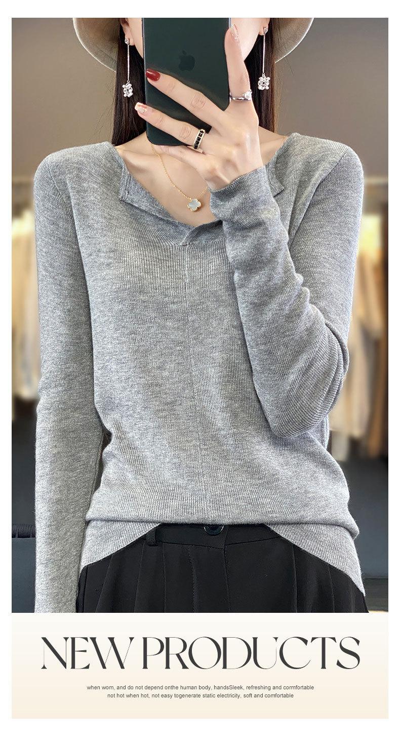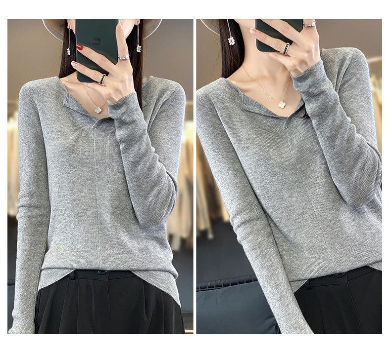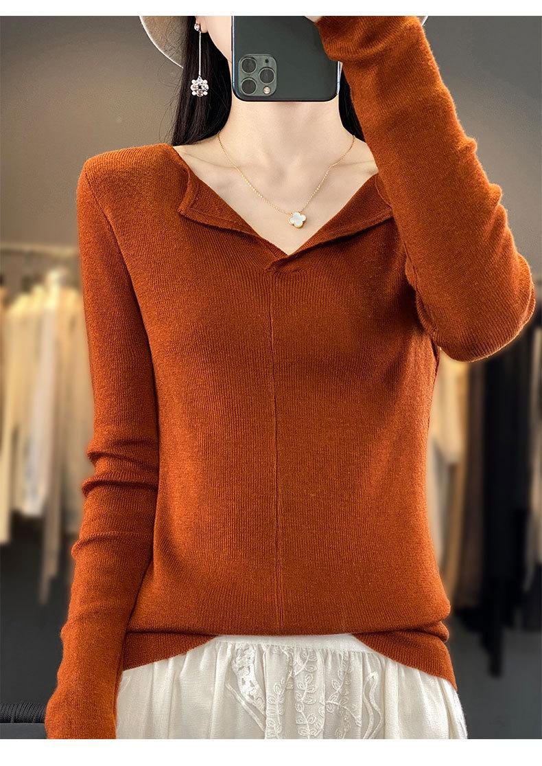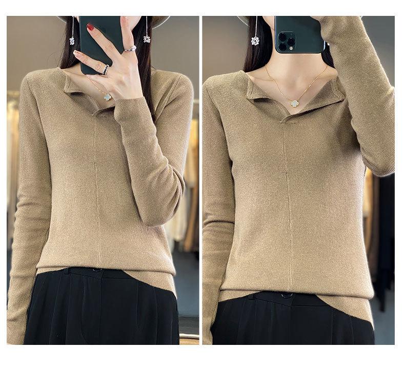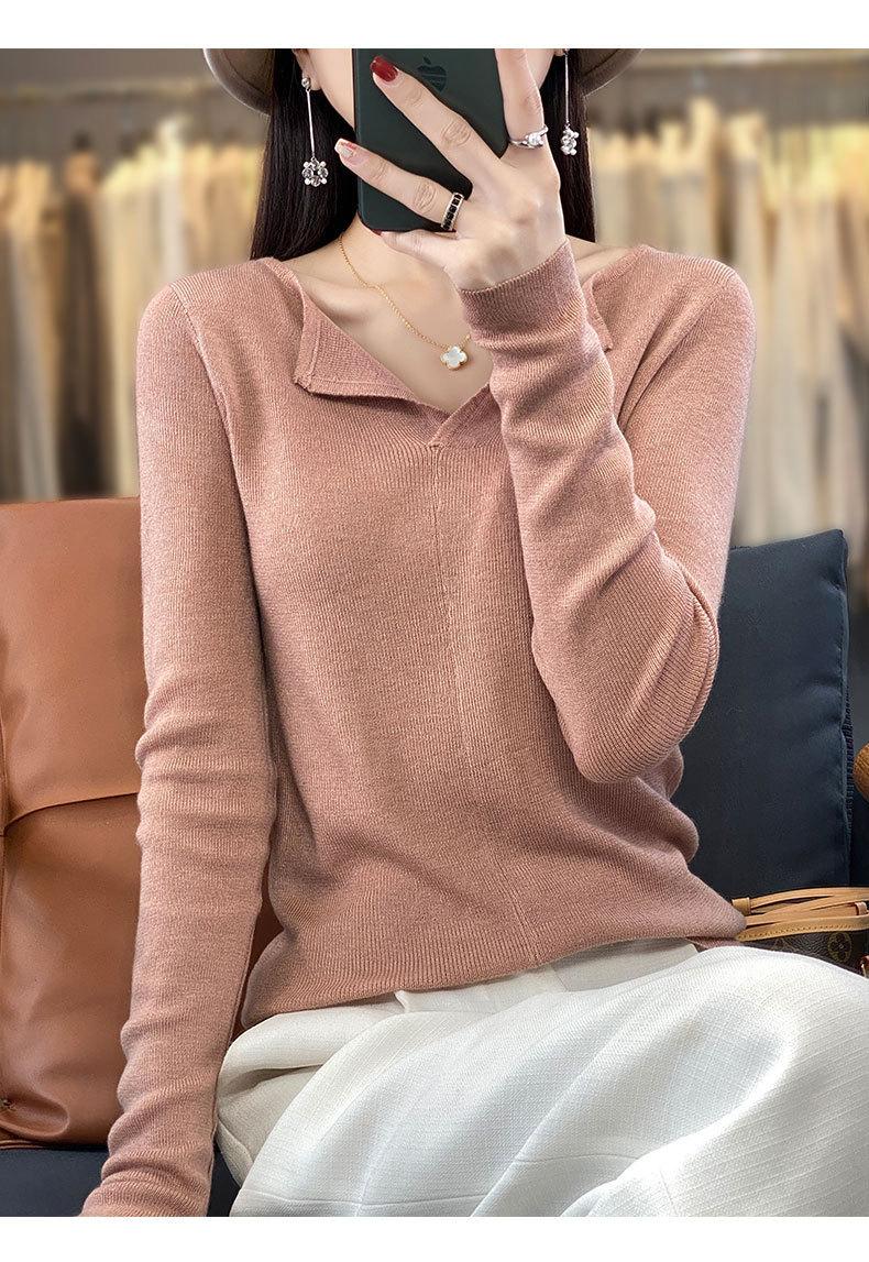 Suéter de cuello en V medio abierto de lana de principios de otoño, suéter fino de nicho para mujer, camisa de fondo, suéter delgado de manga larga, nuevo