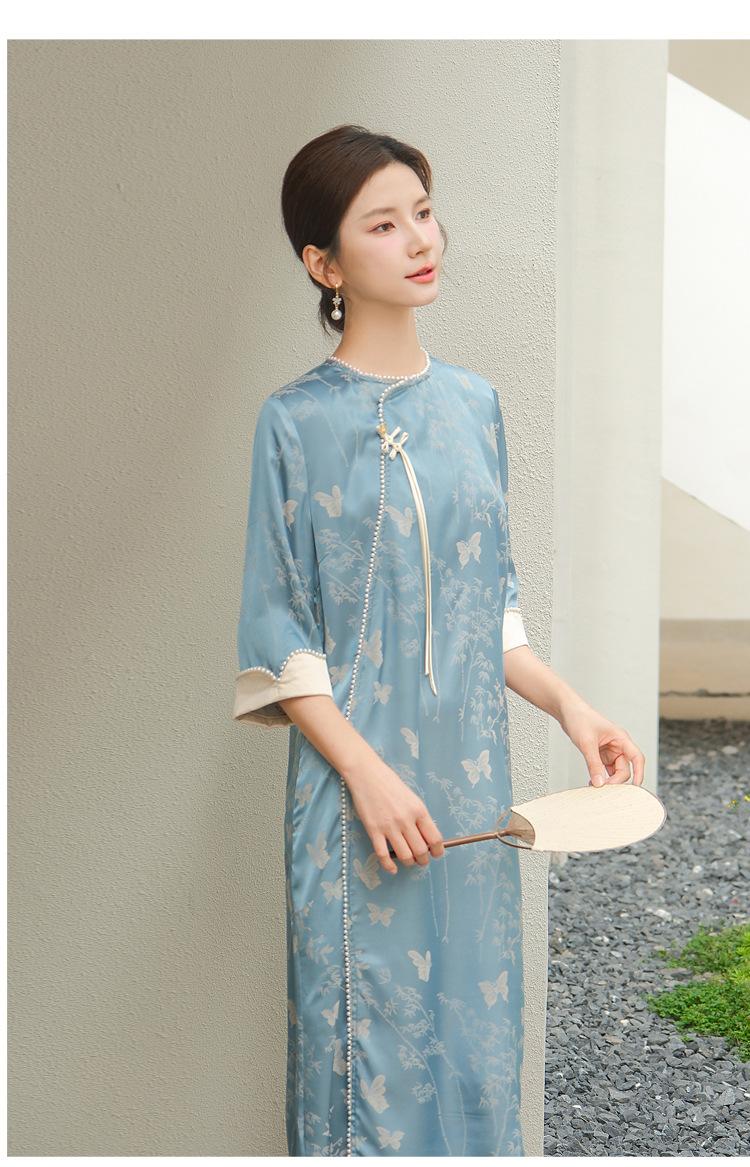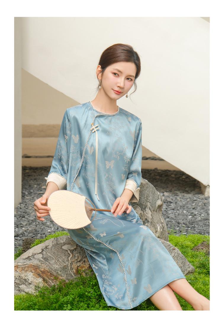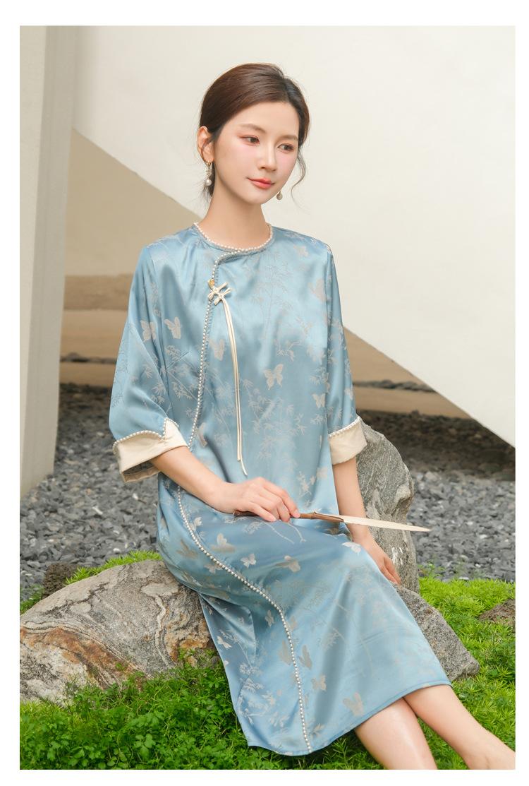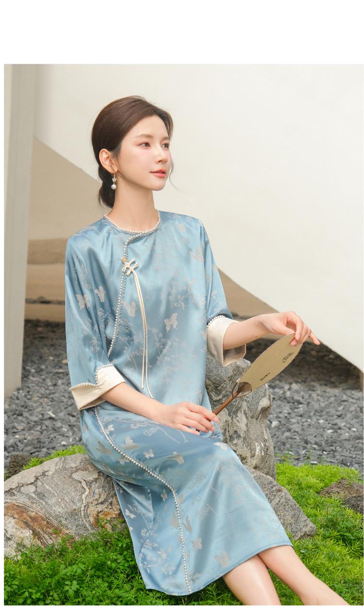 Vestido Cheongsam de primavera y verano para mujer, estilo chino, estilo Cheongsam, de seda satinada con brocado, elegante, adelgazante, midi.