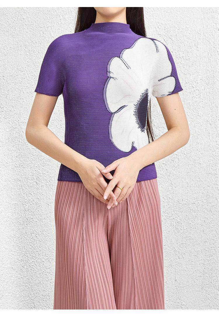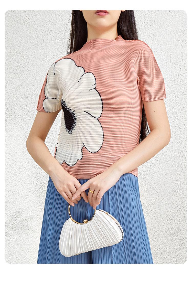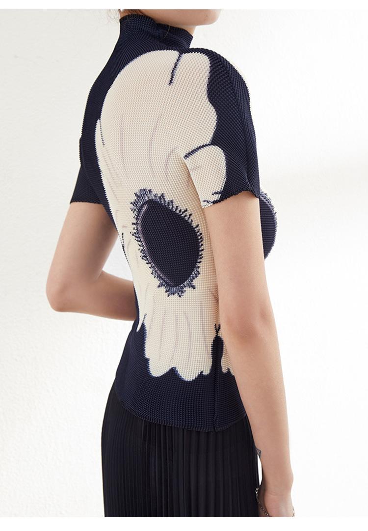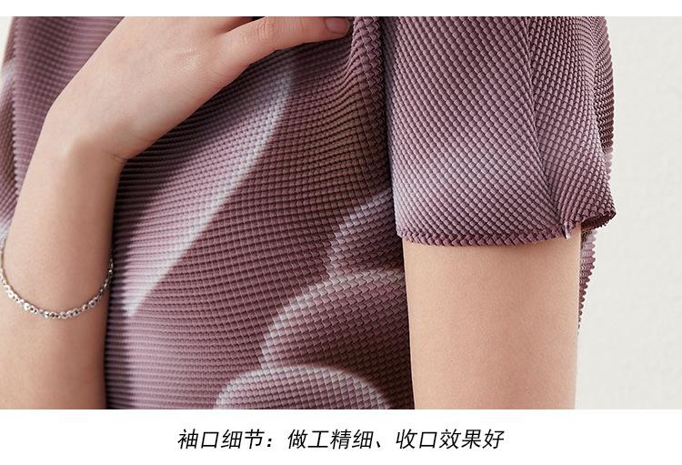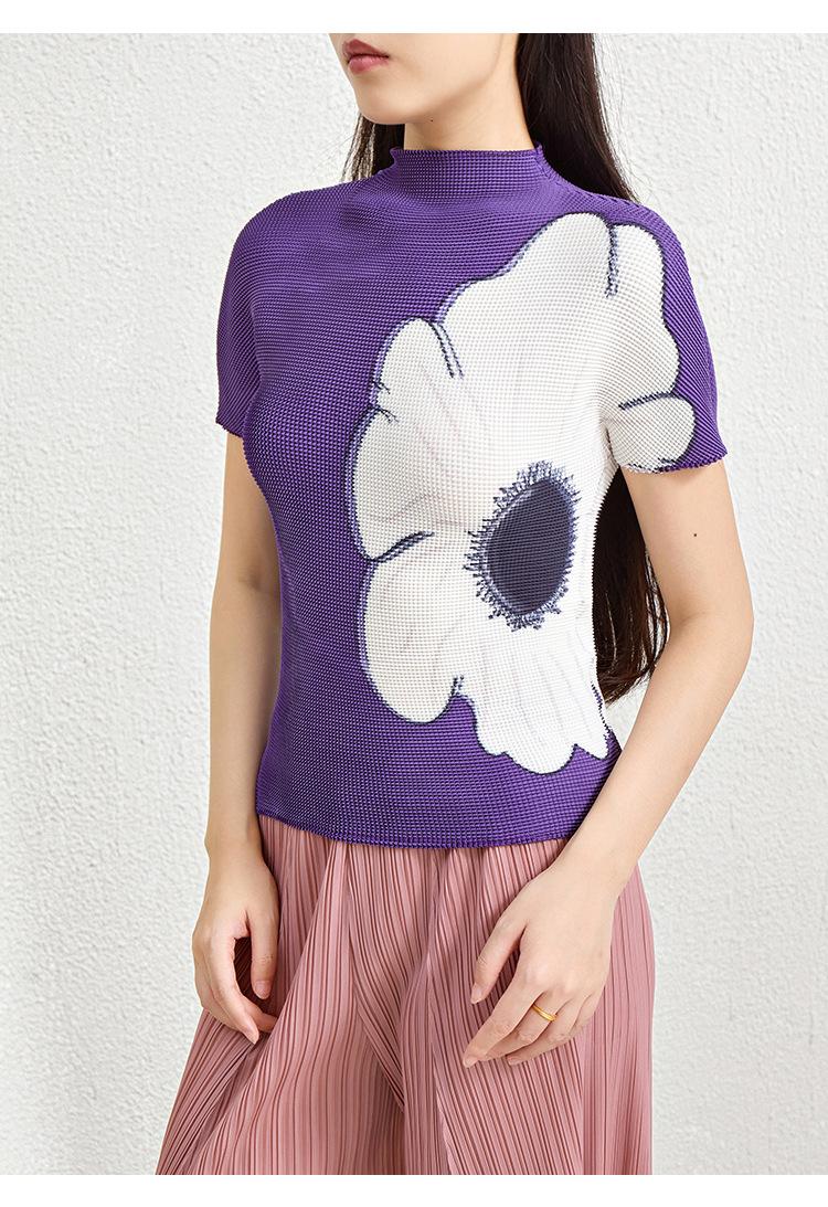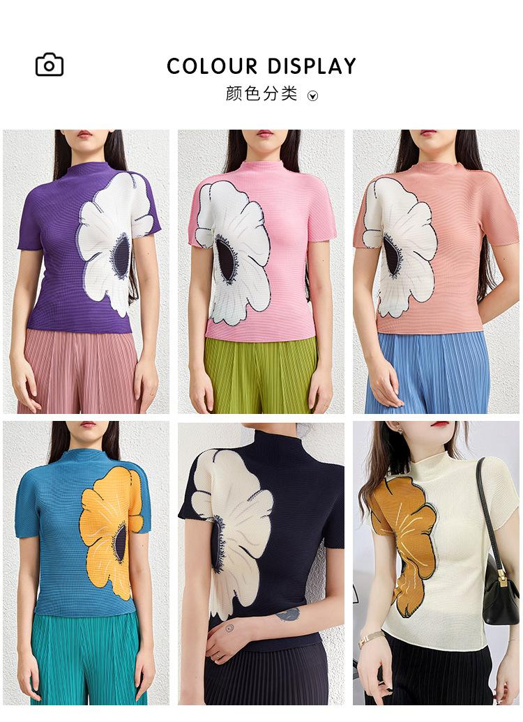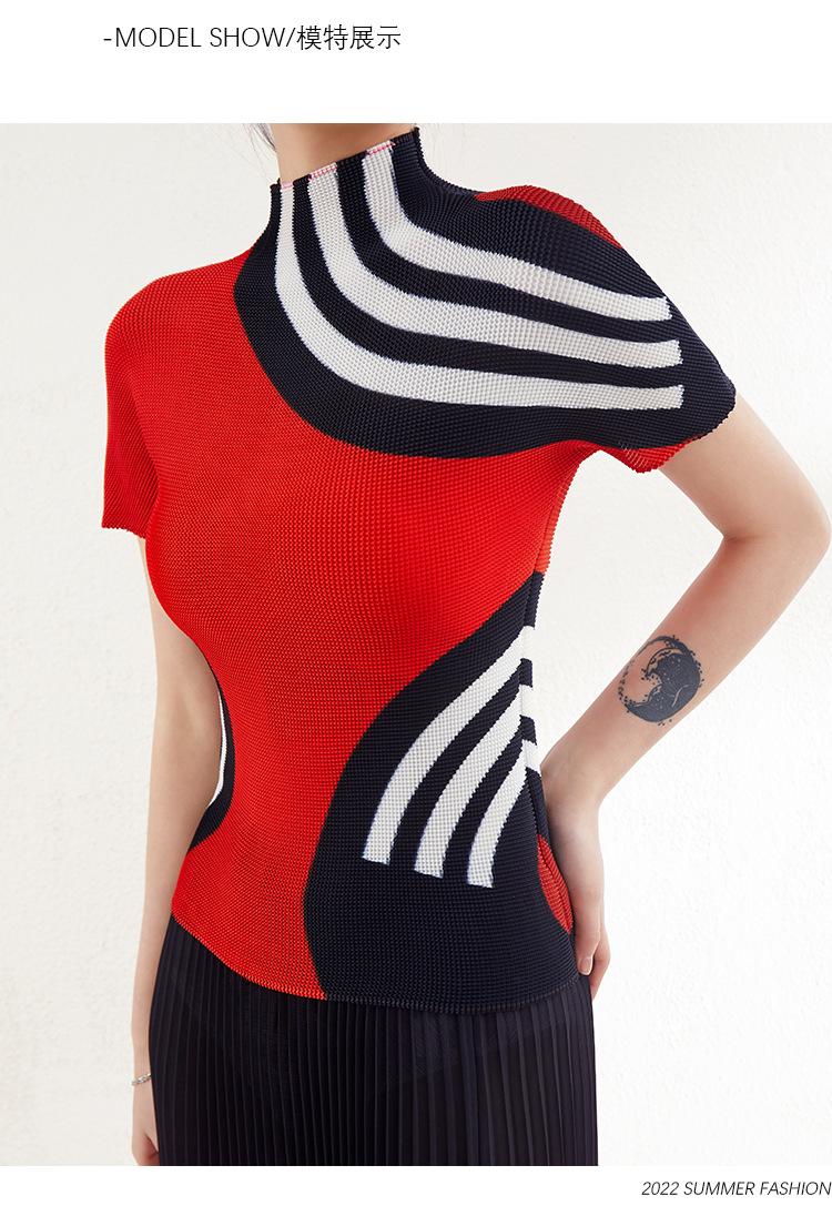 Miyake Top de Cuello de Manga Corta para Mujer Plisado Verano 2025 Nuevo Agradable al Tacto Alta Elasticidad Talla Grande Adelgazante Elegante Camisa de Gasa