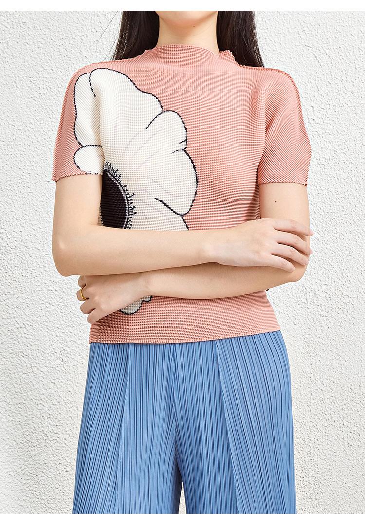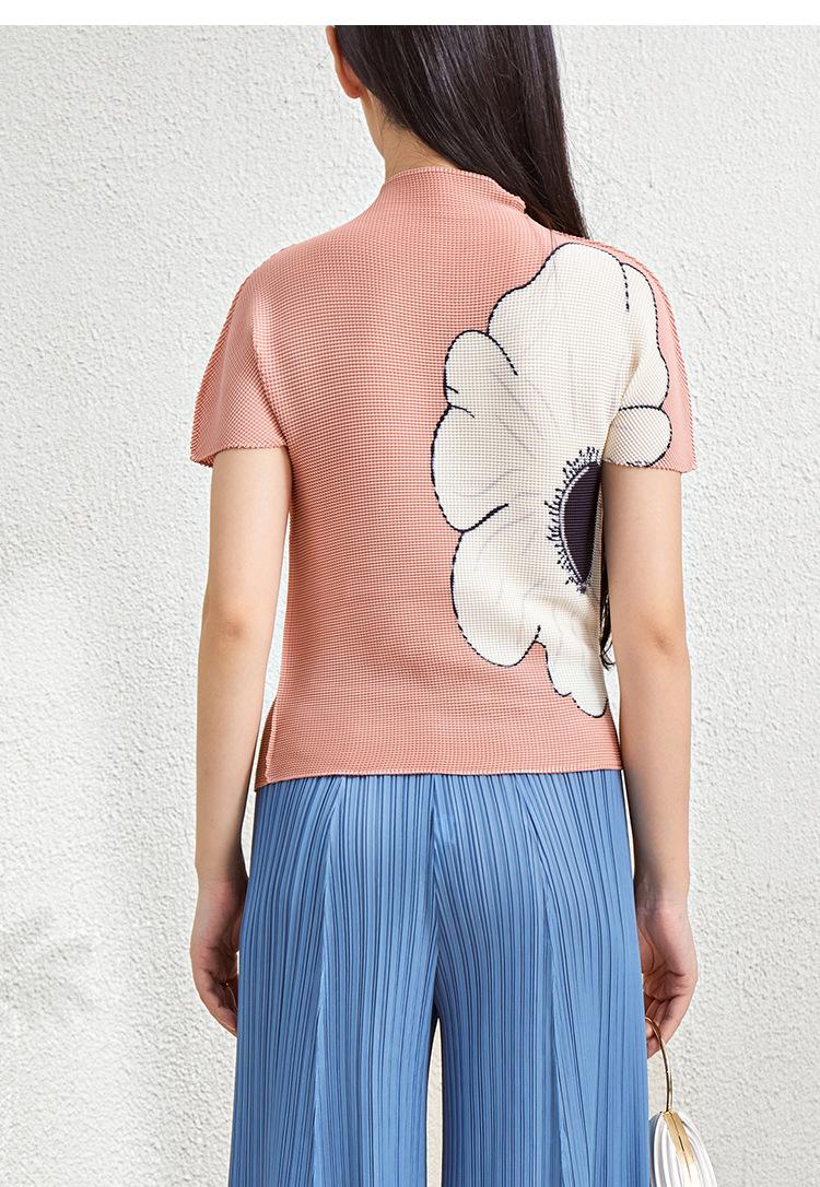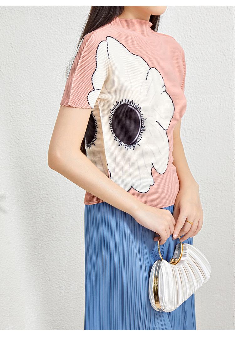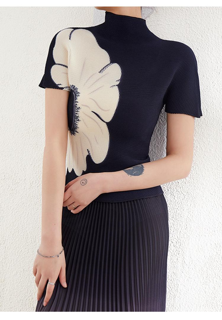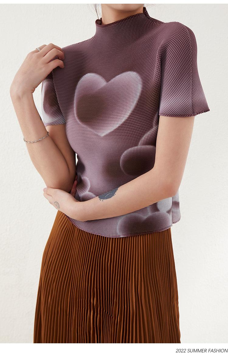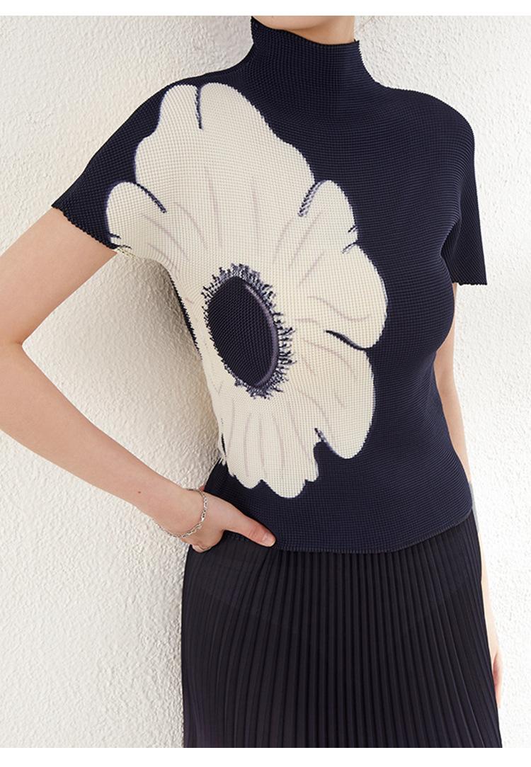 Miyake Top de Cuello de Manga Corta para Mujer Plisado Verano 2025 Nuevo Agradable al Tacto Alta Elasticidad Talla Grande Adelgazante Elegante Camisa de Gasa