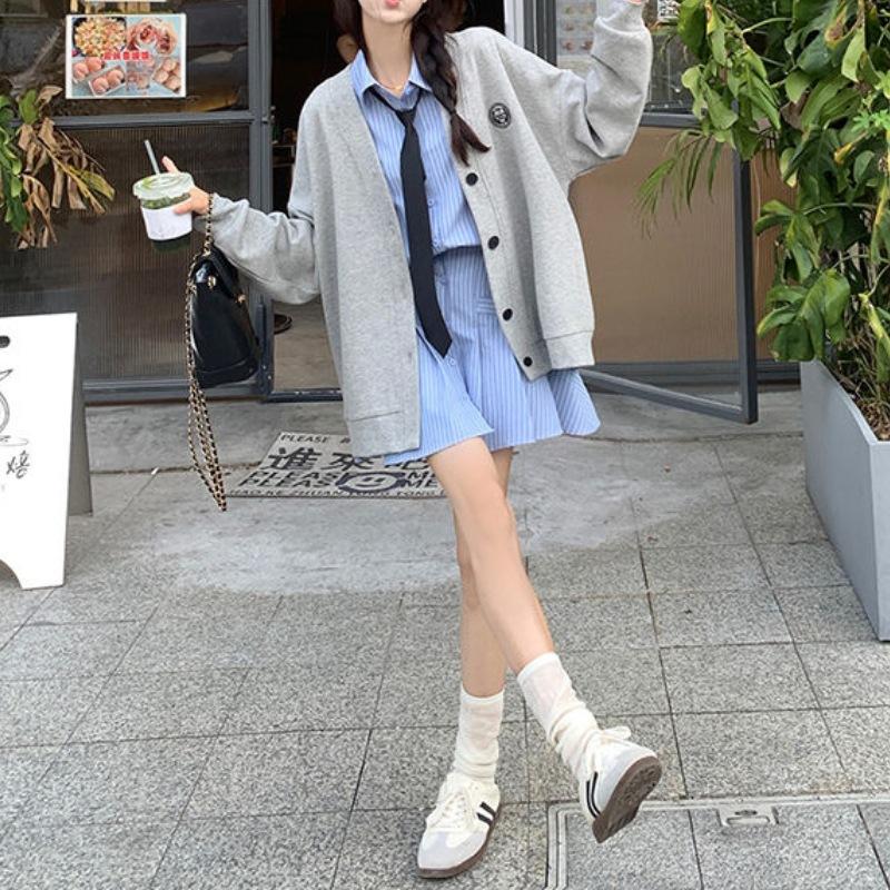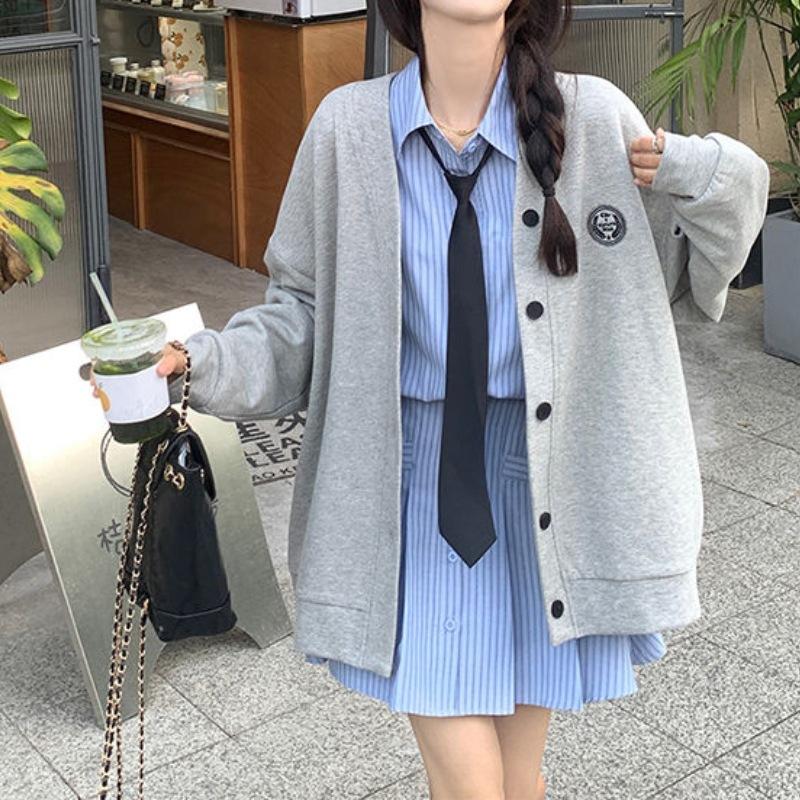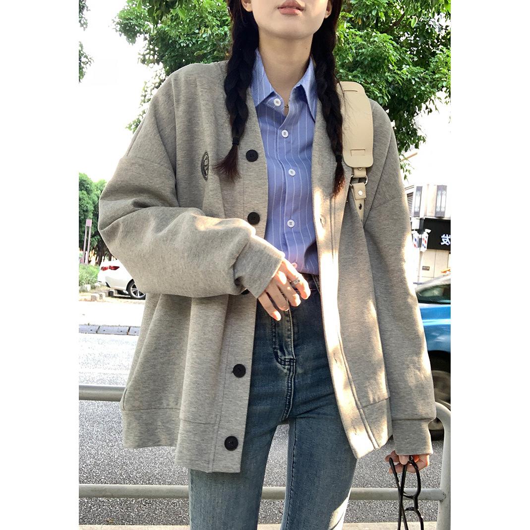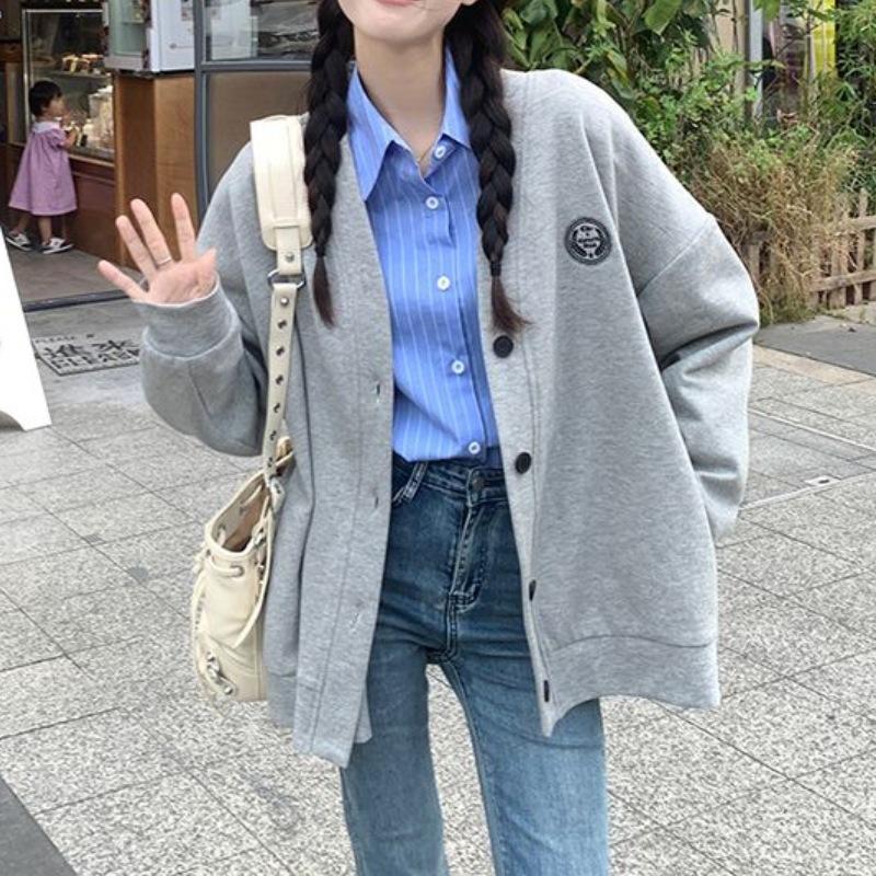 Chamarra Sudaderas Manga Larga Estilo Universitario para Mujer Primavera y Otoño 2025 Nuevo Diseño Sencillo Cuello en V Suelto Cárdigan Top Moderno