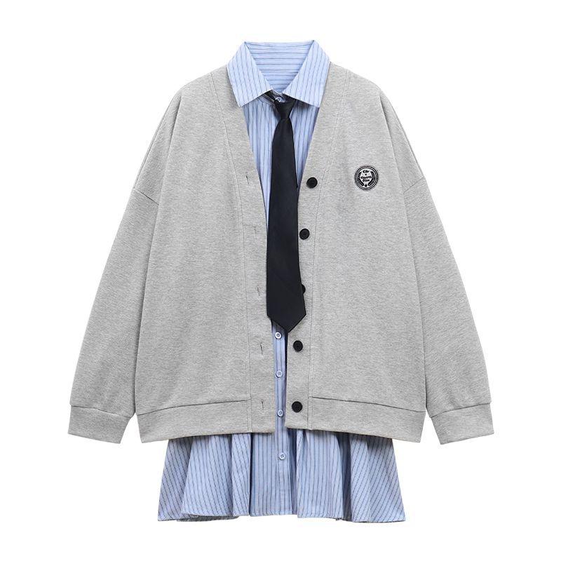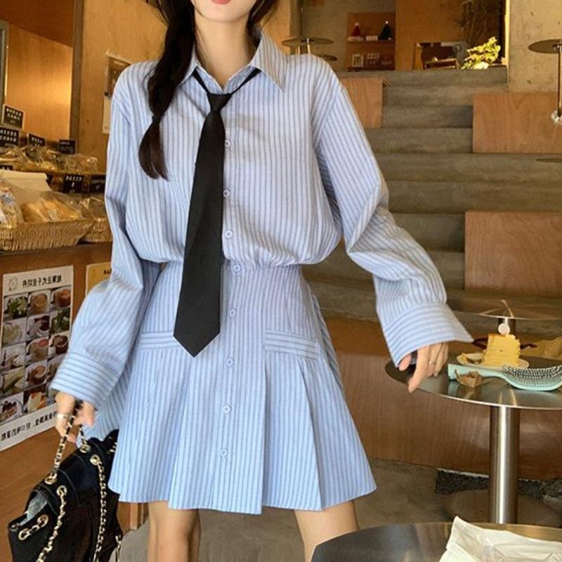 Blue stripe dress, Gray coat, Blue striped shirt, Gray Coat + Blue Stripes dress