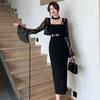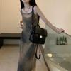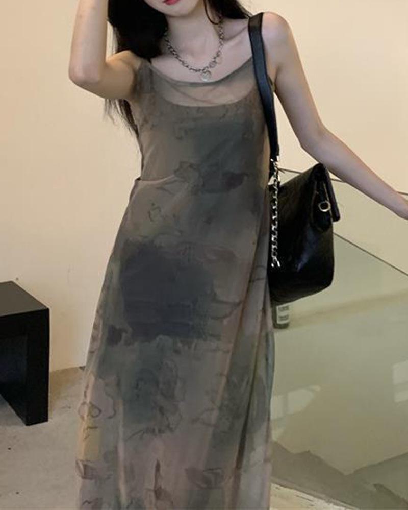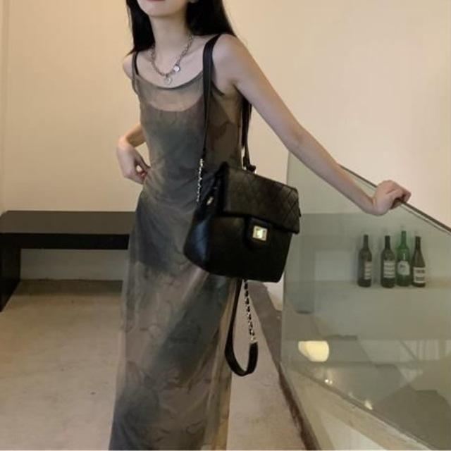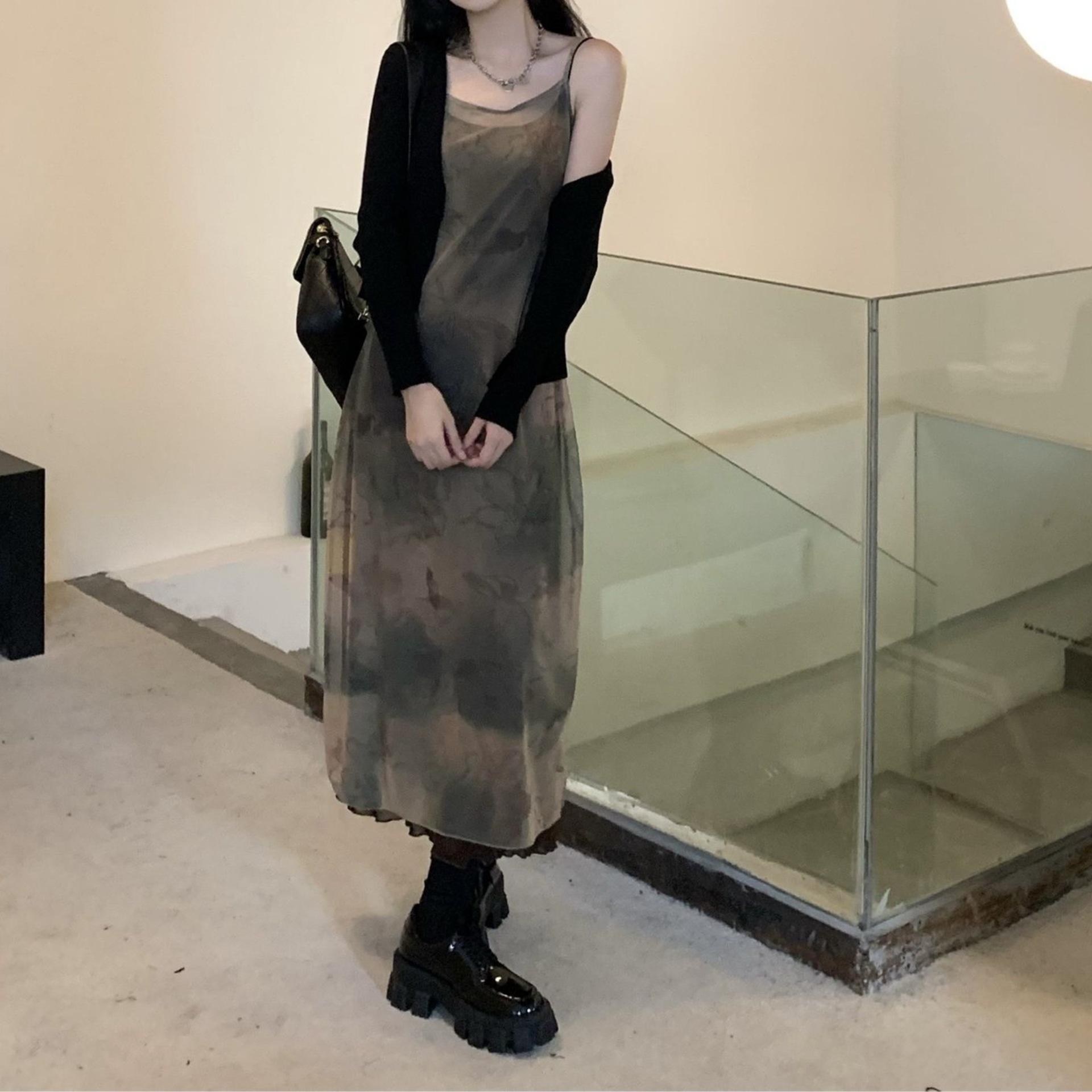 Vestido Coreano de Malla con Tirantes de Color Artístico Nicho 2025 con Diseño Tie-Dye + Traje Cárdigan Negro Versátil