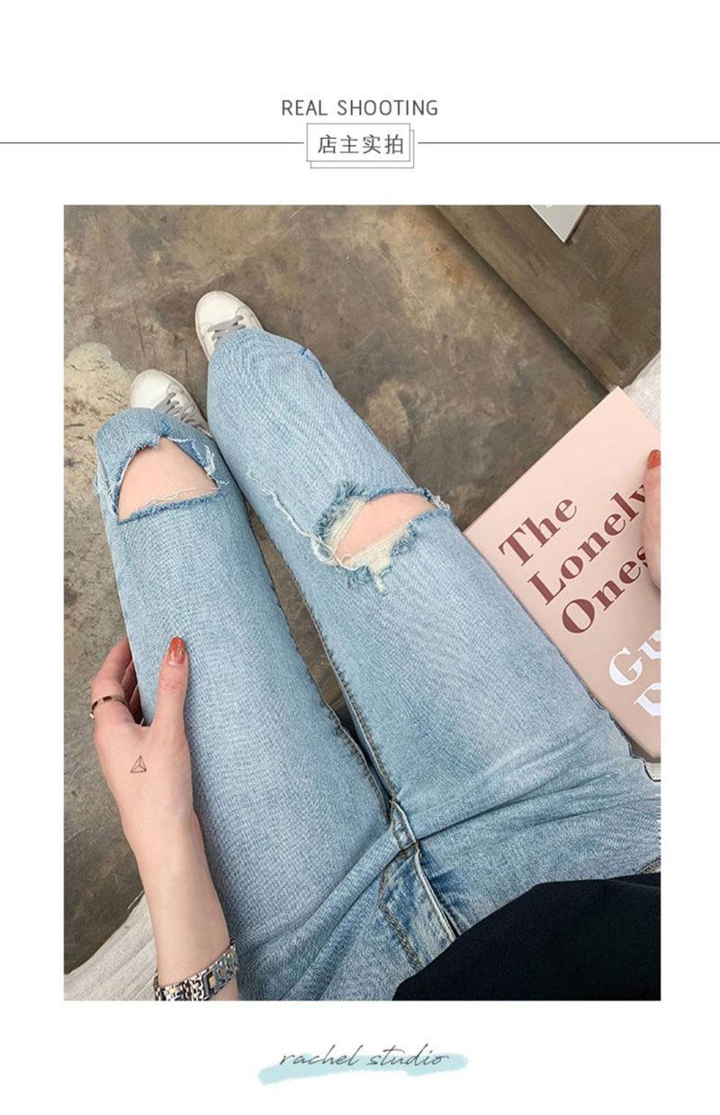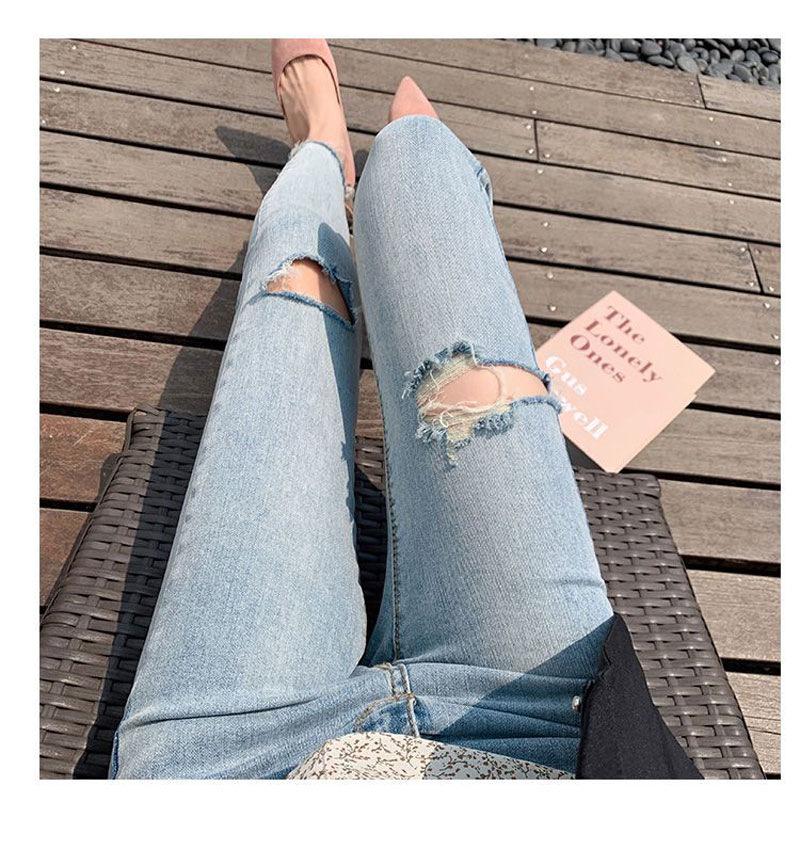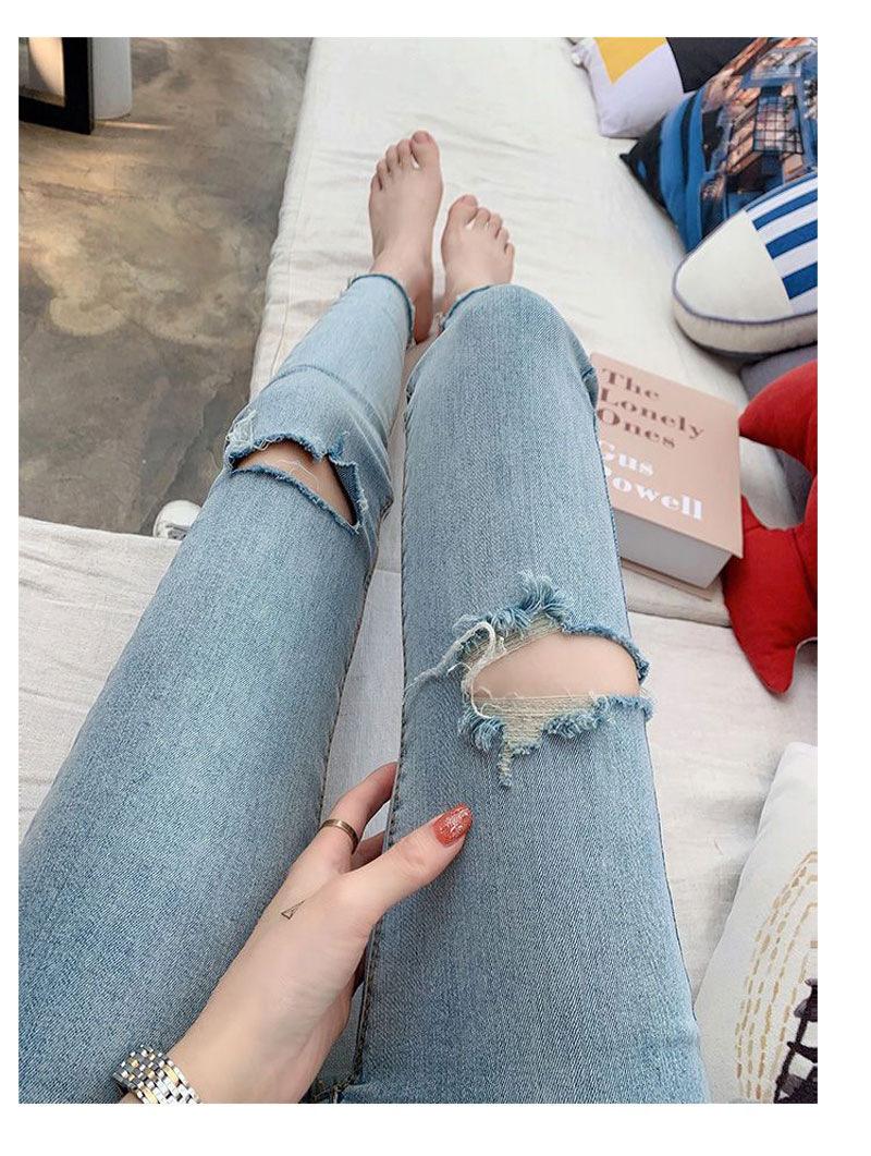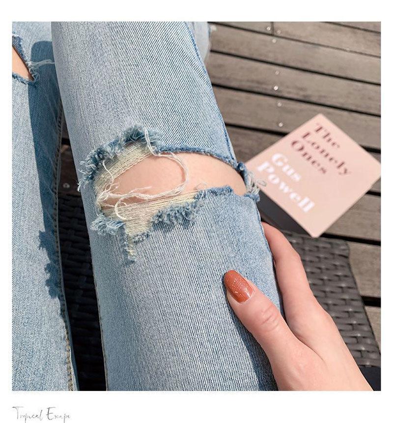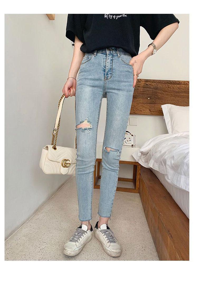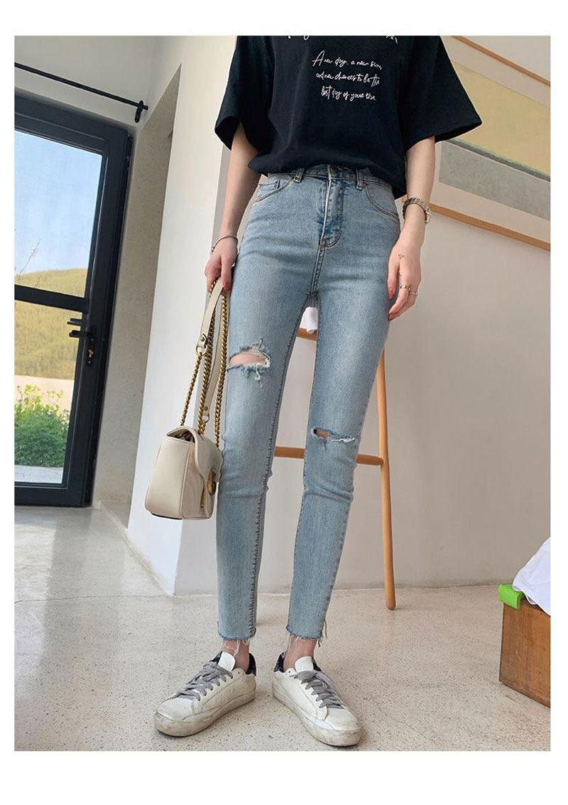 Pantalones vaqueros rotos de color claro para mujer, leggings ajustados elásticos finos de primavera y verano, pantalones de tubo a la moda hasta los tobillos de corte entallado.