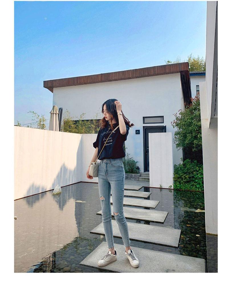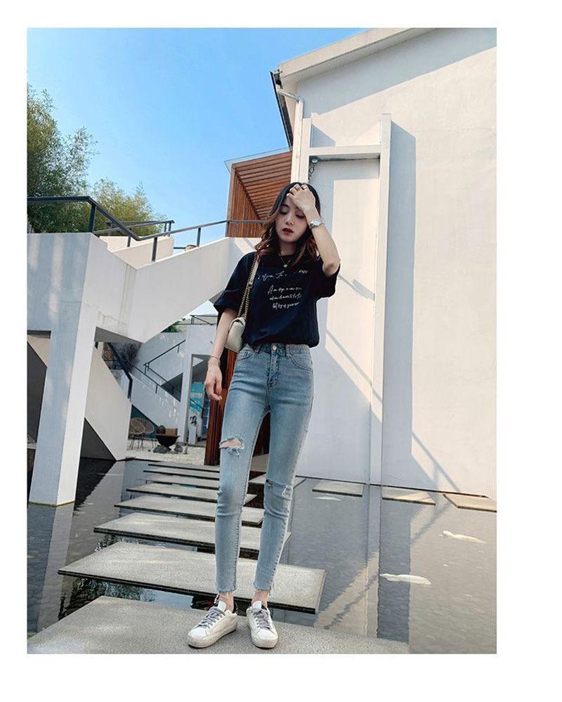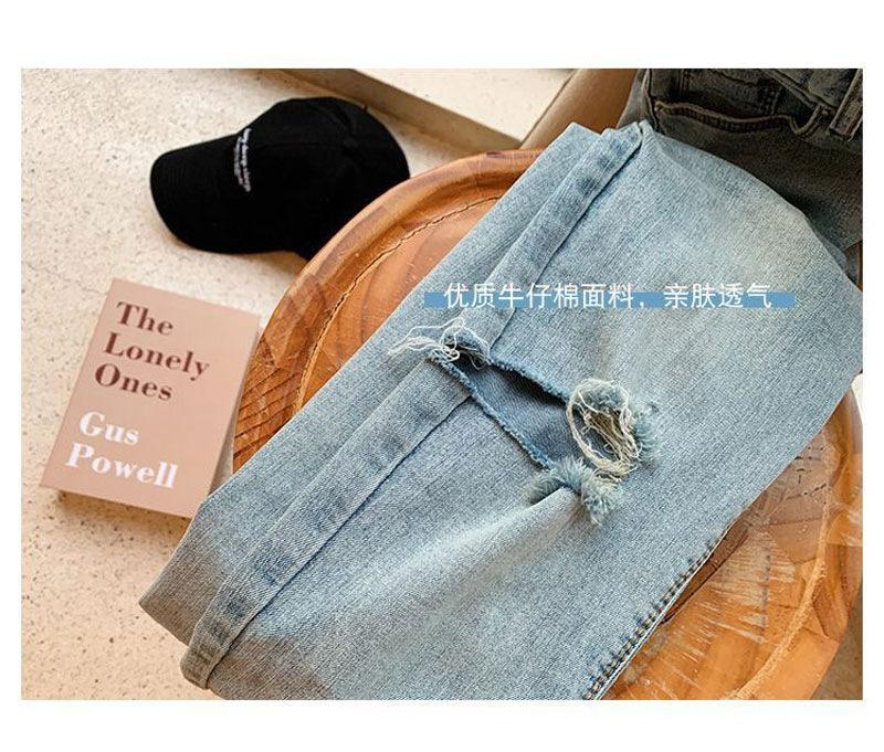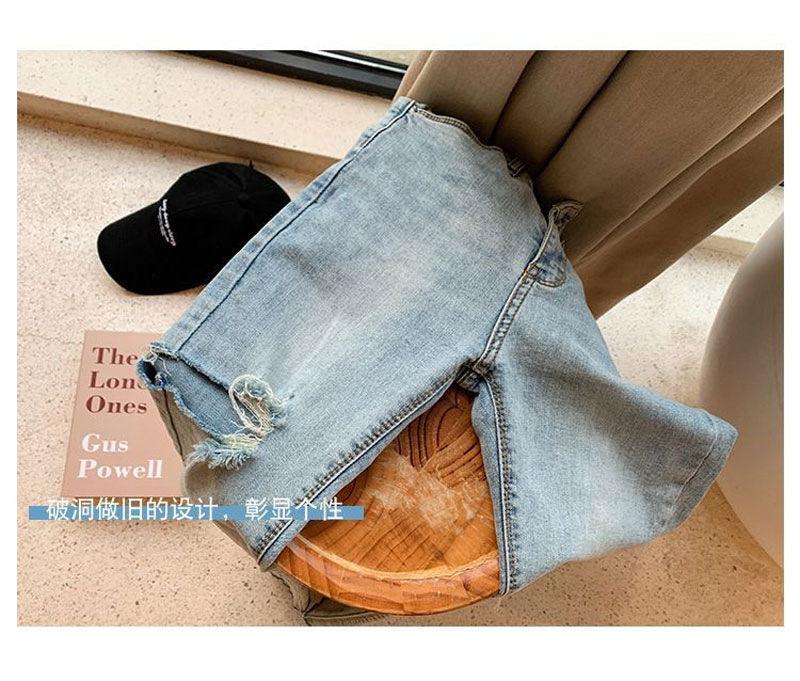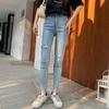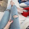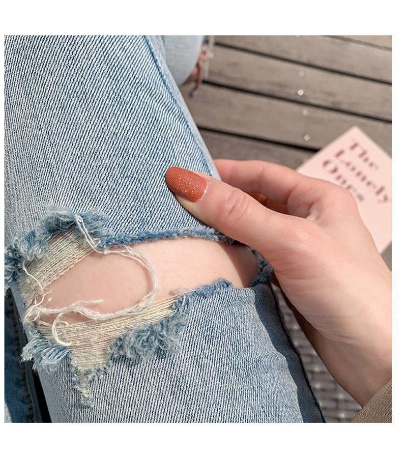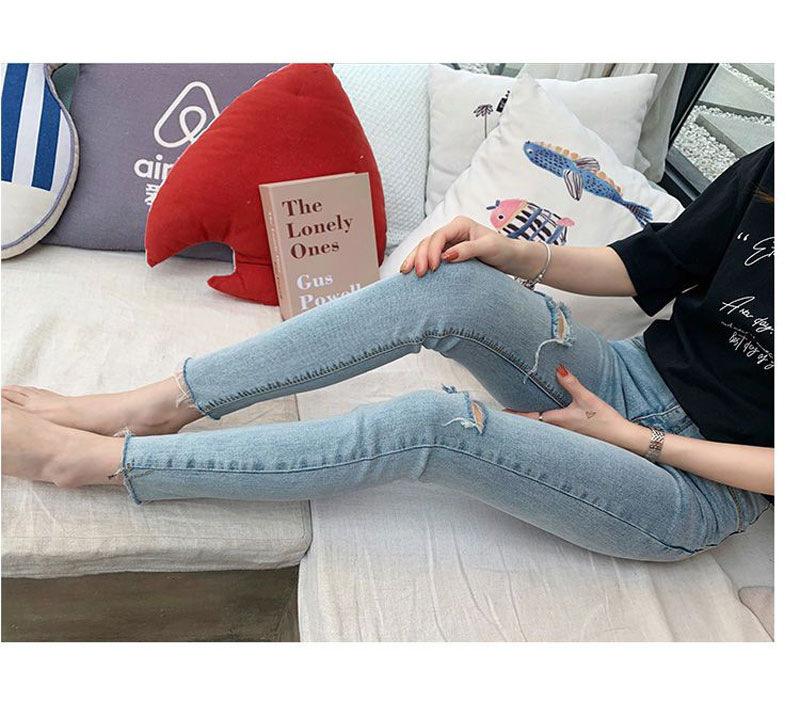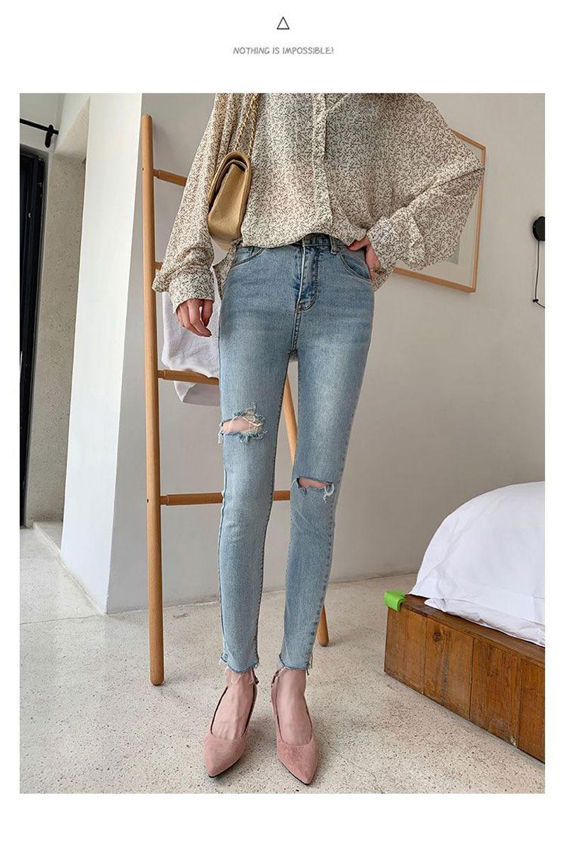 Pantalones vaqueros rotos de color claro para mujer, leggings ajustados elásticos finos de primavera y verano, pantalones de tubo a la moda hasta los tobillos de corte entallado.