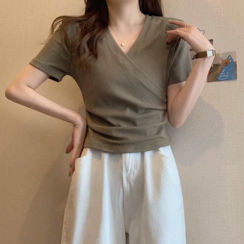 Nueva camiseta de manga corta con escote en V cruzado en los hombros para mujer, prenda exterior de verano, ajustada y a la moda.