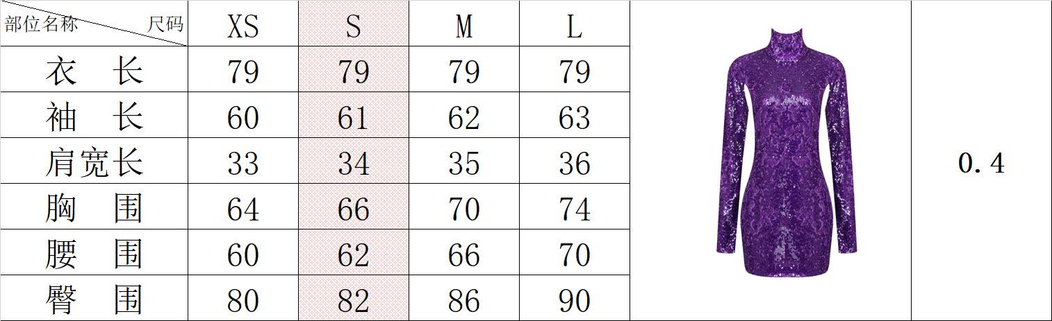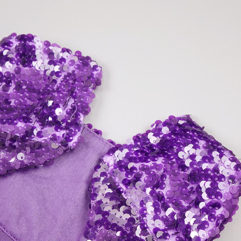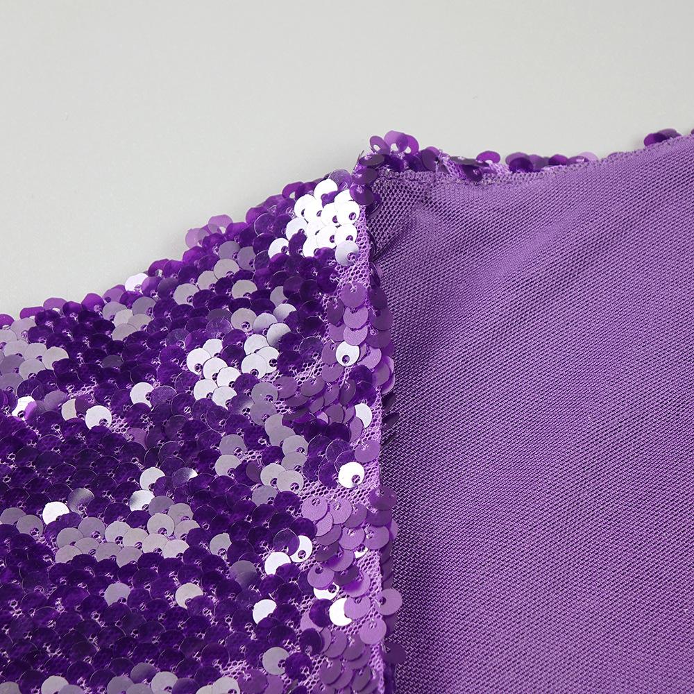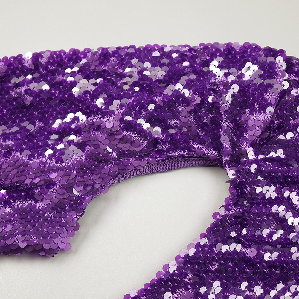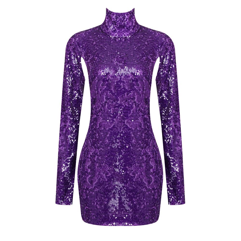 Vestido de Fiesta Nuevo para Mujer Sexy Ajustado con Lentejuelas Moradas Europeas y Americanas, Cuello Redondo, Espalda Descubierta, Manga Larga, Verano