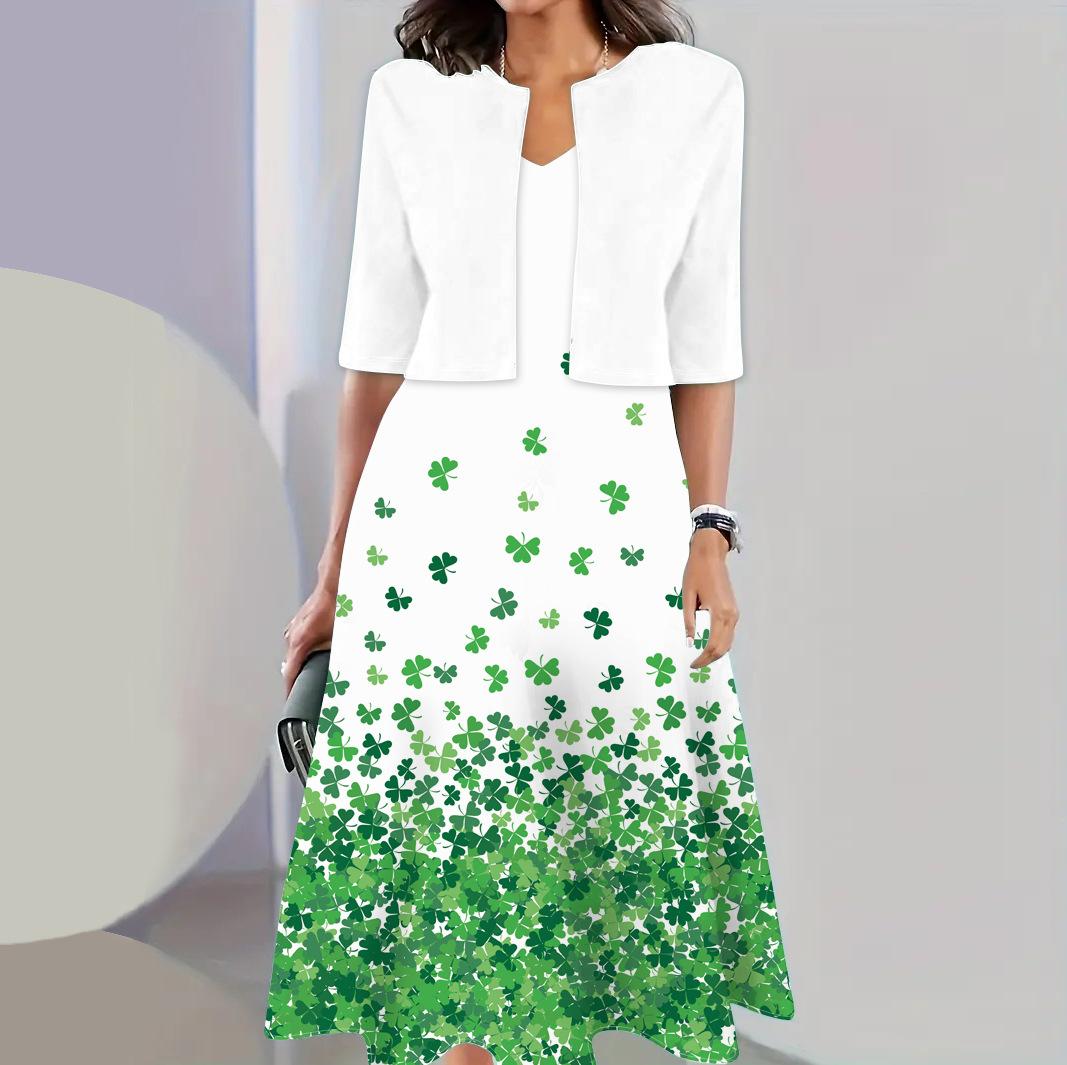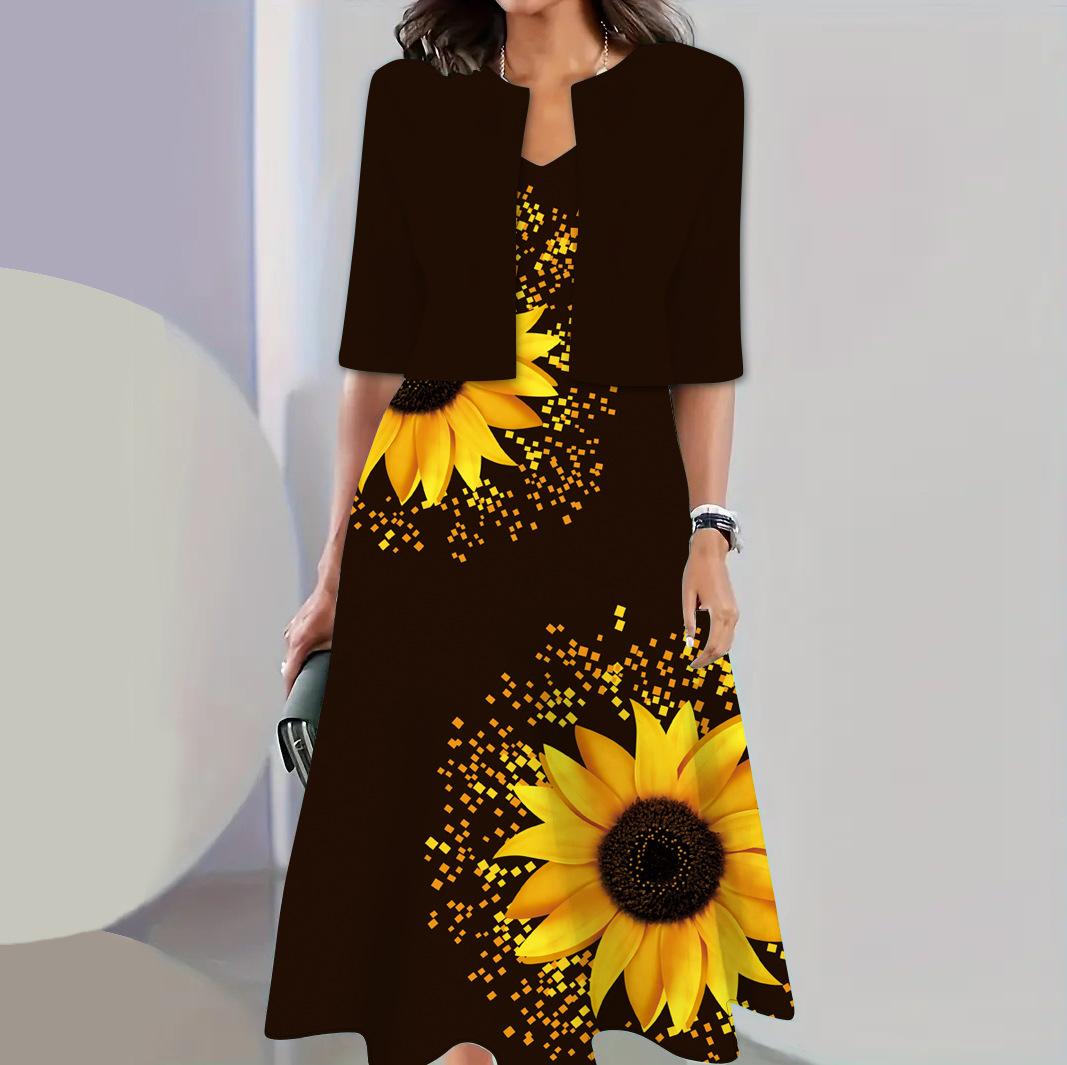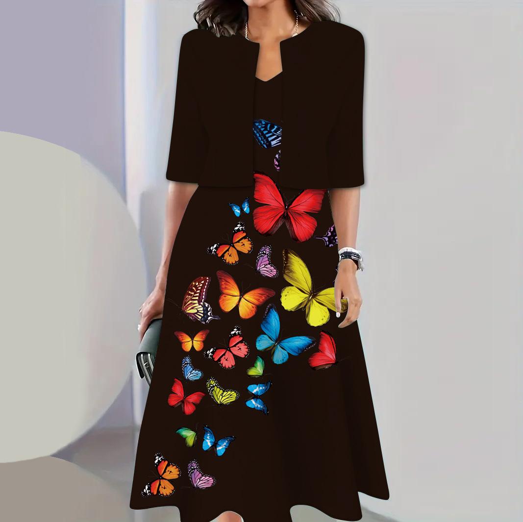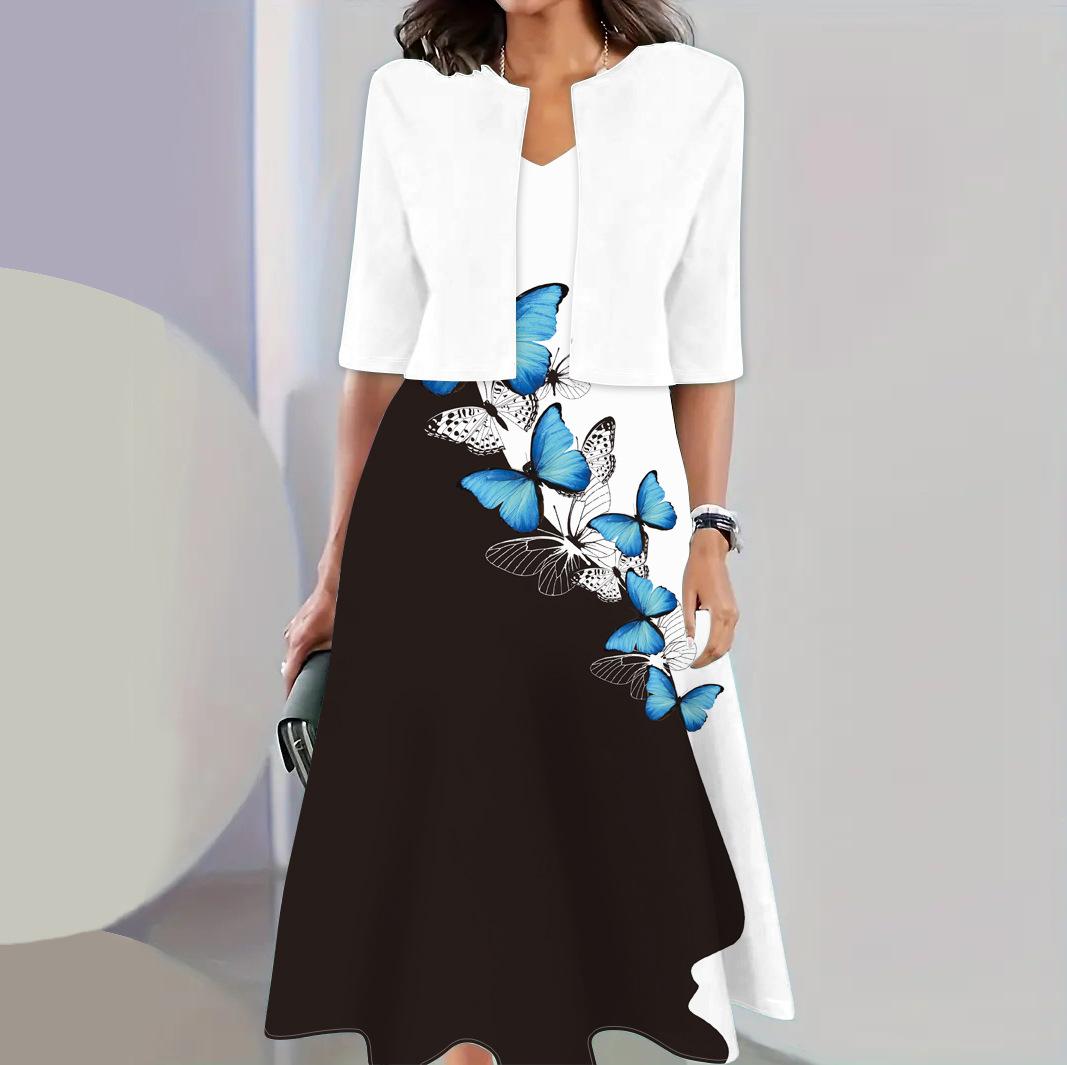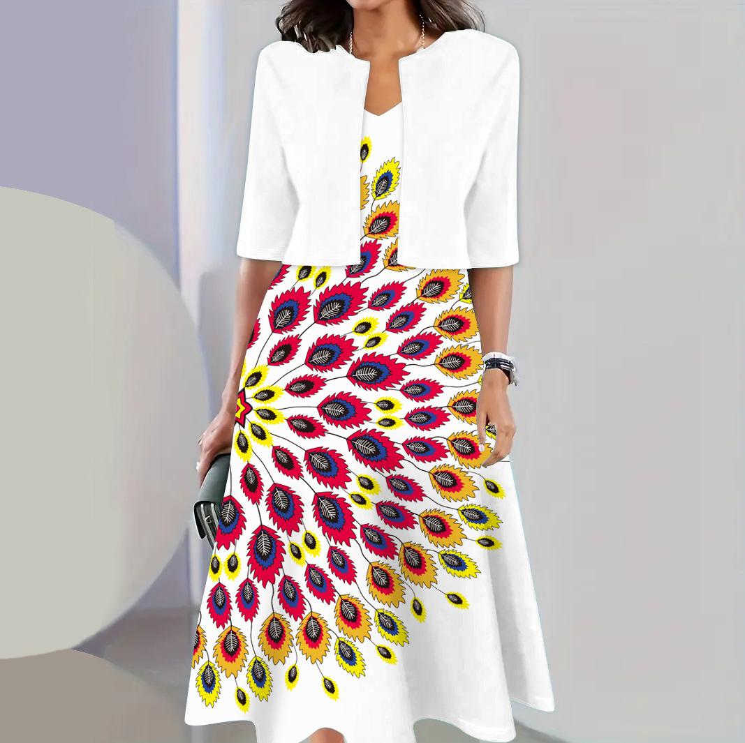 Conjunto de dos piezas de vestido y abrigo de cuello redondo con estampado 3D para mujer, otoño 2024, Amazon, Europa y América