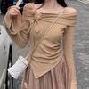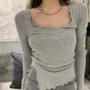 Camiseta de punto con cuello cuadrado y puños con abertura estilo francés, otoño 2023, nueva camiseta de manga larga ajustada de color liso para mujer