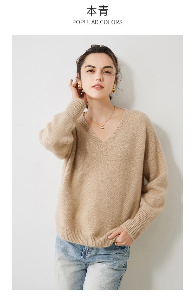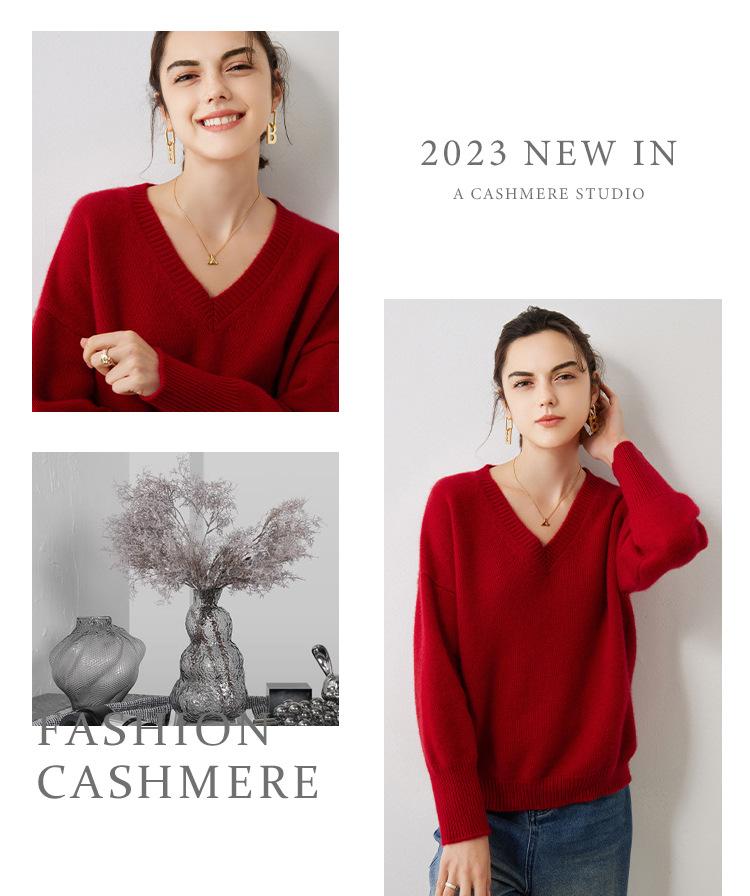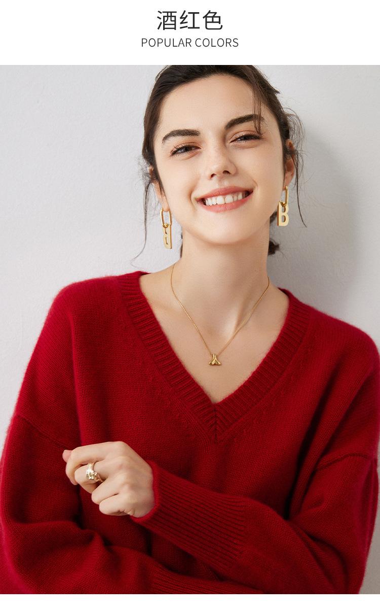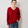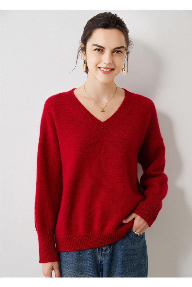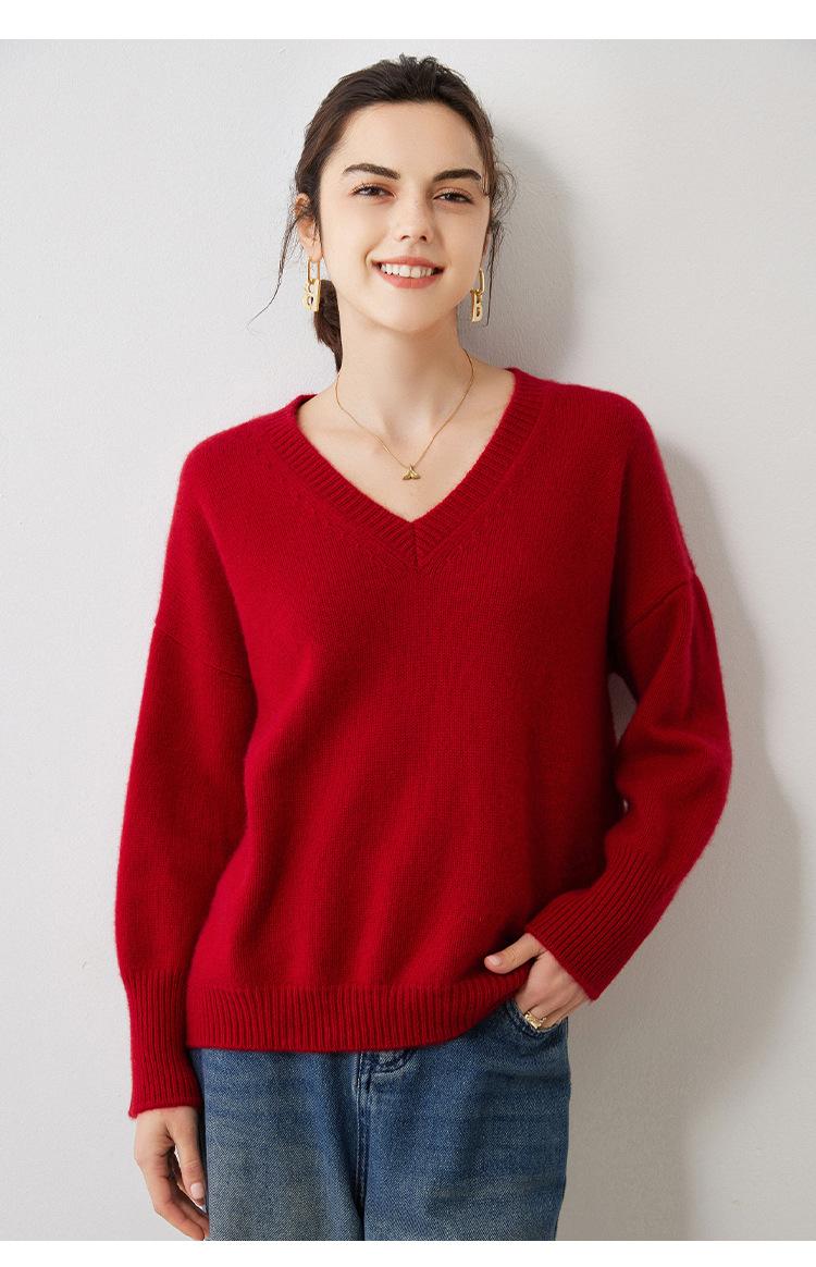 Suéter de cachemira suelto de color sólido con cuello en V para otoño e invierno, suéter de cachemira pura roja gruesa para mujer, suéter con cuello de corazón de pollo