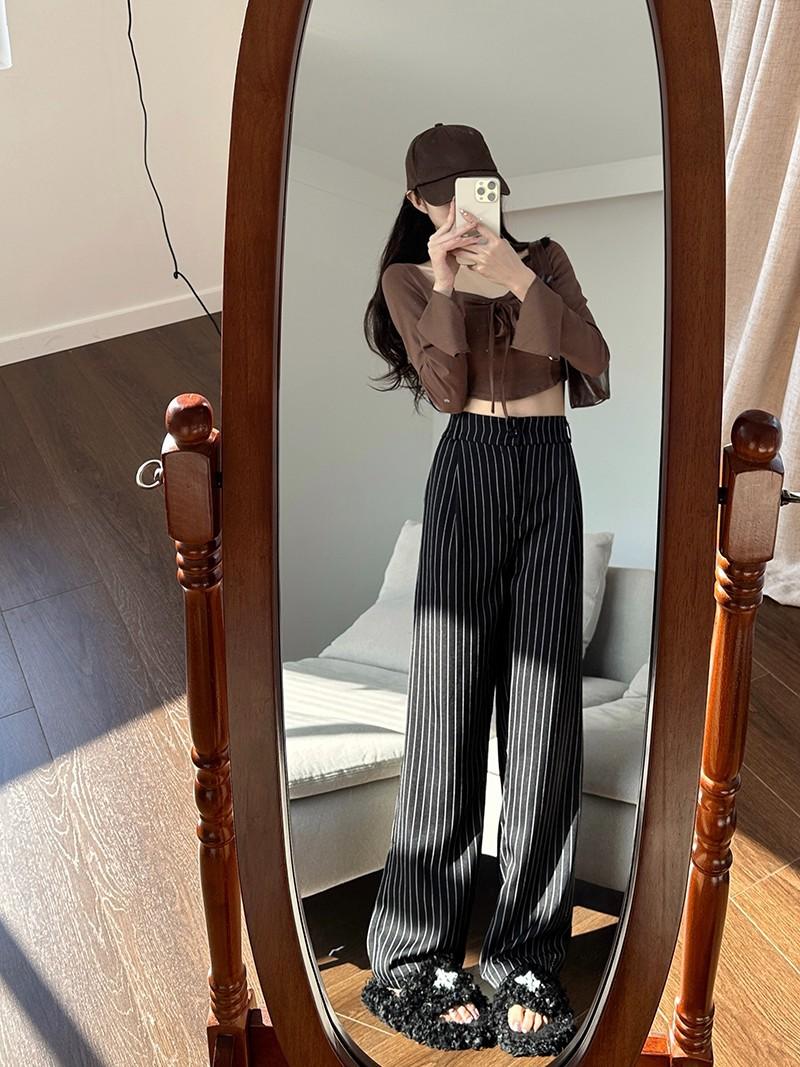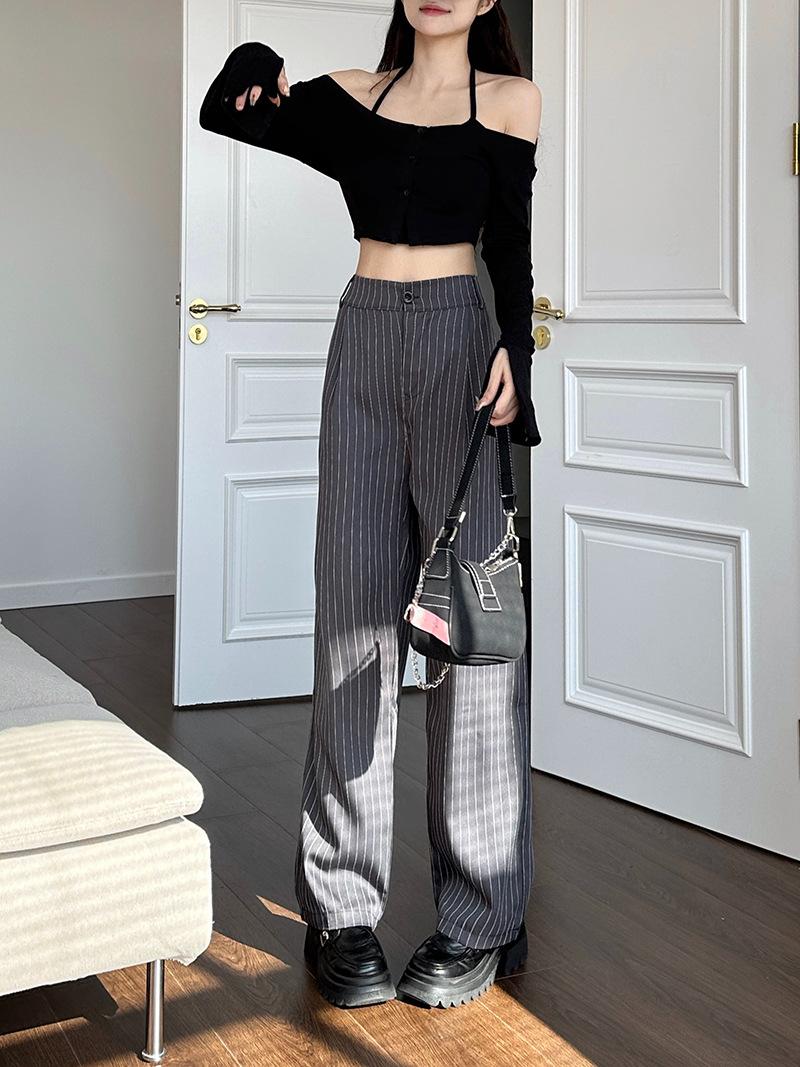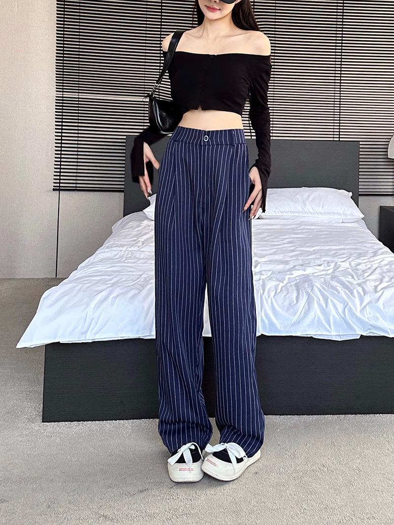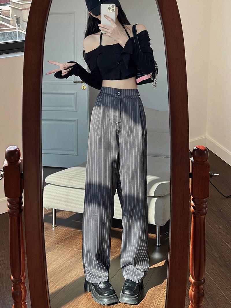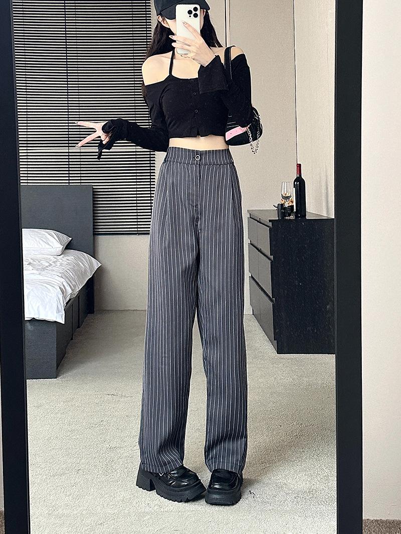 Pantalones anchos a rayas para mujer, de verano, finos, de alta gama, sueltos, de cintura alta, adelgazantes, drapeados, negros, rectos, nuevos pantalones de traje de otoño