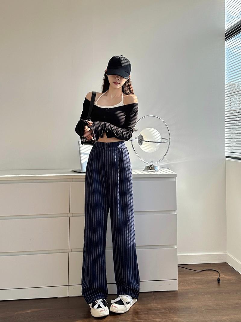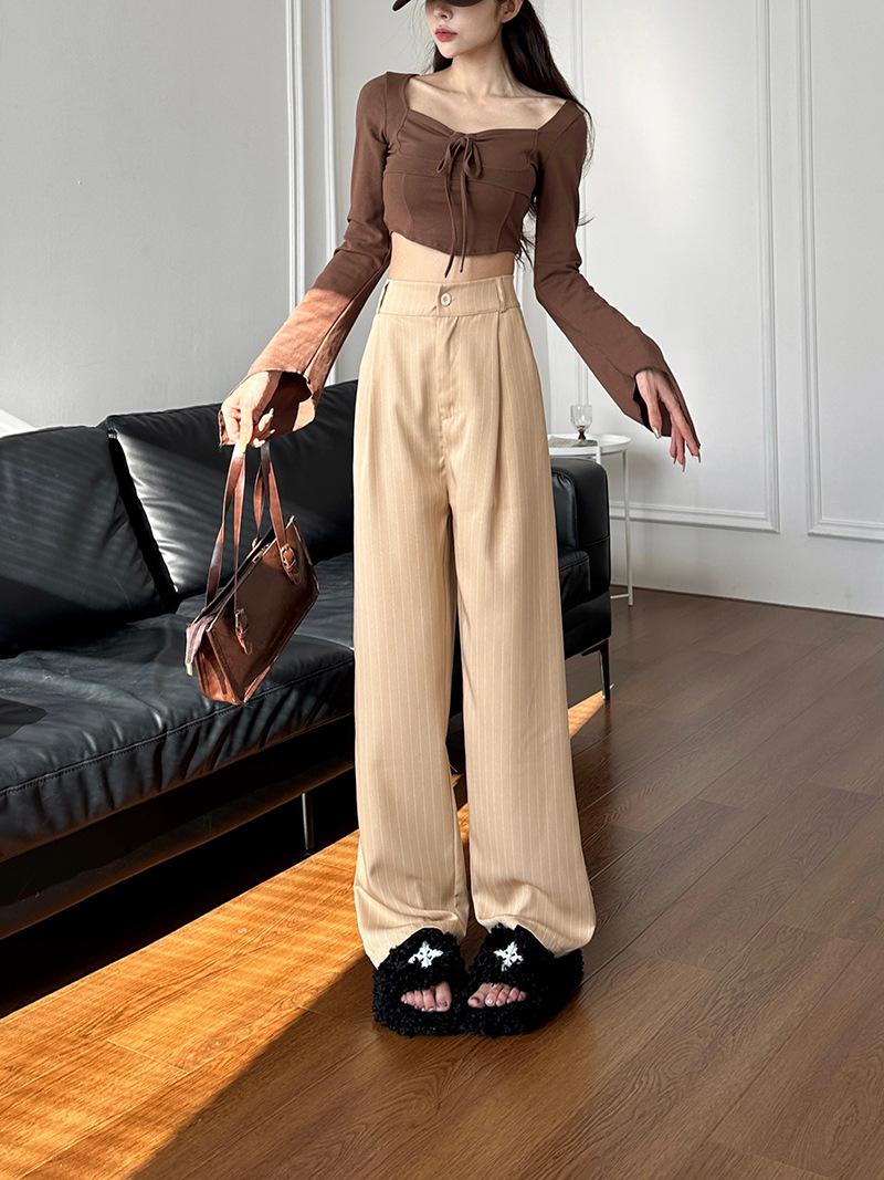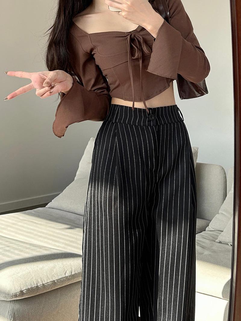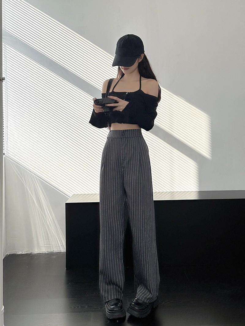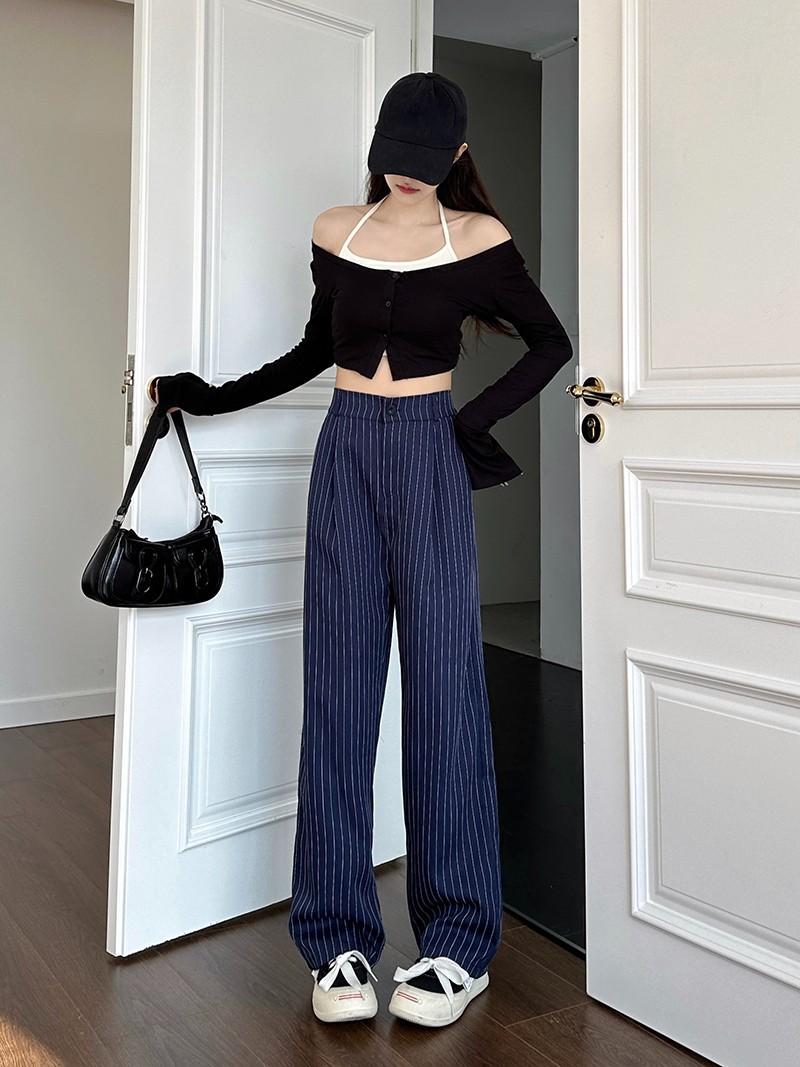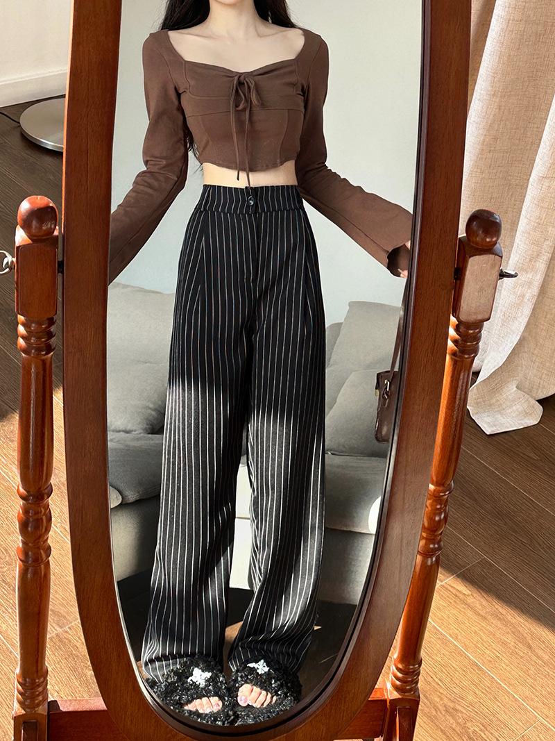 Pantalones anchos a rayas para mujer, de verano, finos, de alta gama, sueltos, de cintura alta, adelgazantes, drapeados, negros, rectos, nuevos pantalones de traje de otoño