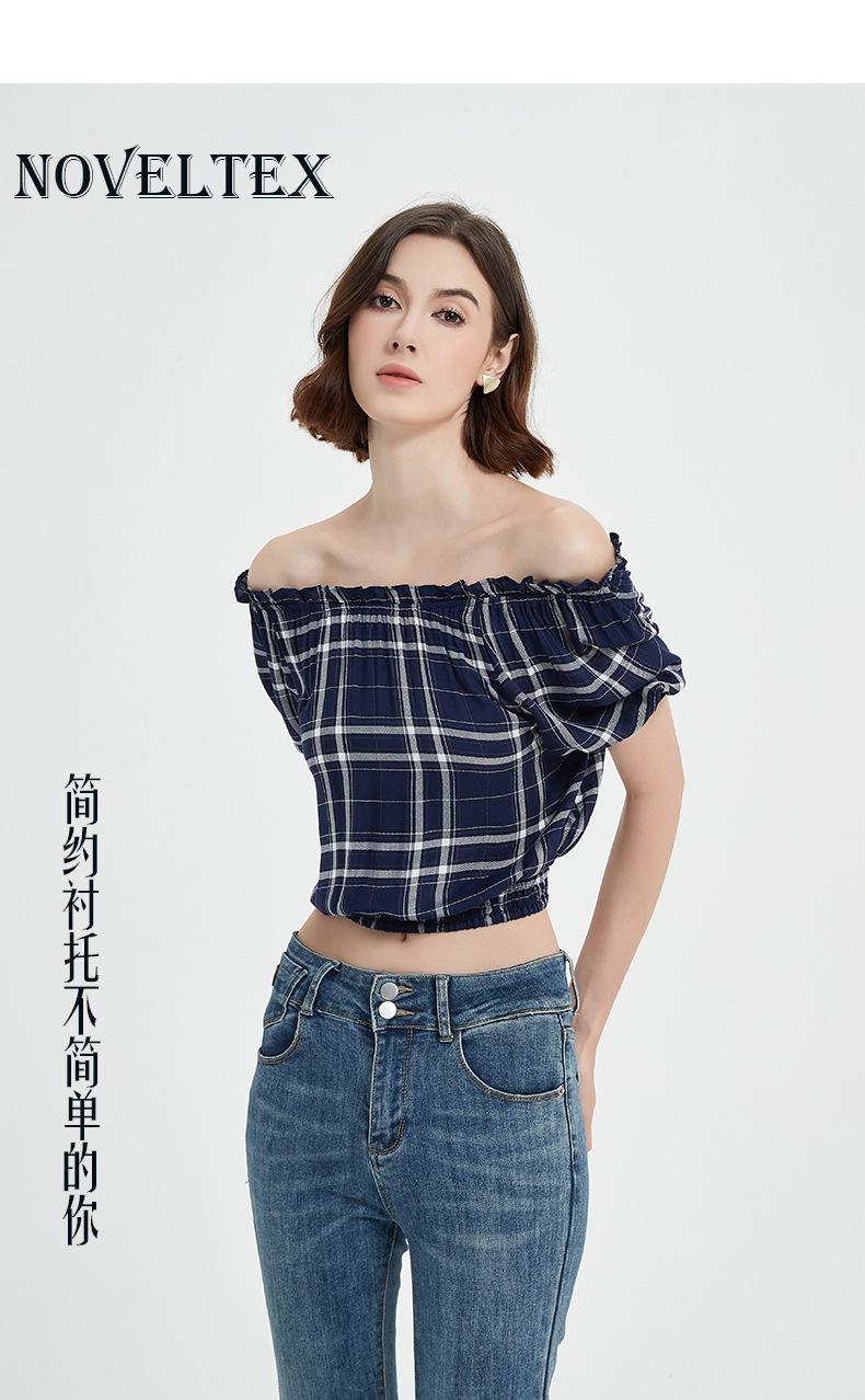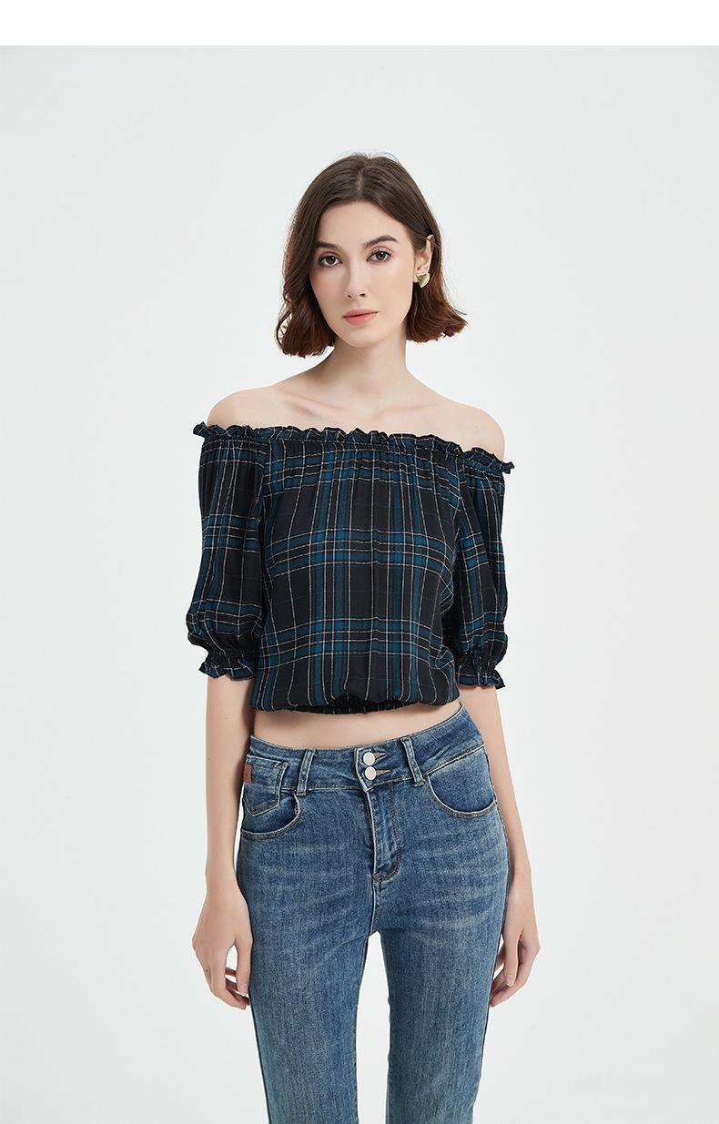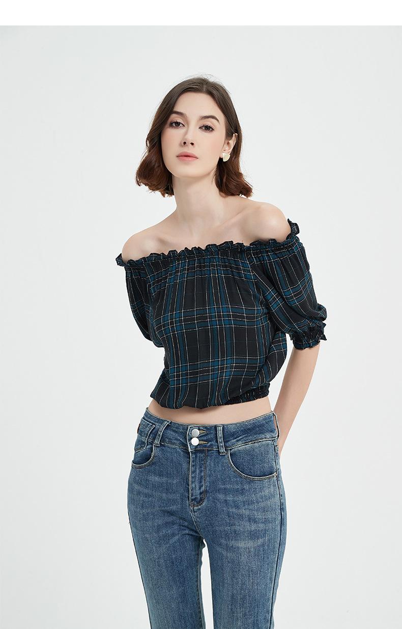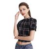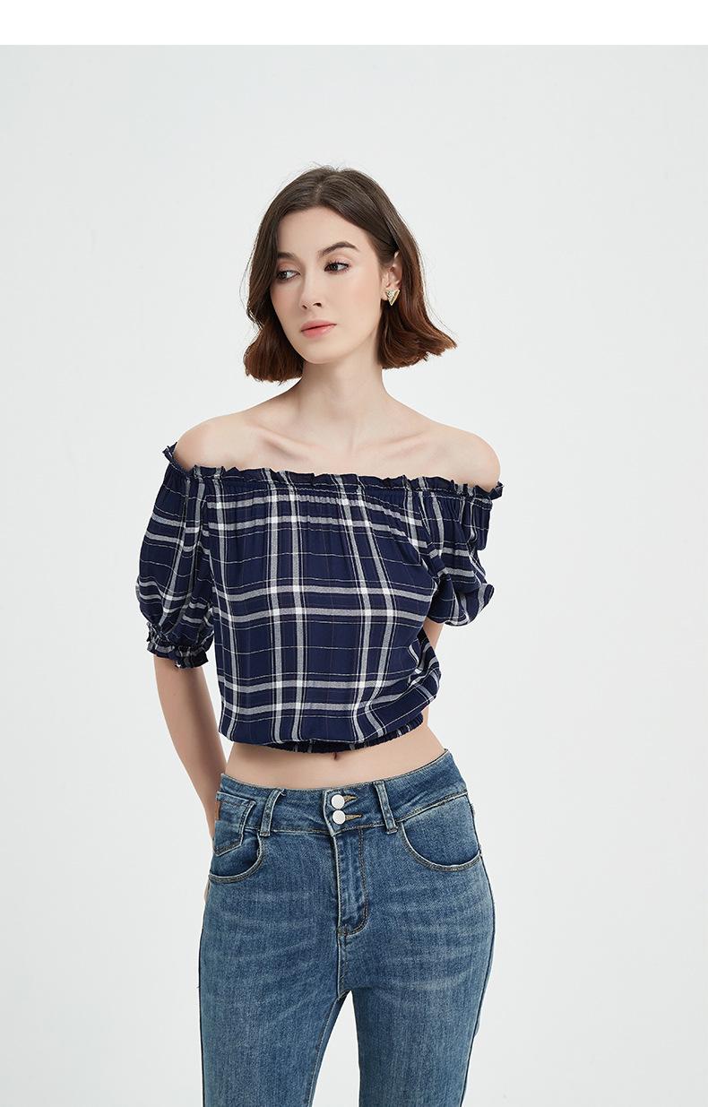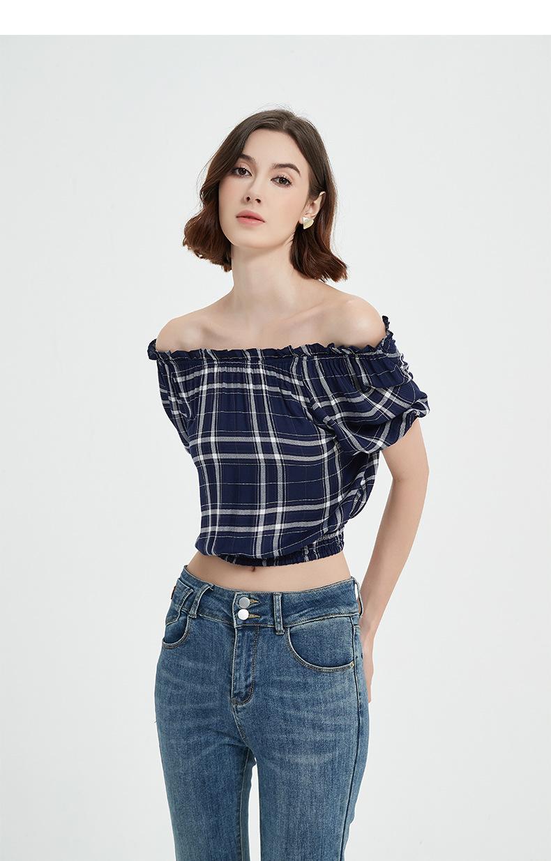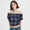 Camisa a cuadros retro de manga corta con hombros descubiertos, estilo Spice Girl, estilo europeo y americano, sexy, de cintura alta y cuello de una línea para mujer