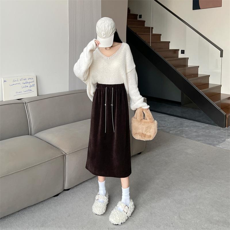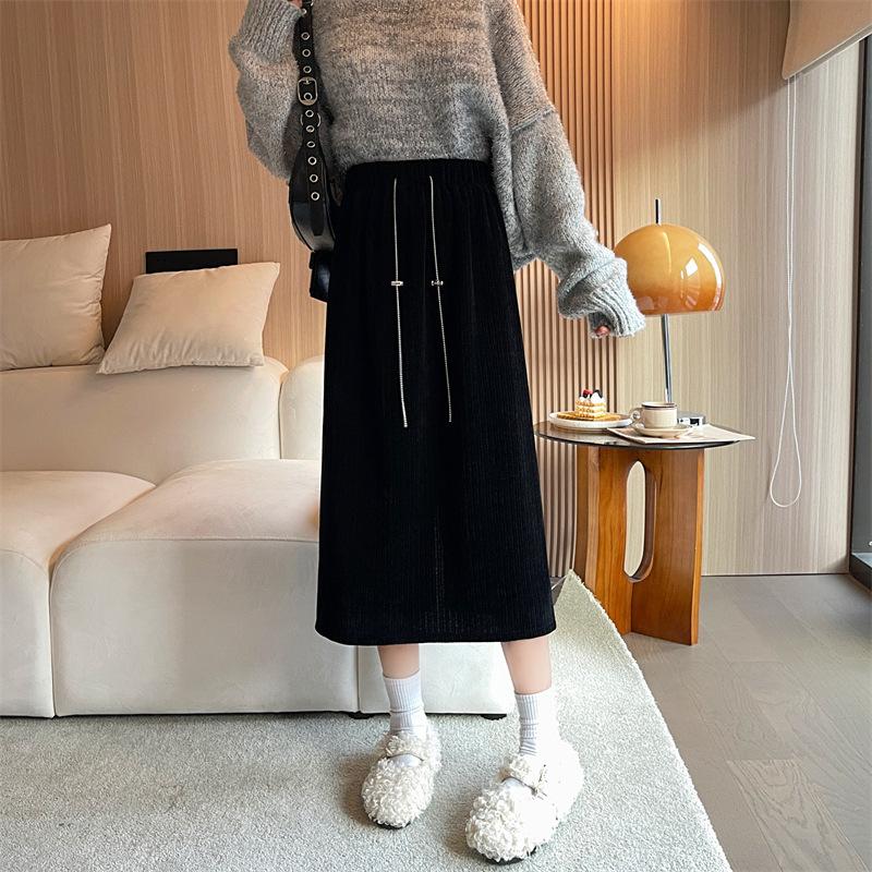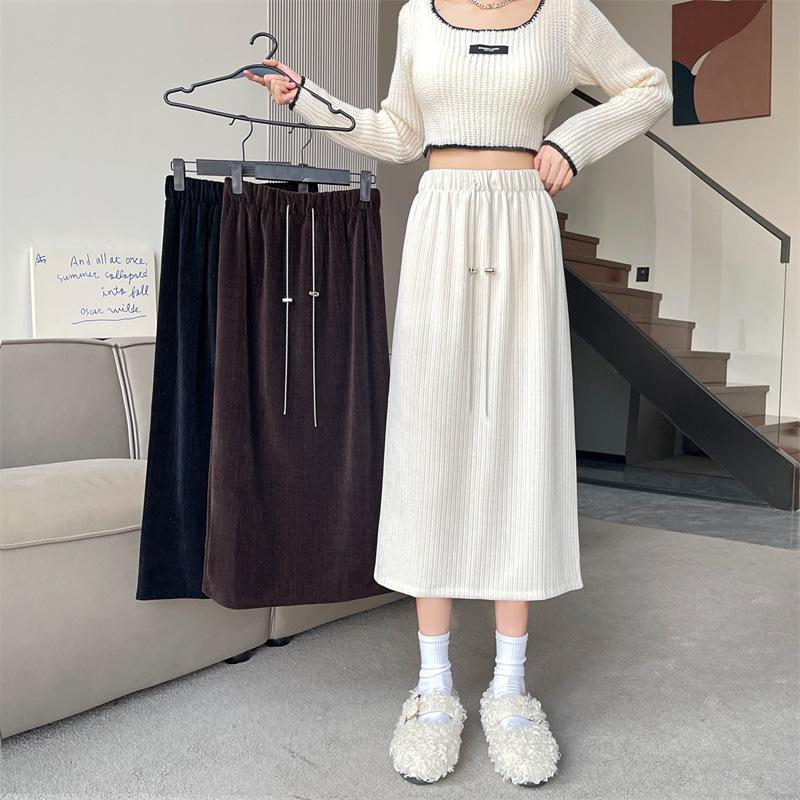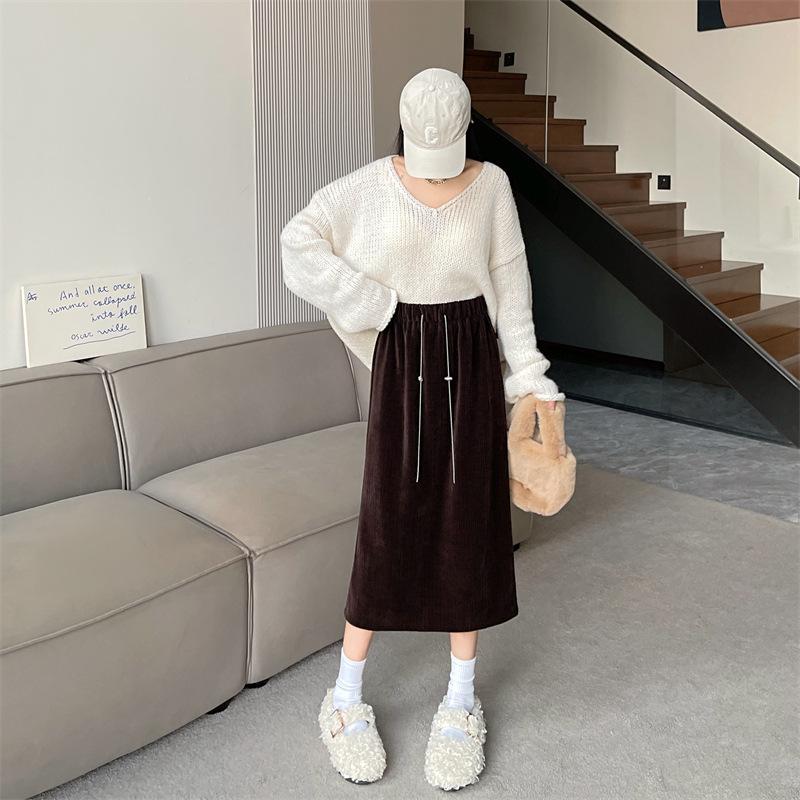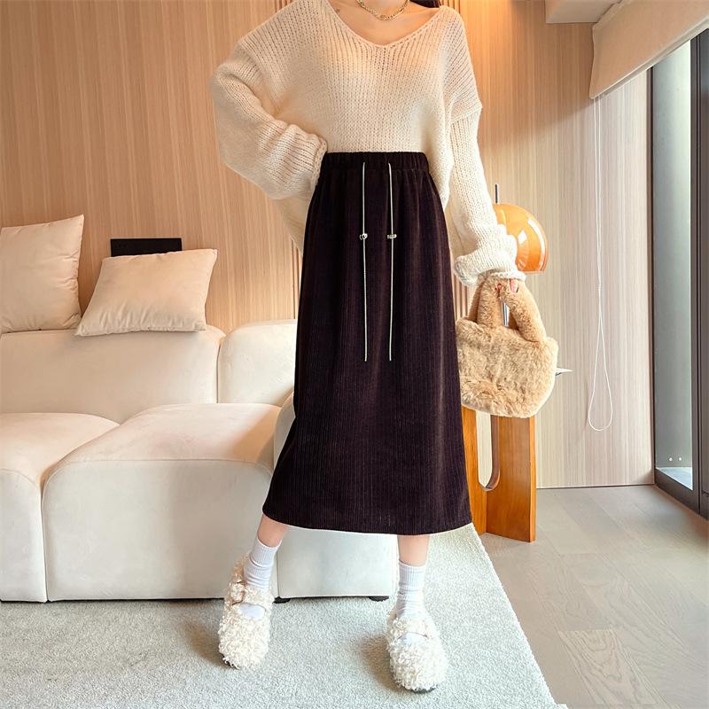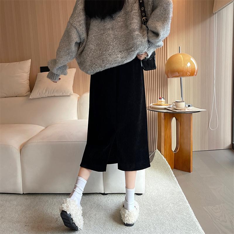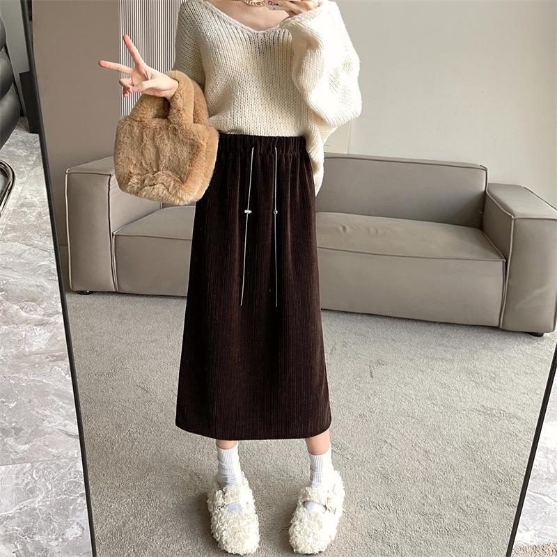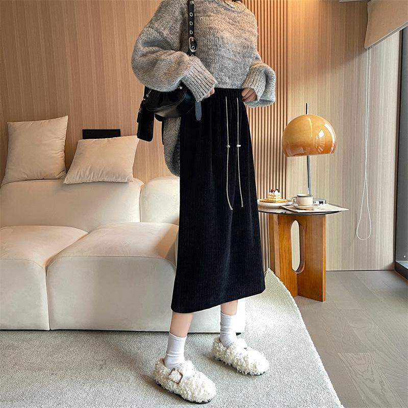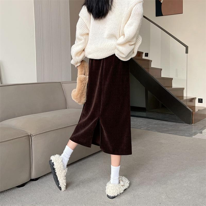 Falda Delgada de Pana para Mujer Diseño de Primavera y Otoño Cadena Abertura Estilo Coreano Cintura Alta Adelgazante Falda Midi