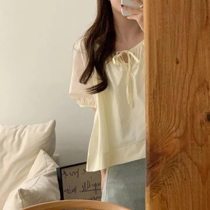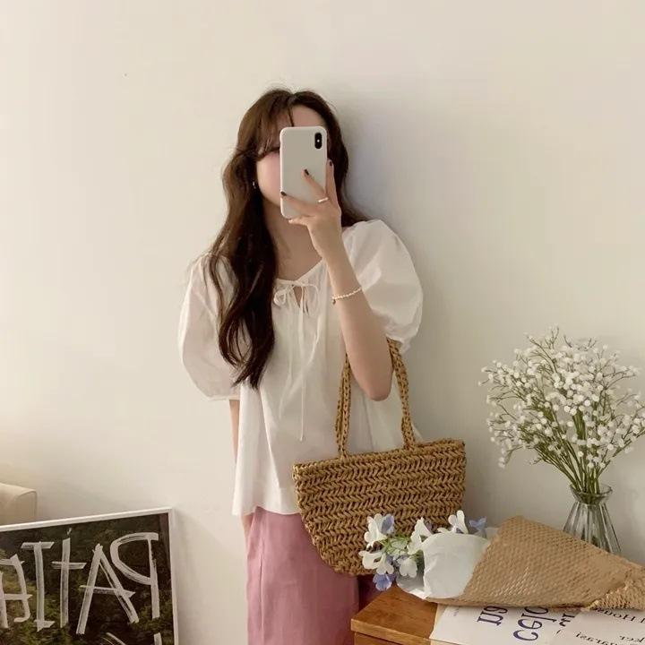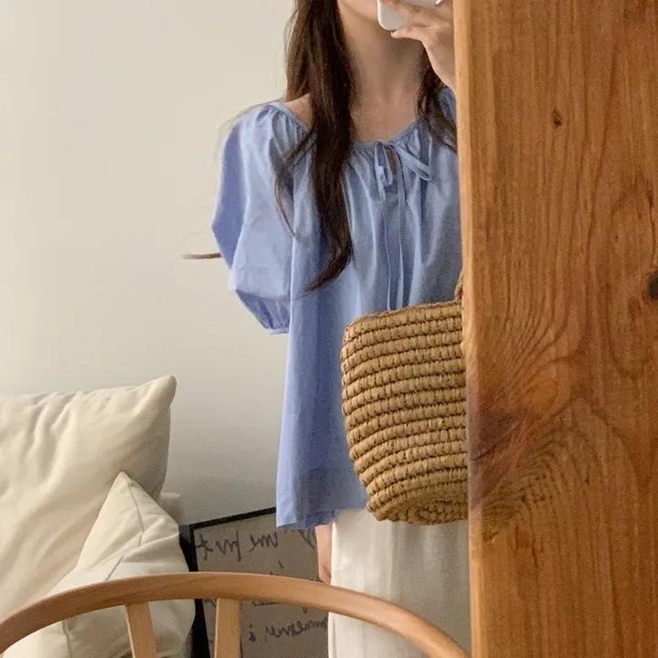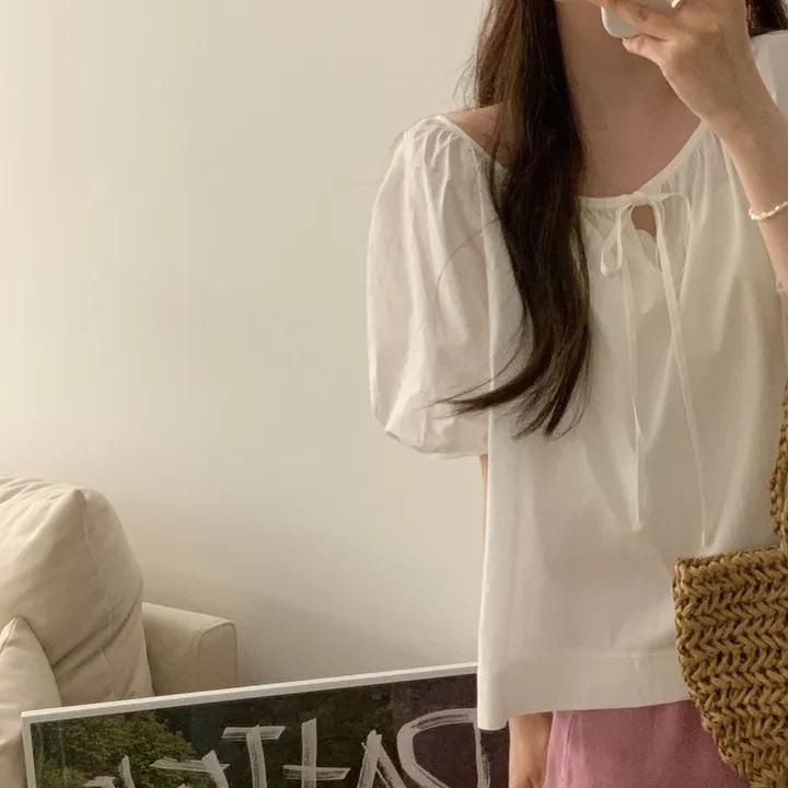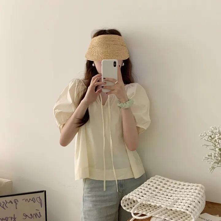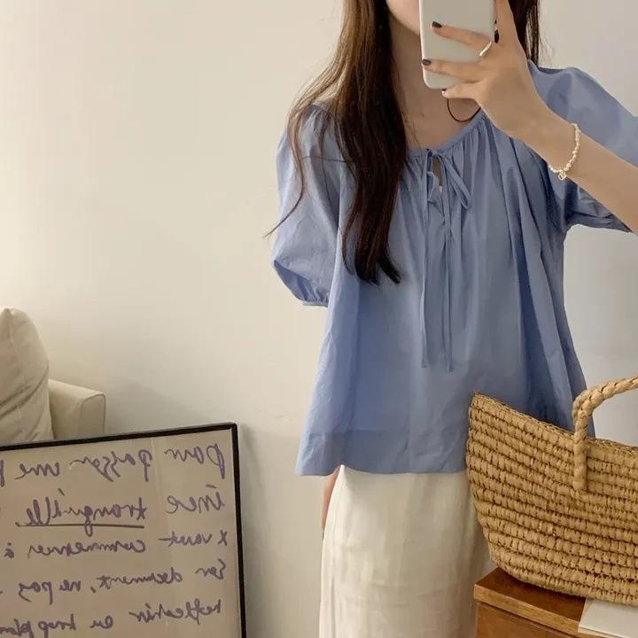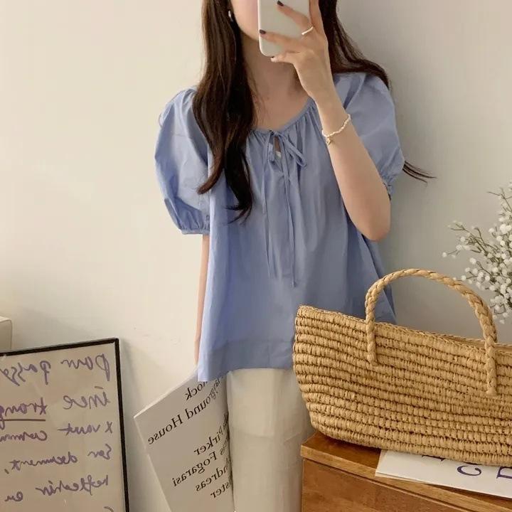 Camisa de estilo coreano, nueva llegada de verano 2024, estilo coreano, sencilla, dulce, con cordones, mangas abullonadas, combinable.