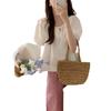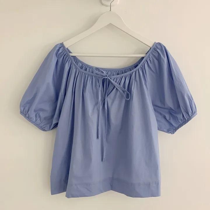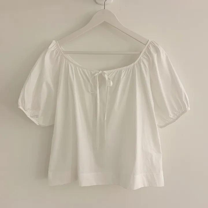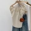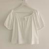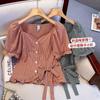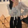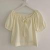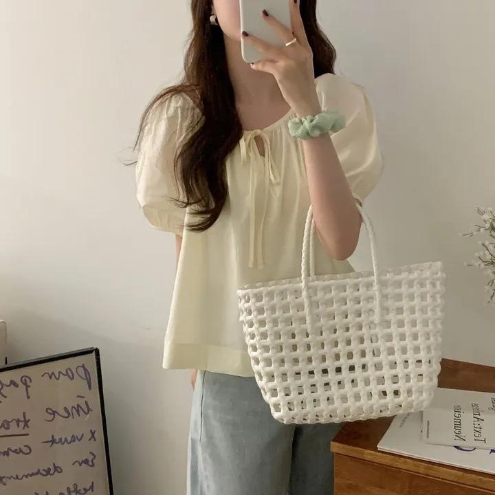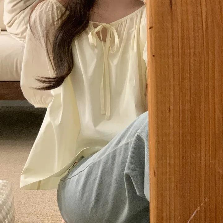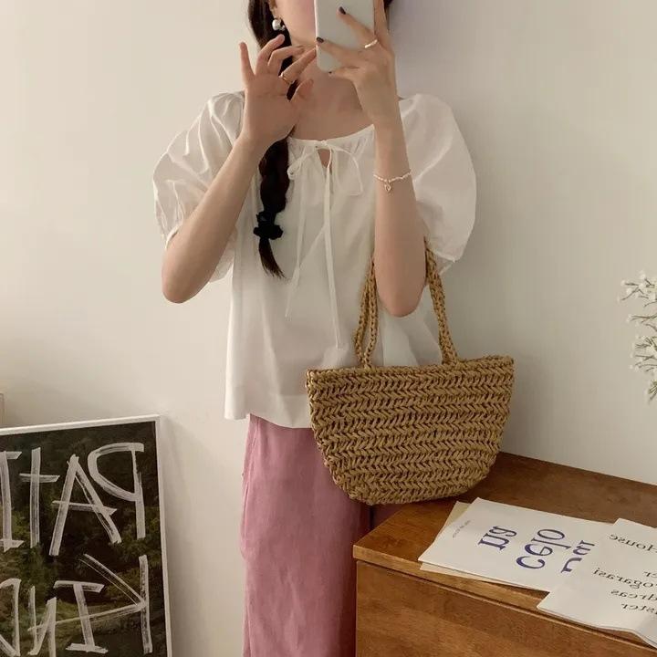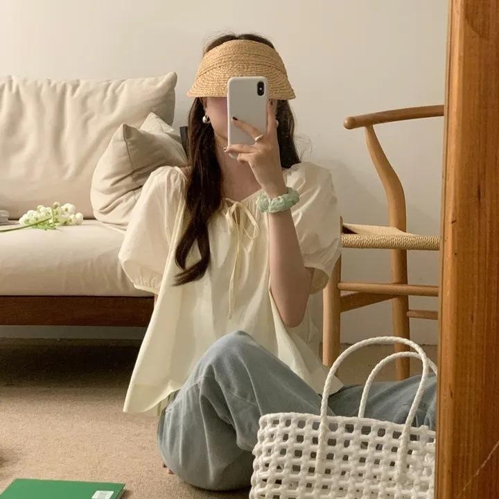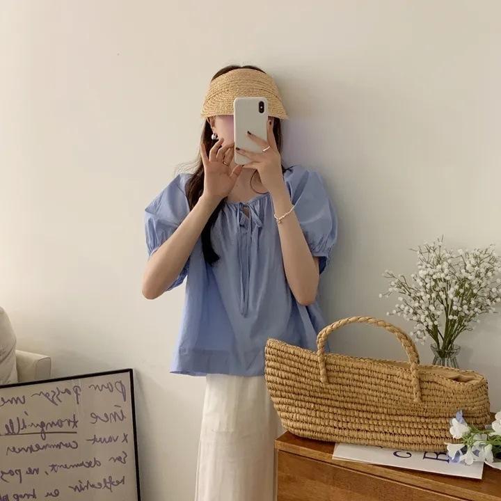 Camisa de estilo coreano, nueva llegada de verano 2024, estilo coreano, sencilla, dulce, con cordones, mangas abullonadas, combinable.